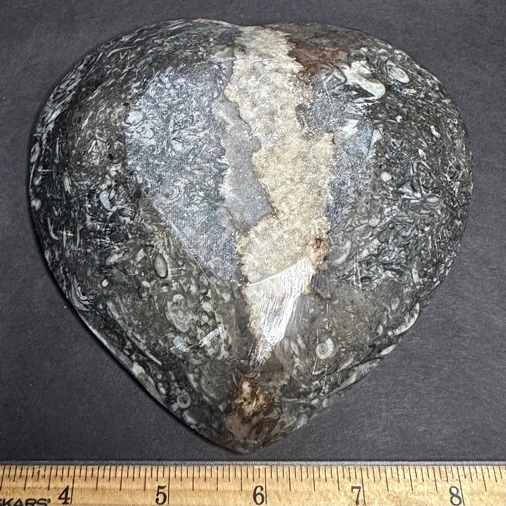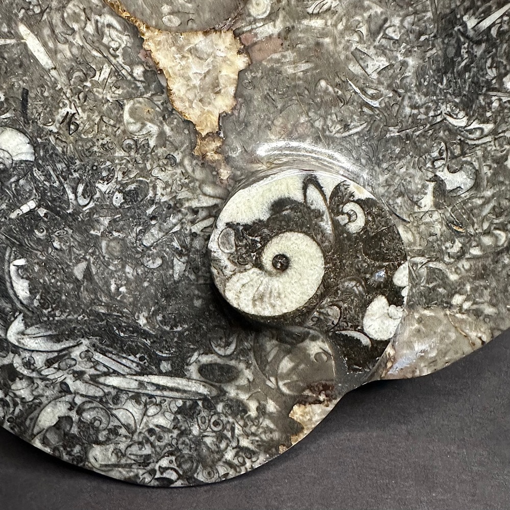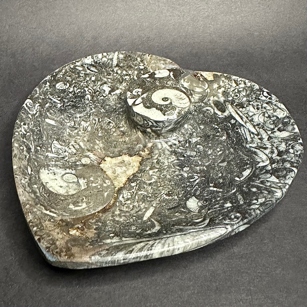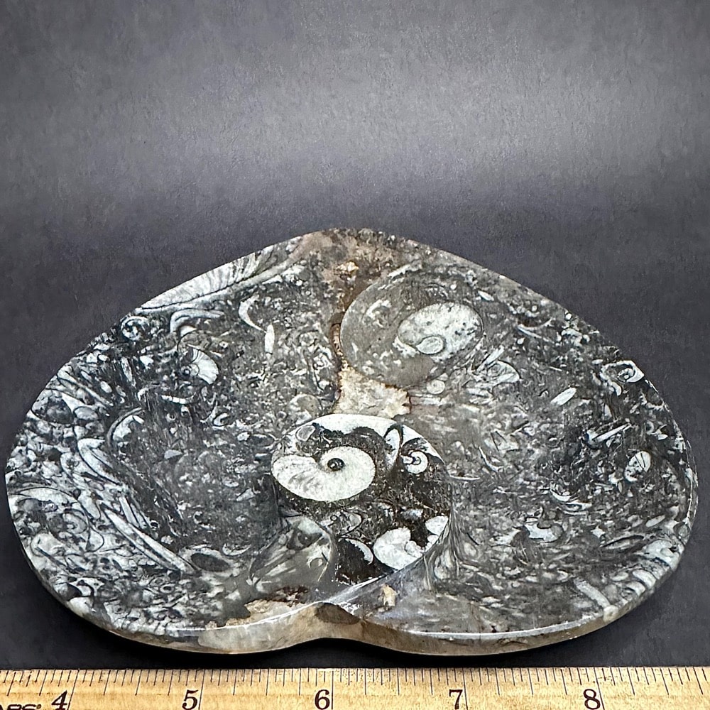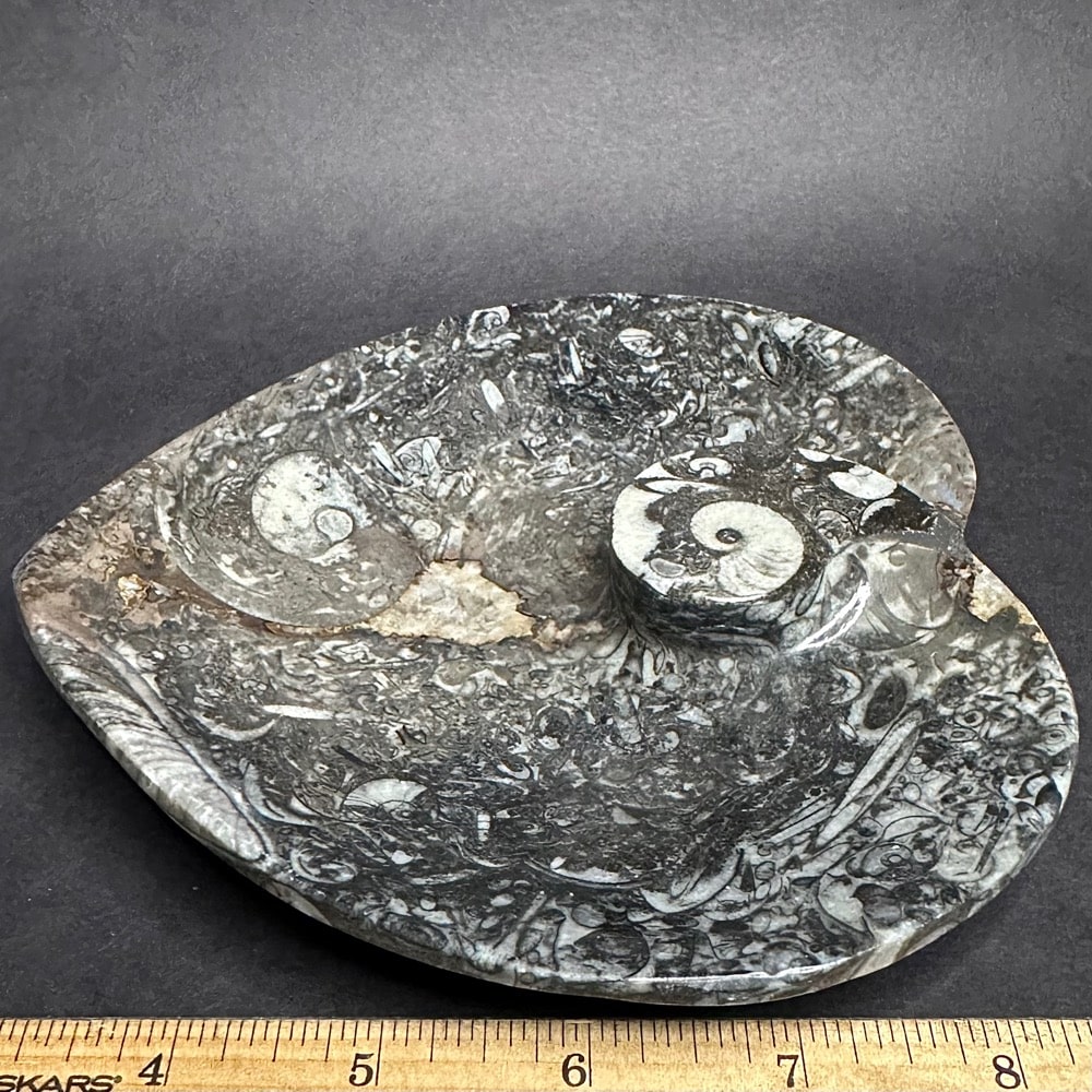 Appearance: It has very well preserved Geisonoceras  fossils with lots of visible fossils on the balance of the heart shaped dish.