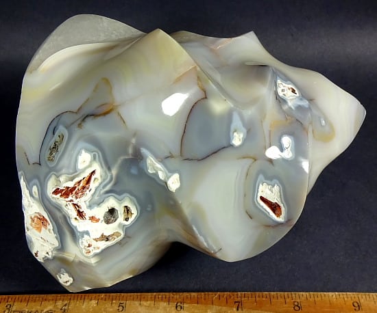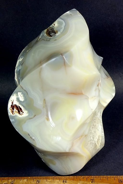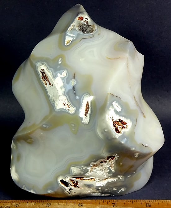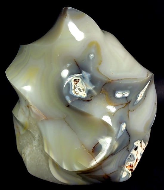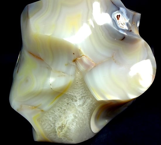 Agates mostly occur as nodules in volcanic rocks or waters containing silica in solution possibly derived from the decomposition of silicates in the lava. The siliceous matter is deposited in regular layers resulting in the banded or striped formation.