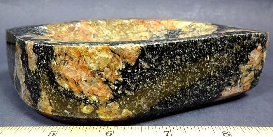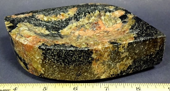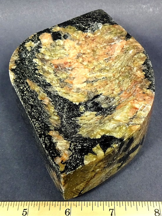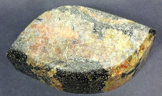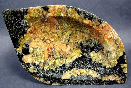Labradorite is a Feldspar mineral that occurs in large Crystal masses in anorthosite and shows an iridescence or “play of colors.” Gemstone varieties of Labradorite exhibiting a high degree of iridescence are Spectrolite, Moonstone and Sunstone. High quality samples with good iridescent qualities are desired for jewelry.