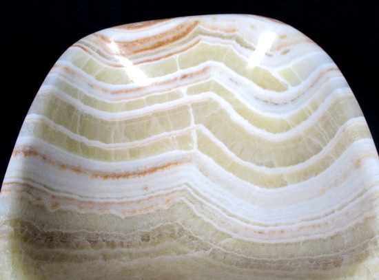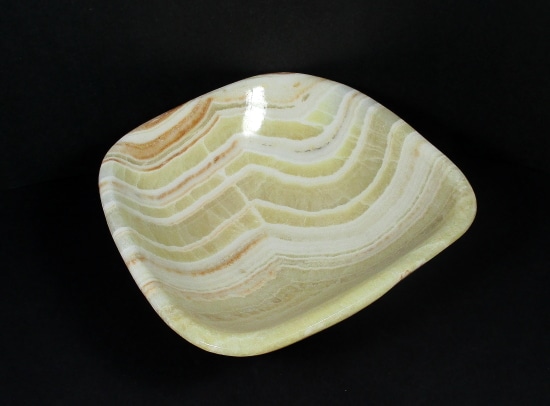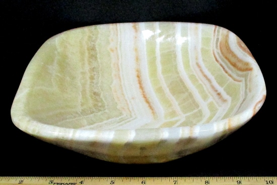 Here’s a lovely decorative dish carved from Aragonite. This dish has striking color and fabulous design. It measures 7 1/2″ x 7 5/8″ x 2 3/4″ tall and has a good polish. A wonderful natural work of art!