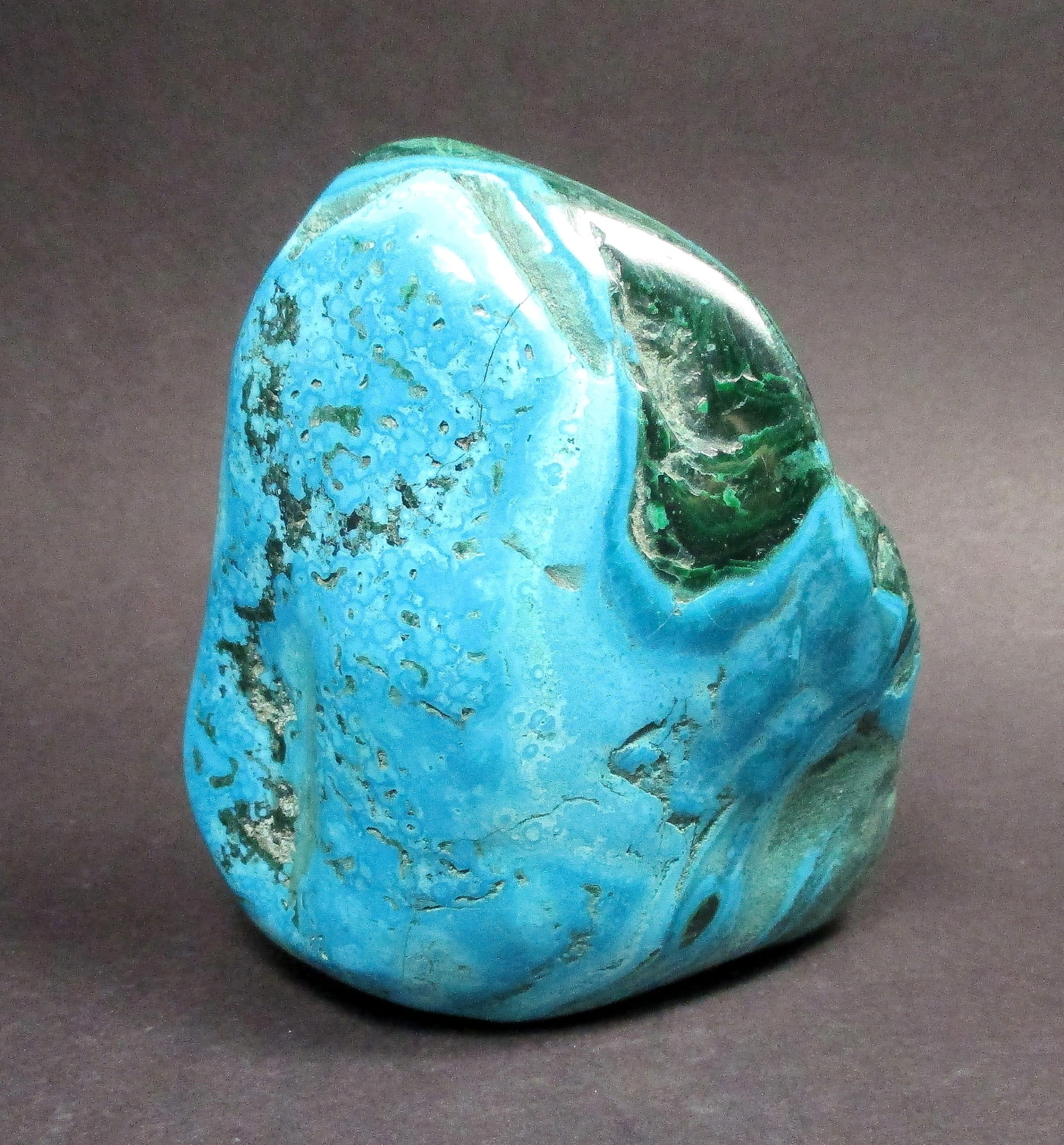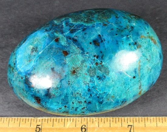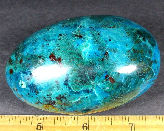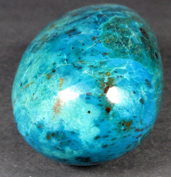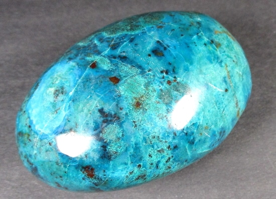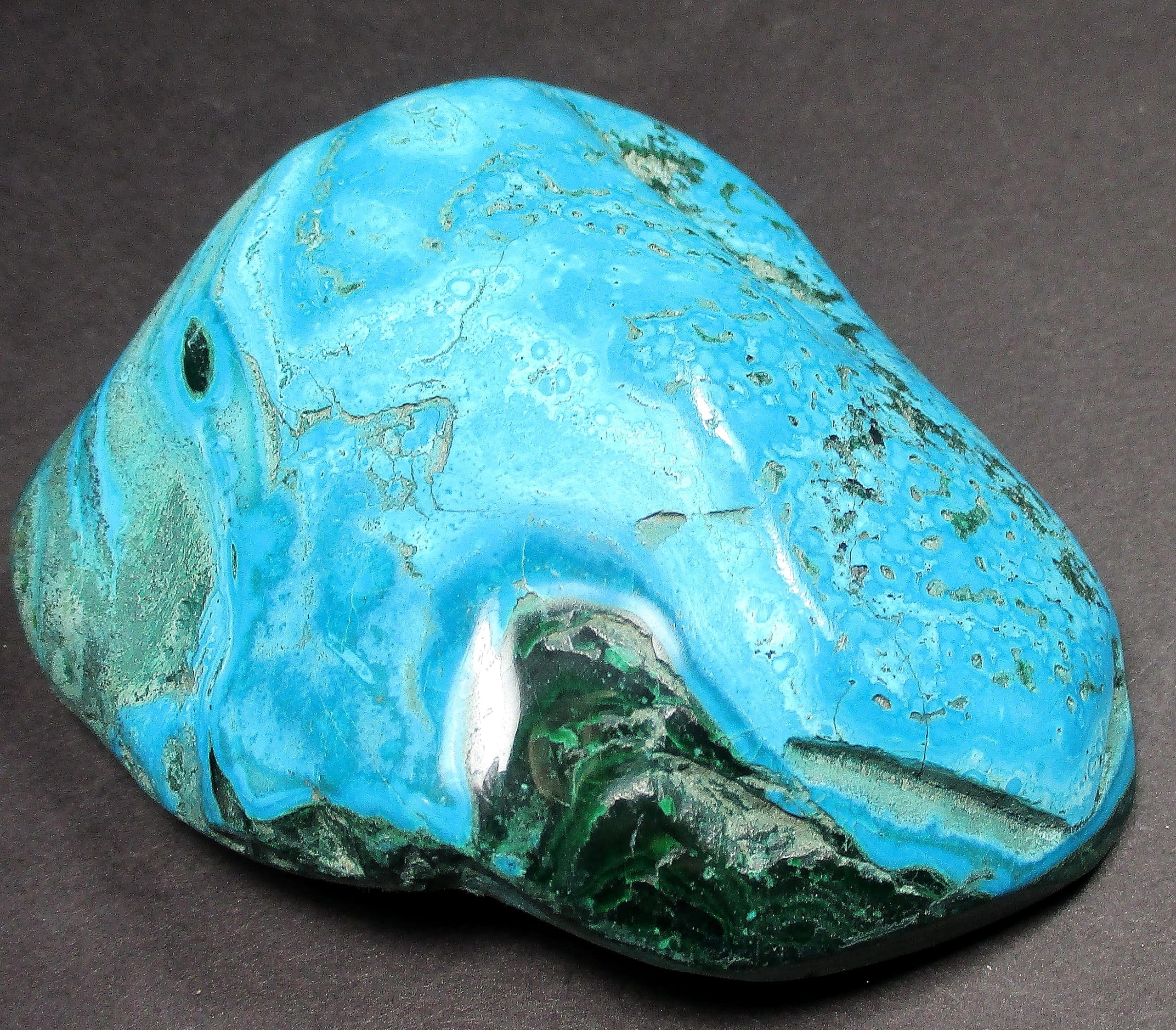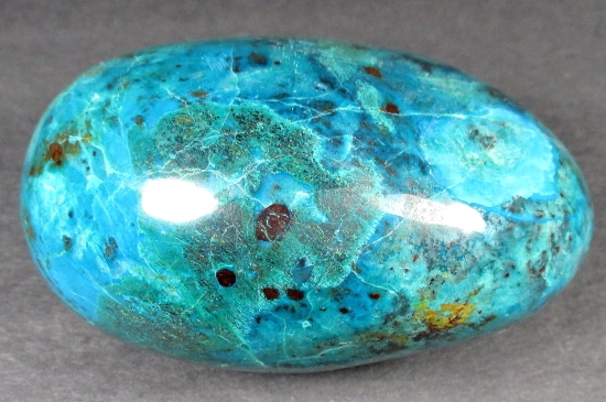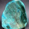 Chrysocolla is of secondary origin and forms in the oxidation zones of copper ore. Some associated minerals are Quartz, Limonite, Azurite, and Malachite and Chrysocolla is often confused with Turquoise as they are similar in color. It gets it’s name from Greek chrysos “gold” and kolla “glue”. It is known among Native American cultures as a healing stone and said to promote calm and level headedness.