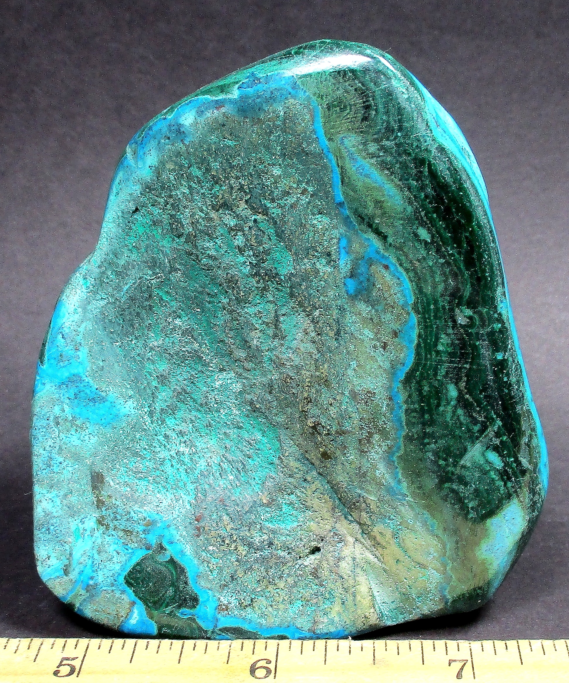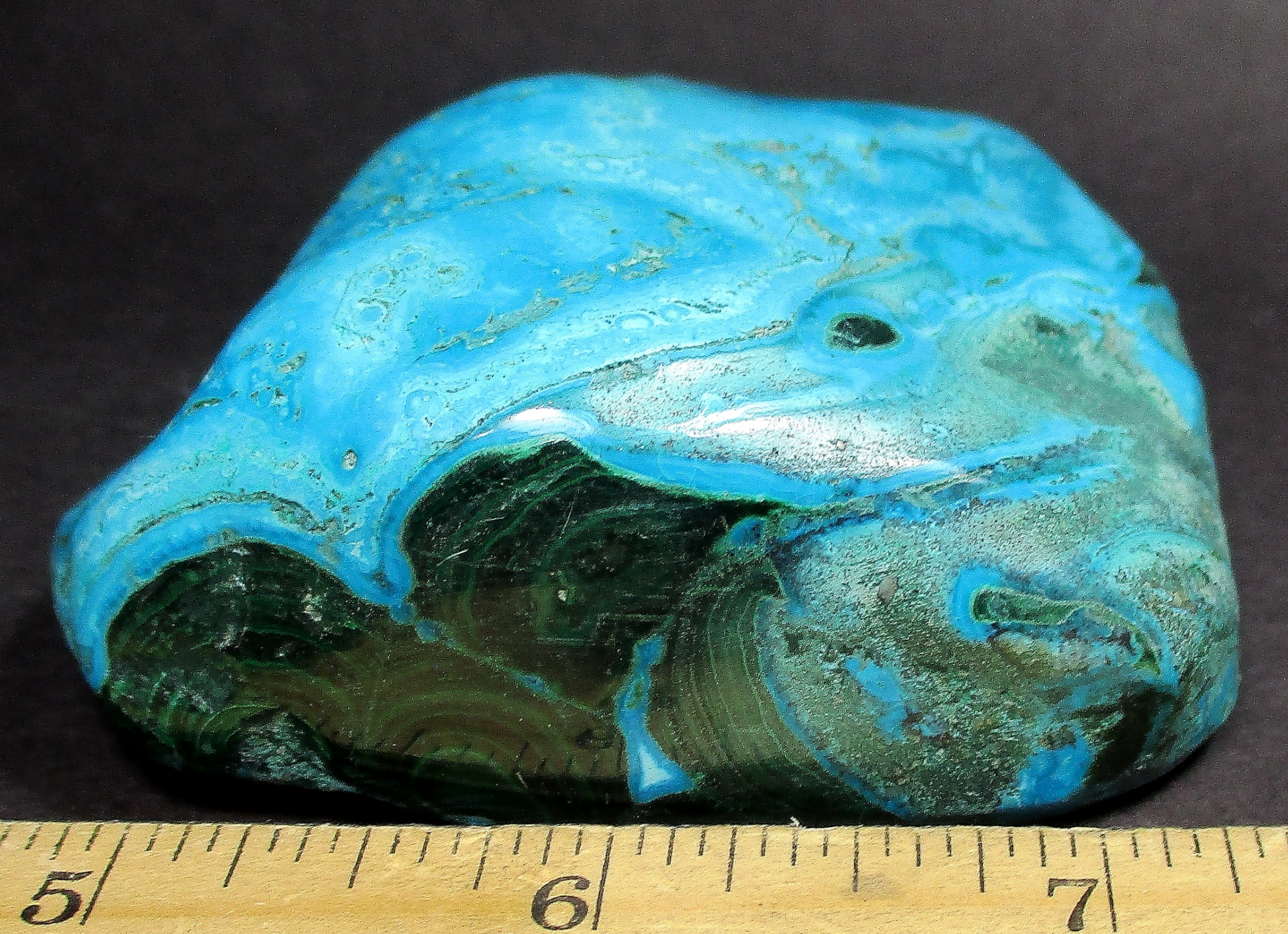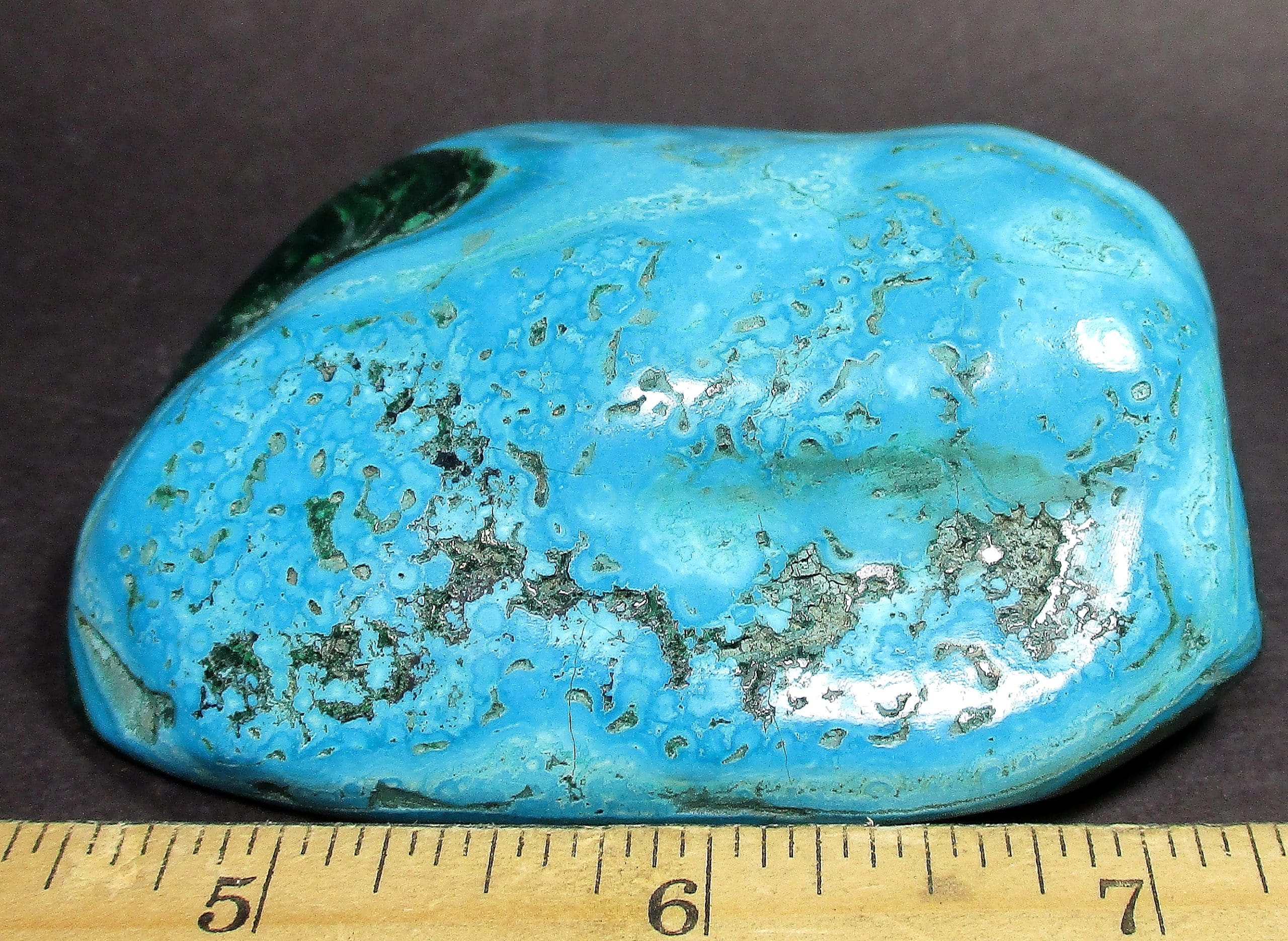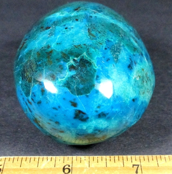 Chrysocolla is of secondary origin and forms in the oxidation zones of copper ore. Some associated minerals are Quartz, Limonite, Azurite, and Malachite and Chrysocolla is often confused with Turquoise as they are similar in color. It gets it’s name from Greek chrysos “gold” and kolla “glue”. It is known among Native American cultures as a healing stone and said to promote calm and level headedness.