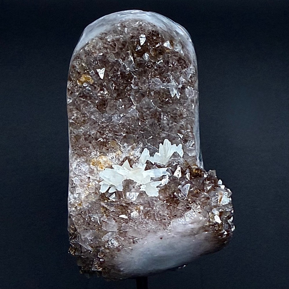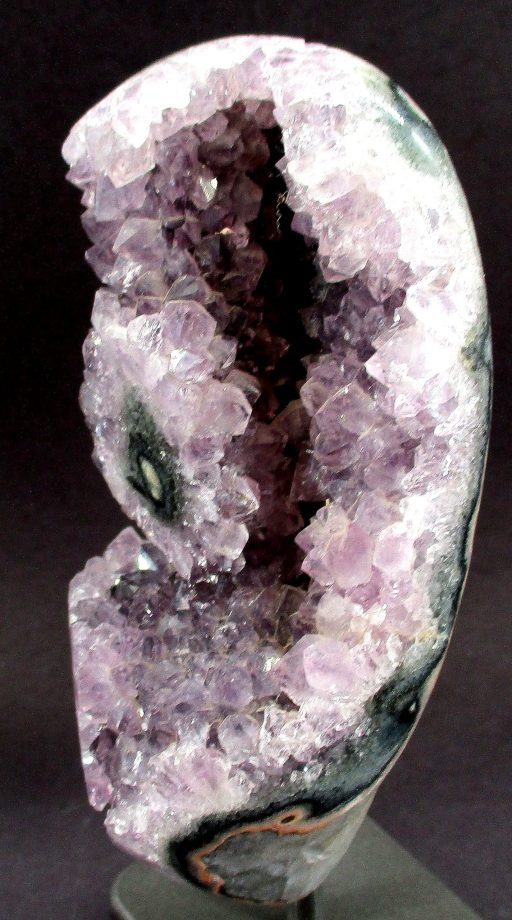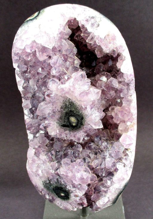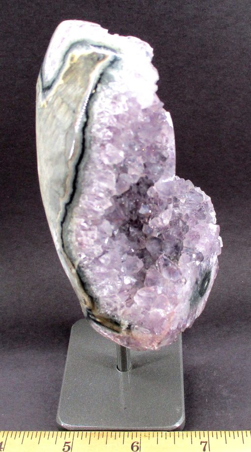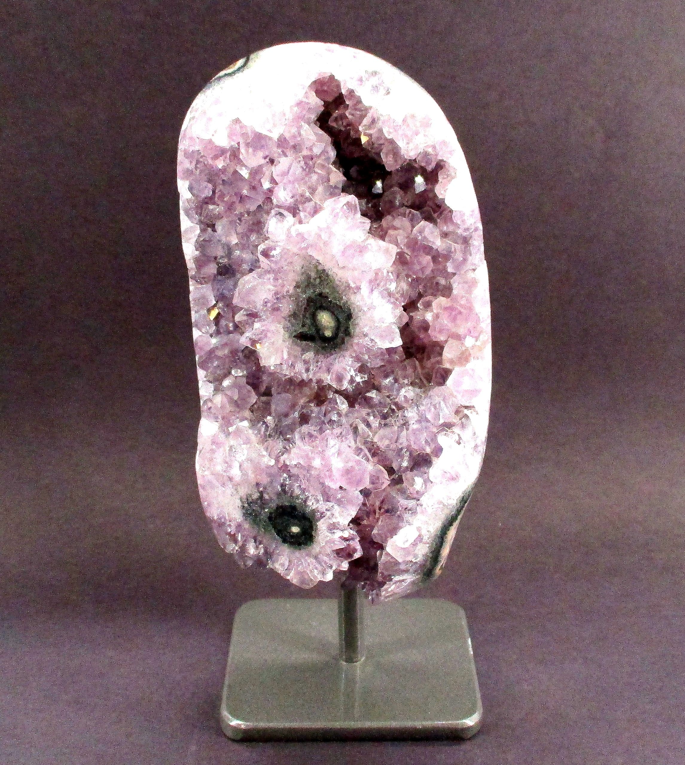 Amethyst is a purple variety of Quartz often used as an ornament. It occurs in color from a light, slightly pinkish violet to a deep grape purple. Upon exposure to heat, Amethyst generally becomes yellow, which some refer to as Citrine or “burnt” Amethyst. It is widely distributed as a mineral, but fine, clear specimens that are suitable for cutting as ornamental stones.