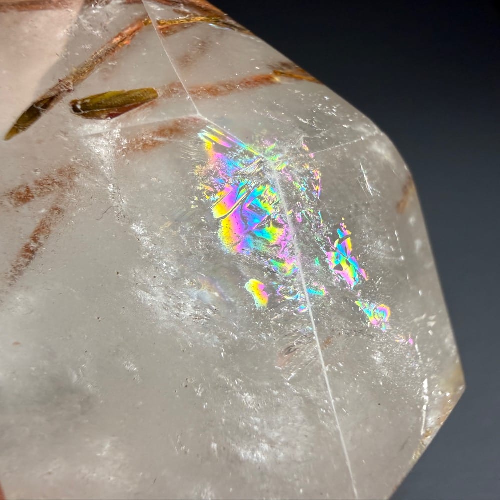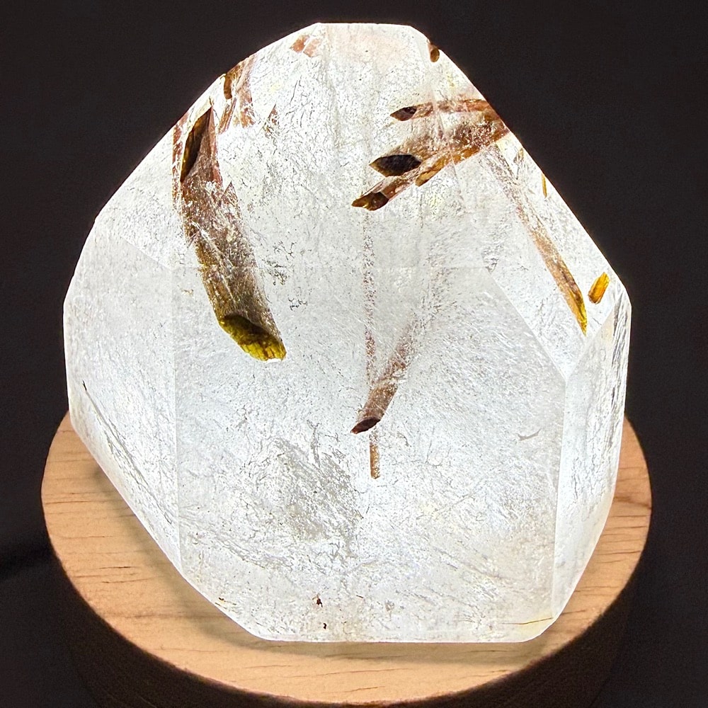 Appearance: This is an exceptional Rutilated Quartz Crystal larger with golden Rutiles and brilliant “rainbow” reflections.  Like most Quartz, this specimen is better in person than the pictures shown.