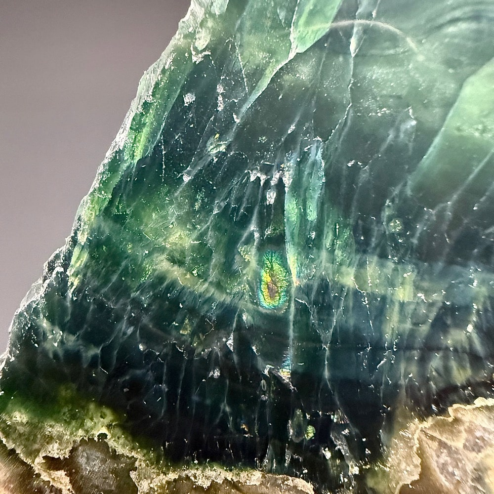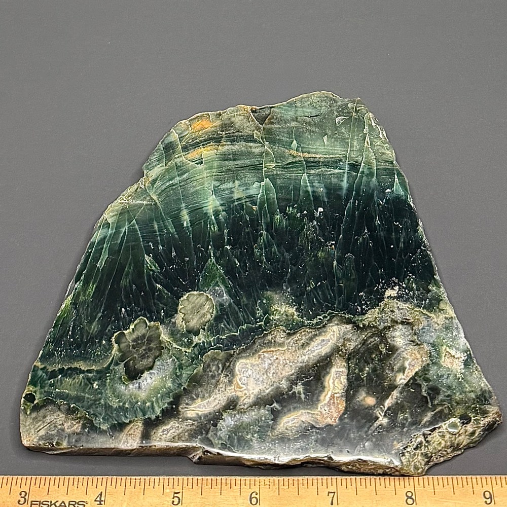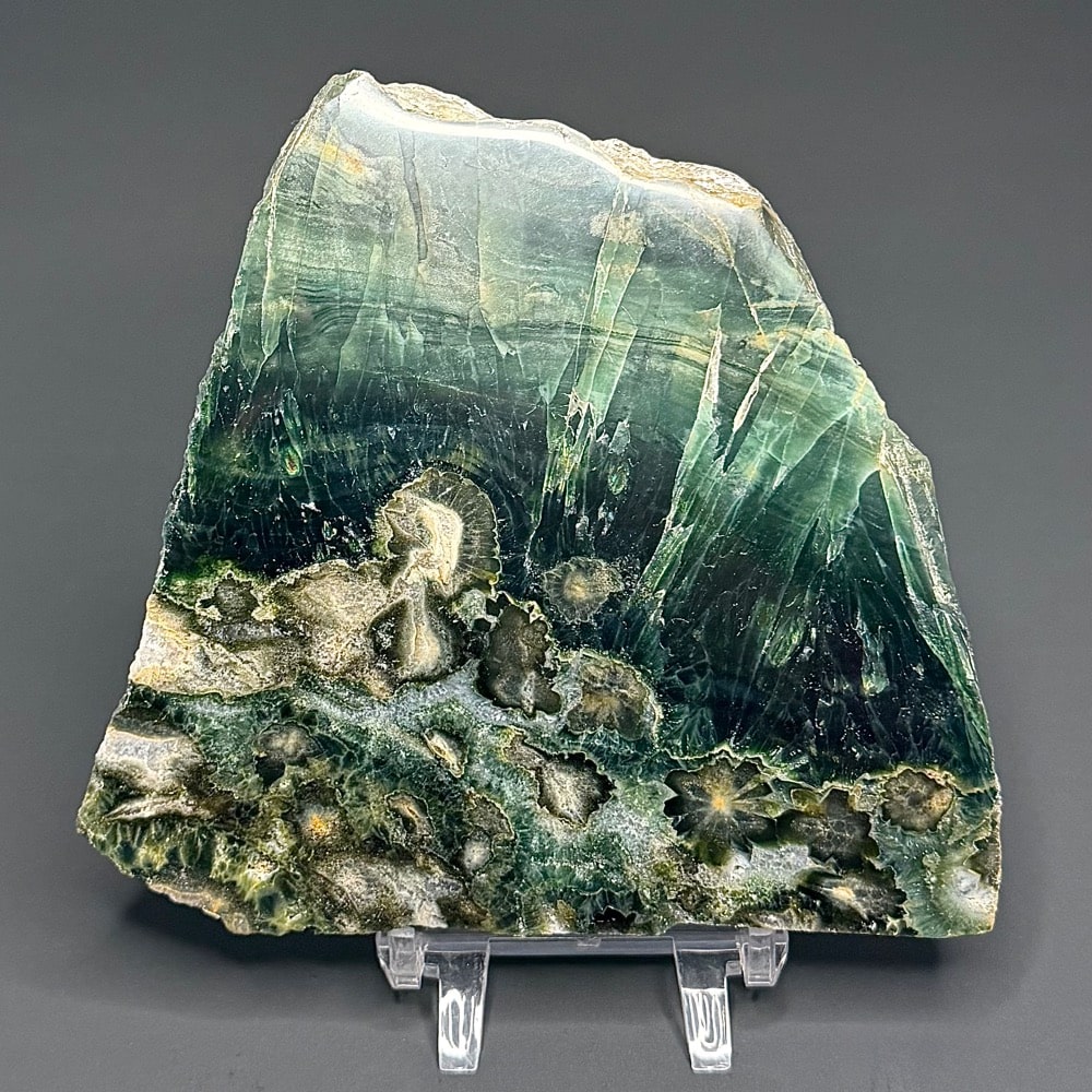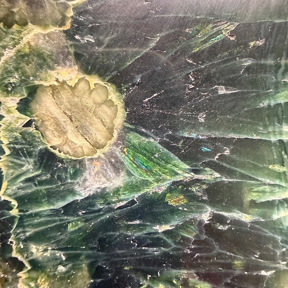 Appearance: It has a fabulous color, subtle “rainbow” reflections, lots of “eyes” and another great creation form our Lapidary Department.