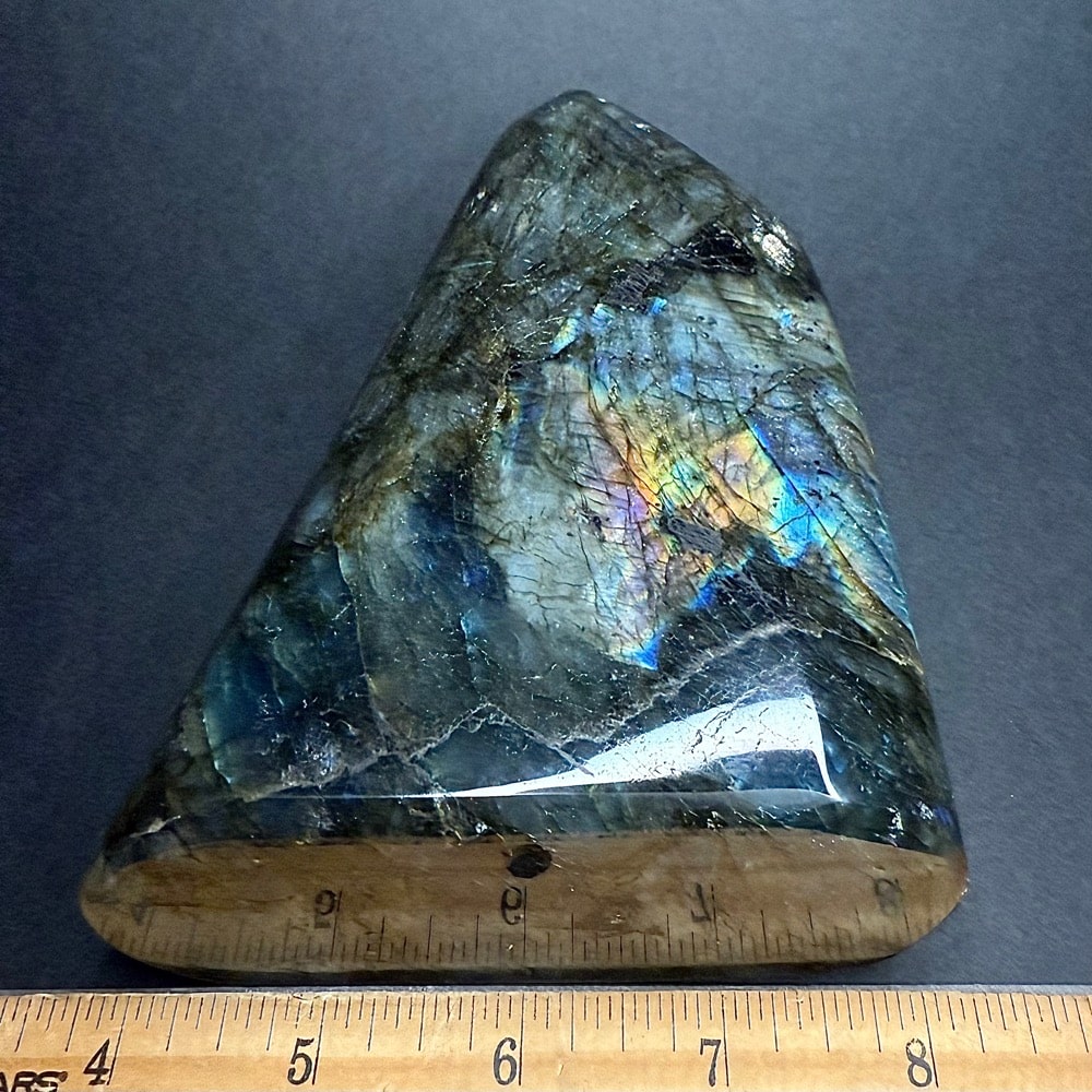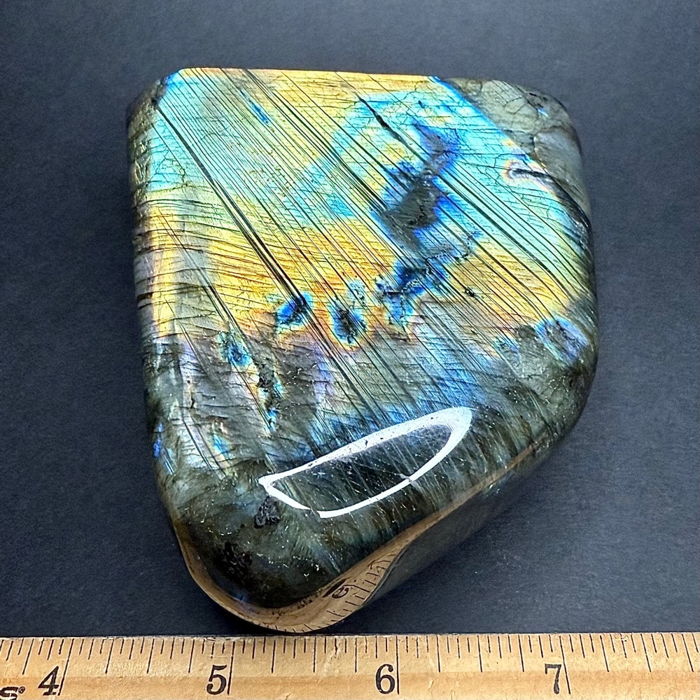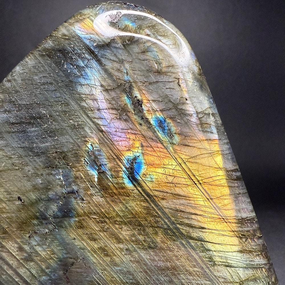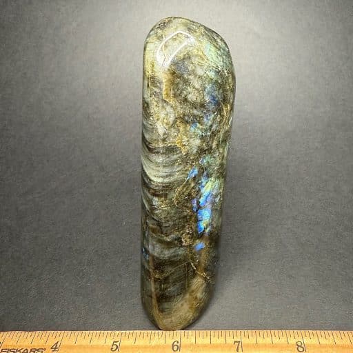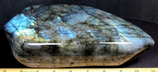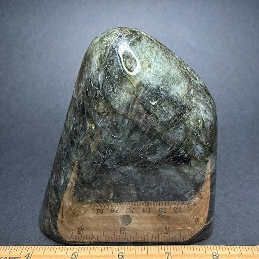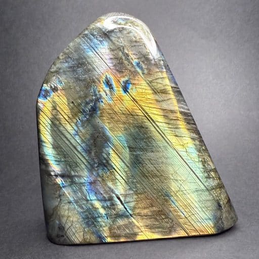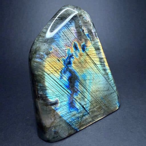 Labradorite is a Feldspar mineral that occurs in large Crystal masses in Anorthosite and shows an iridescence or “play of colors.” Gemstone varieties of Labradorite exhibiting a high degree of iridescence are Spectrolite, Moonstone and Sunstone. High quality samples with good iridescent qualities are desired for jewelry.