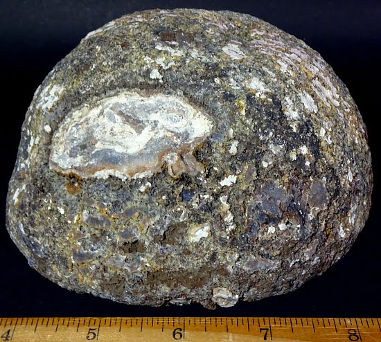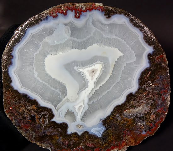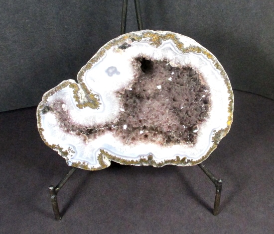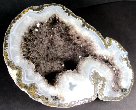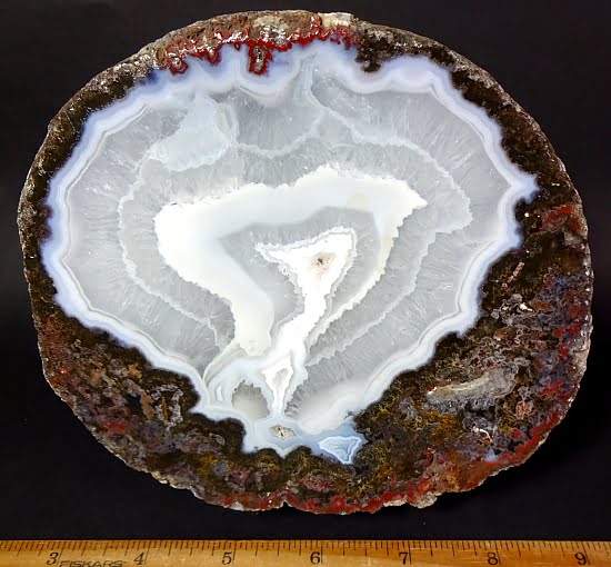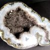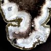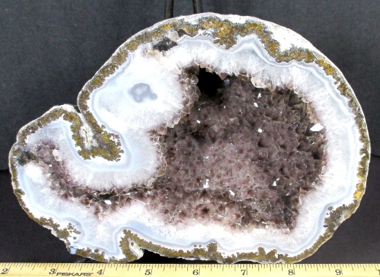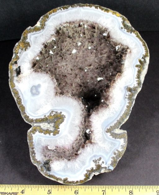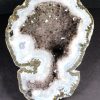 This is a very pretty Las Choyas or Mexican Coconut Geode and has been cut and nicely polished on the face here in our Lapidary Department.  This lovely geode has an appealing bluish grey around a gorgeous white Quartz Crystal center with a neat cavity.  It measures 7″ x 5 1/4″ x 2 1/2″ thick.  This very nice geode is from Chihuahua, Mexico. Very nice!