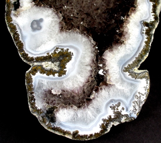 Geodes are geological rock formations which occur in sedimentary and certain volcanic rocks.  They are essentially rock cavities or vugs with internal Crystal formations or concentric banding.  The exterior is generally Limestone while the interior contains Quartz Crystals and/or Chalcedony deposits.  If the Geode is completely filled with Crystal, being solid all the way through, it is then called a nodule.
