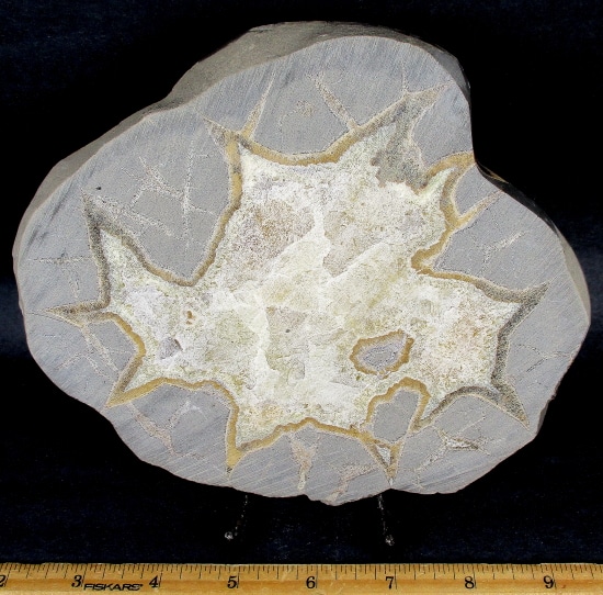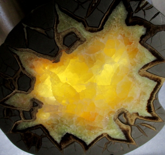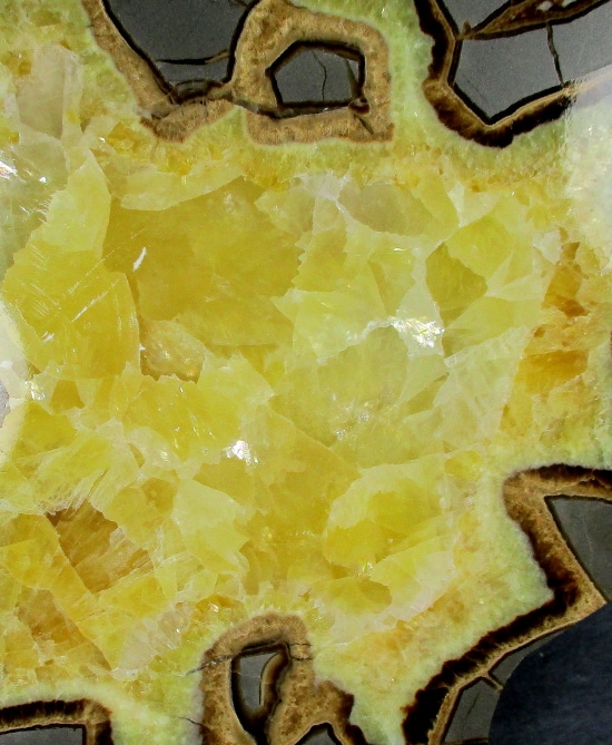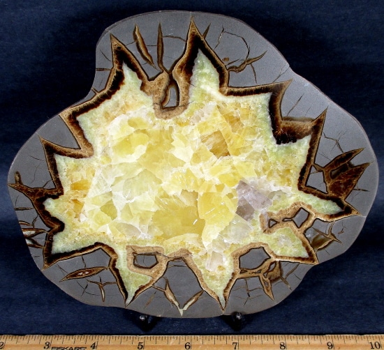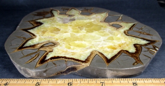 Septarians are commonly composed of a carbonate mineral such as Calcite, a microcrystalline form of Silica as in Flint or Jasper, or an Iron Oxide such as Hematite. These specimens are also known as a concretion which is a type of sedimentary rock. Septarians were formed millions of years ago by sediment forming around a fossil to create a mud ball transforming the fossil into Calcite and Aragonite.
