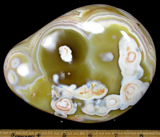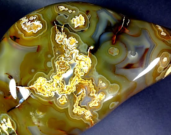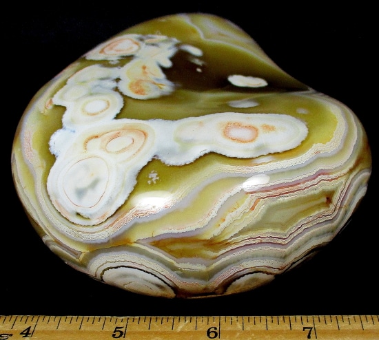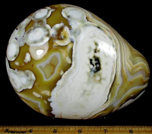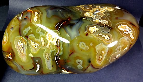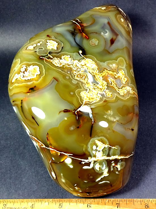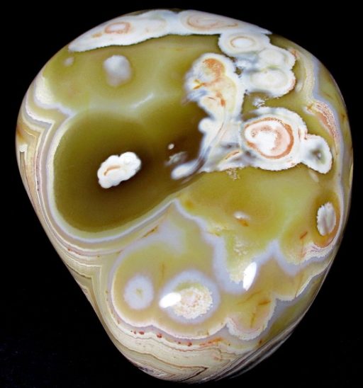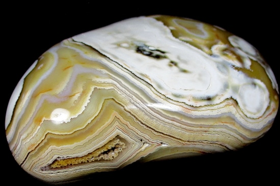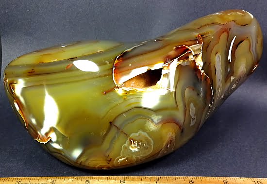 Here is an exceptional Carnelian carved into a free form from Madagascar.  It measures 5 1/4″ x 4 1/8″ x 2″, weighs over 2 1/2 pounds and has a nice polish.  It has a cool crystal cavity, awesome banding and a nice soft mix of colors including dark Cream, burnt Orange and dark Reds; all in a lovely design unique to Carnelian.  Close inspection shows some healed fractures, common for Carnelian.  This beautiful piece makes a nice display and would make an excellent gift.