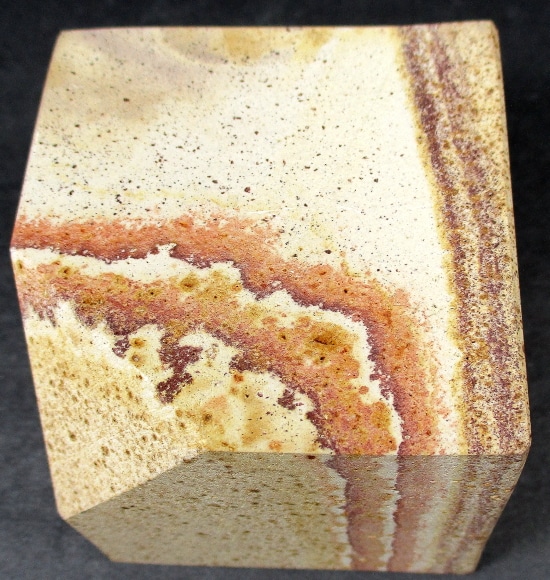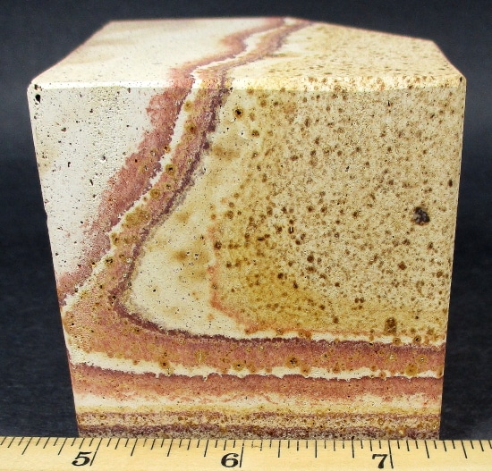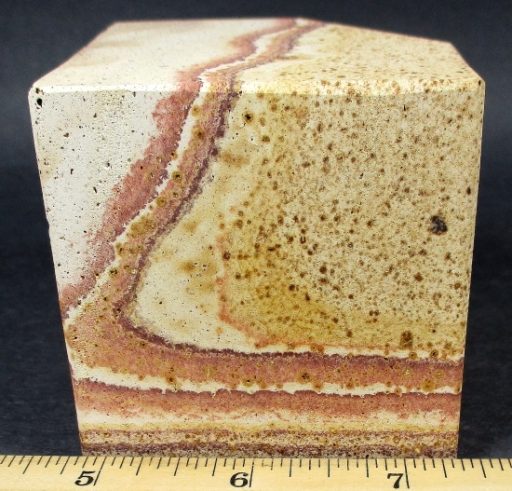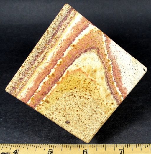 Rhyolite is an igneous, volcanic rock that is composed of Felsic, or Silicate minerals such as Silica, Aluminum, Sodium and Potassium. This material, also called Volcanic Tuft and Rainbow Rock actually began as volcanic ash spewed from the mouth of a volcano millions of years ago. This ash was exposed to heat and pressure that resulted in turning it to stone. The bright banded colors are a result of exposure to high concentrations of iron oxides. The material is similar to that of Granite, Pumice and Obsidian but due to the cooling process when formed, Rhyolite did not form any crystals, thus changing the texture of the material.