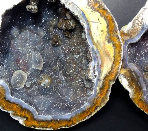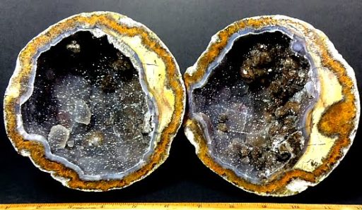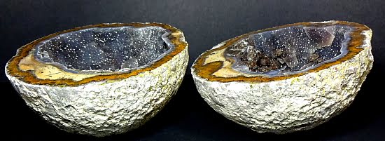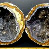 Geodes are geological rock formations which occur in sedimentary and certain volcanic rocks.  They are essentially rock cavities or vugs with internal Crystal formations or concentric banding.  The exterior is generally Limestone while the interior contains Quartz Crystals and/or Chalcedony deposits.  If the Geode is completely filled with Crystal, being solid all the way through, it is then called a nodule.