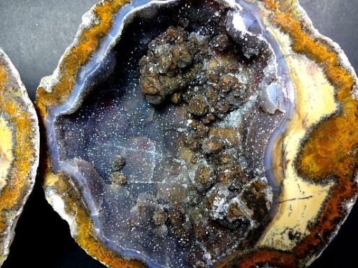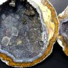 Here is a beautiful and unique example of a Las Choyas or Mexican Coconut Geode that has been cut and highly polished on the face right here in our Lapidary Department.  This exceptiopnal Geode has a nice bluish grey with good agate banding around a gorgeous Quartz Crystal center.  The incomparable geode measures 5 1/2″ x 2 3/4″ and 2 5/8″ thick and weighs nearly 5 pounds. This lovely geode set is from Chihuahua, Mexico.  Very, very nice!