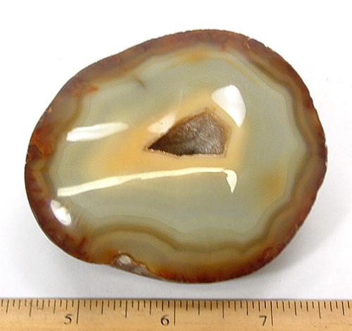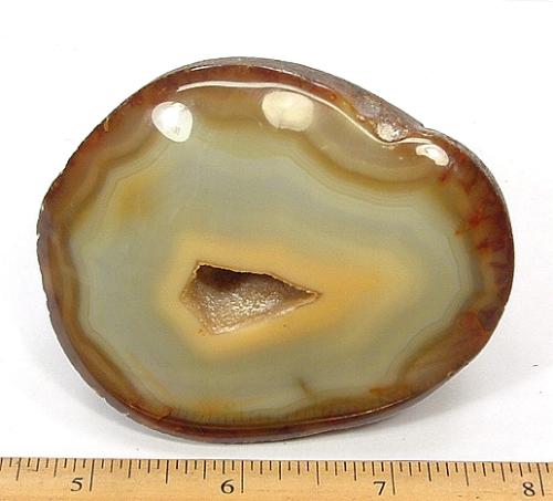 This is a very pretty, above average quality, multi-colored Brazilian Agate.  This cool specimen measures 3 1/8″ x 2 5/8″ x 1 3/4″ and has a nice polish on one side.  It has a great design, various beautiful Tan, Grey and Reddish Brown colors and a nice cavity that goes all the way through.  It makes for a very interesting display piece or would make a nice gift.