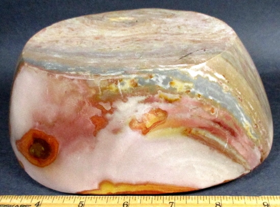 Jasper, or spotted stone, is an opaque, impure variety of Quartz that is usually red, yellow or brown in color.  Some Jaspers simultaneously exhibit several variants such as banding, flow patterns, dendrites or color variations.  This results in what appears to be scenes or images in a cut section of the Jasper.