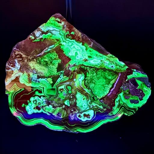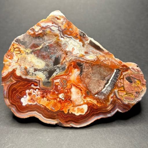 Appearance: This beauty has a unique design and appearance in the different colors and the excellent lace banding ranging from white and cream to various grays and red with different accents in the banding. Sparkling crystal cavity. It also will fluoresce green and blue under a SW/UV light. It is polished on the front face leaving the rest in its natural state.  Another great creation from our Lapidary Department.