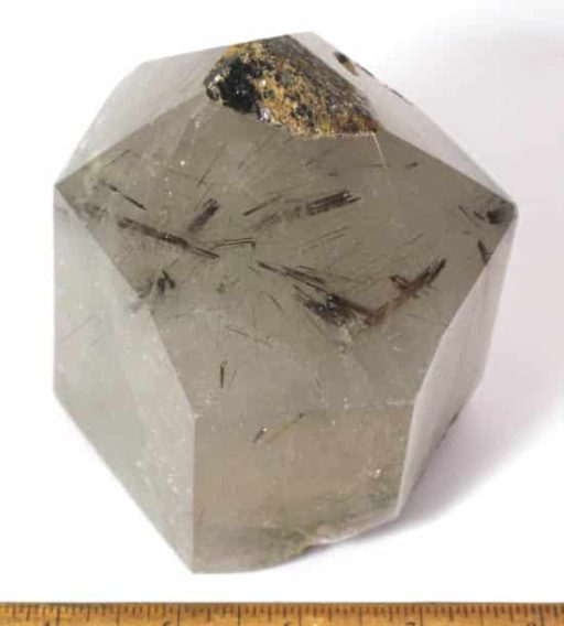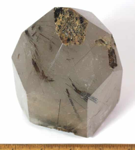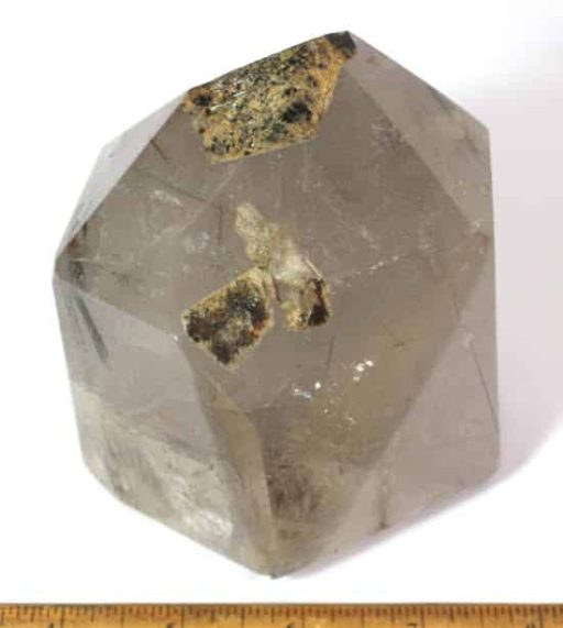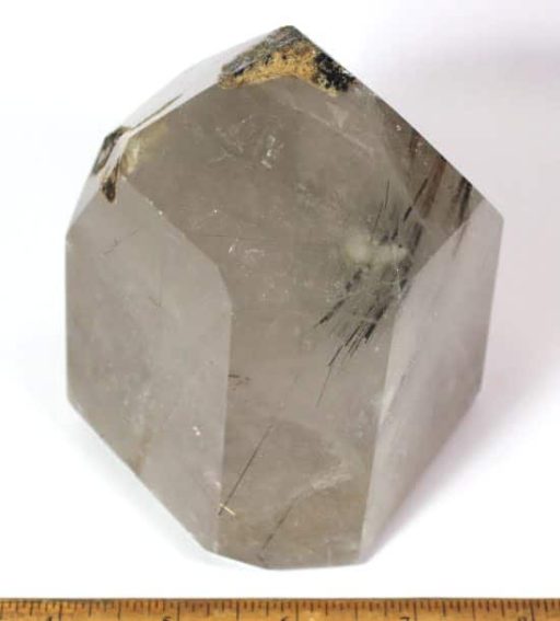 Here is awesome and nicely polished Smokey Quartz Crystal with Tourmaline and sparkly Rutiles and lots of character. This awesome Smokey Quartz Crystal has a beautiful shape with several dark Tourmaline and other inclusions that only add to it’s character.   This gorgeous beauty measures 3 1/4″ x almost 3 7/8″ x nearly 4 3/8″ tall and has a good appearance throughout the crystal.  It does have a couple very minor dings along the edges and tips that are reflected in our price.   Very, very nice!