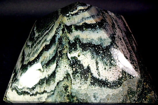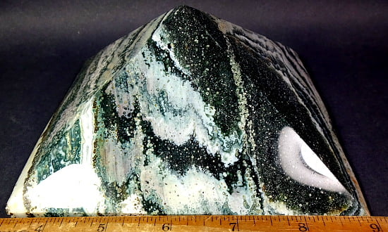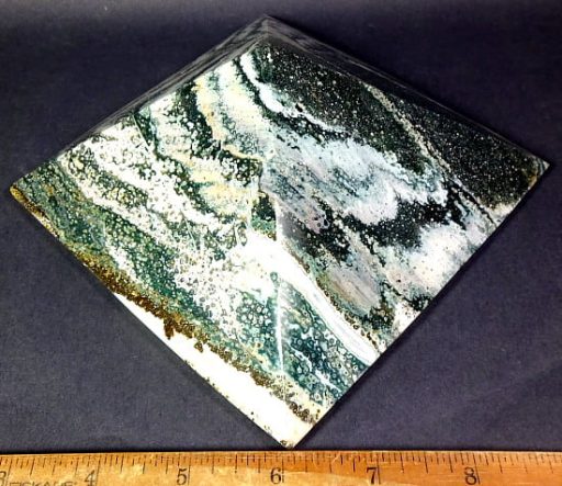 Here is a great addition to your office or home.  This is a beautiful Madagascar Jasper Pyramid.  It measures 5 3/4″square at the base x 3 3/4″ tall and is polished on all sides.  This specimen has a lovely color scheme of various  greens with lots of accents in an interesting design found only in Madagascar Jasper.  Definitely something different and very eye-catching for the polished rock collector.