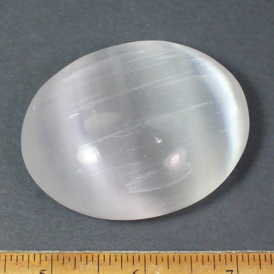 Selenite is a Crystalline variety of Gypsum.  It is often transparent and colorless.  If the Selenite Crystals show translucency, opacity and/or color, it is caused by the presence of other minerals and many be “druzy”.  Selenite often appears to have a “cat’s eye” appearance especially with the polished variety.  It will often magnify images when the translucency is very clear.