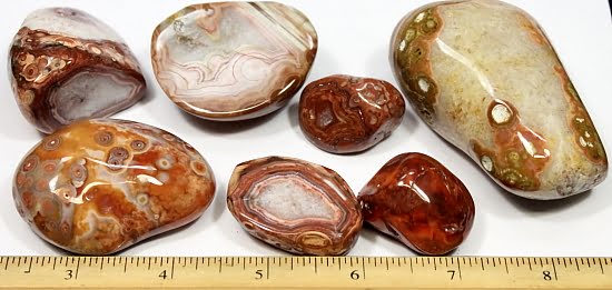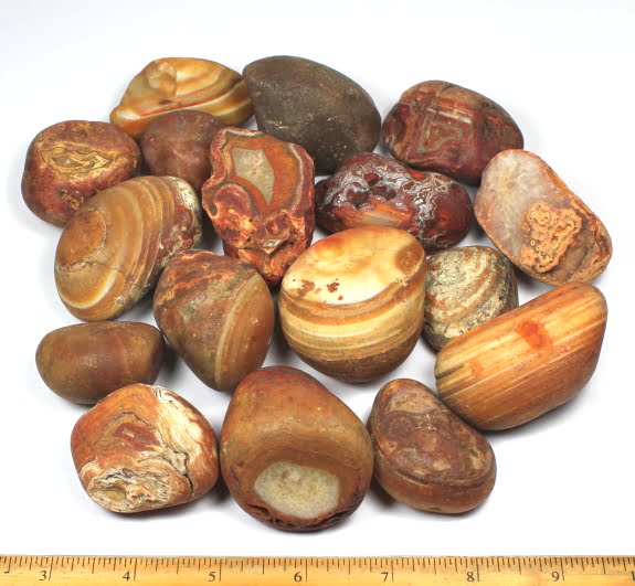 These are Bahia Agates from Bahia Brazil. While some are jasper nodules, others have beautiful agate lines and orbs as you can see in our photos. They are a very fun rock to tumble, even the ugliest nodule can tumble into a beautiful stone or cut to expose its internal pattern.
