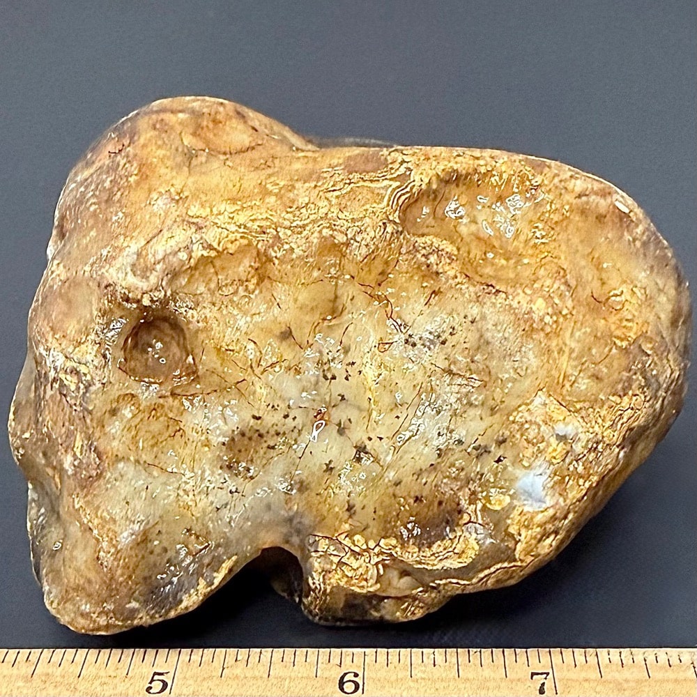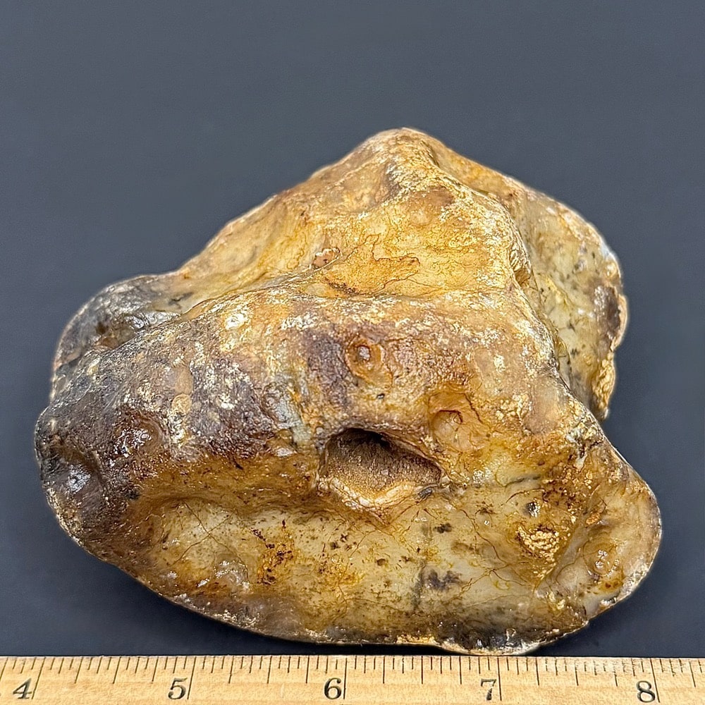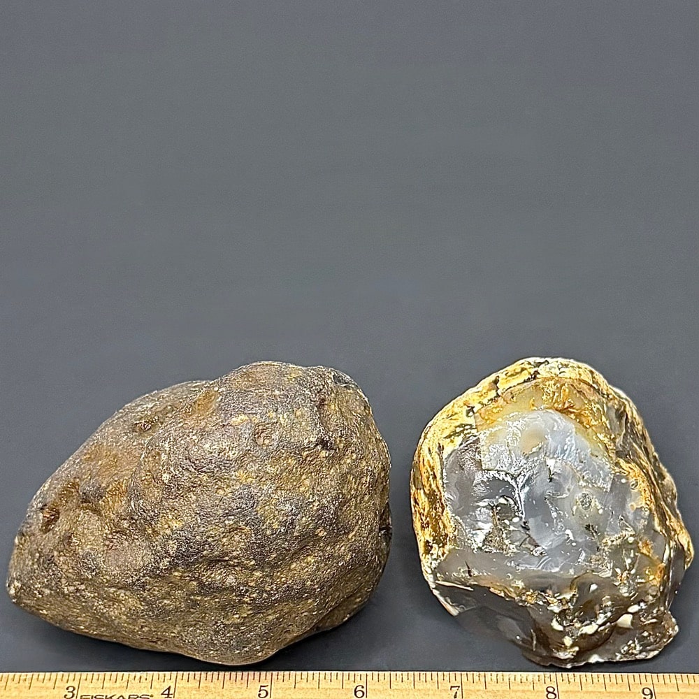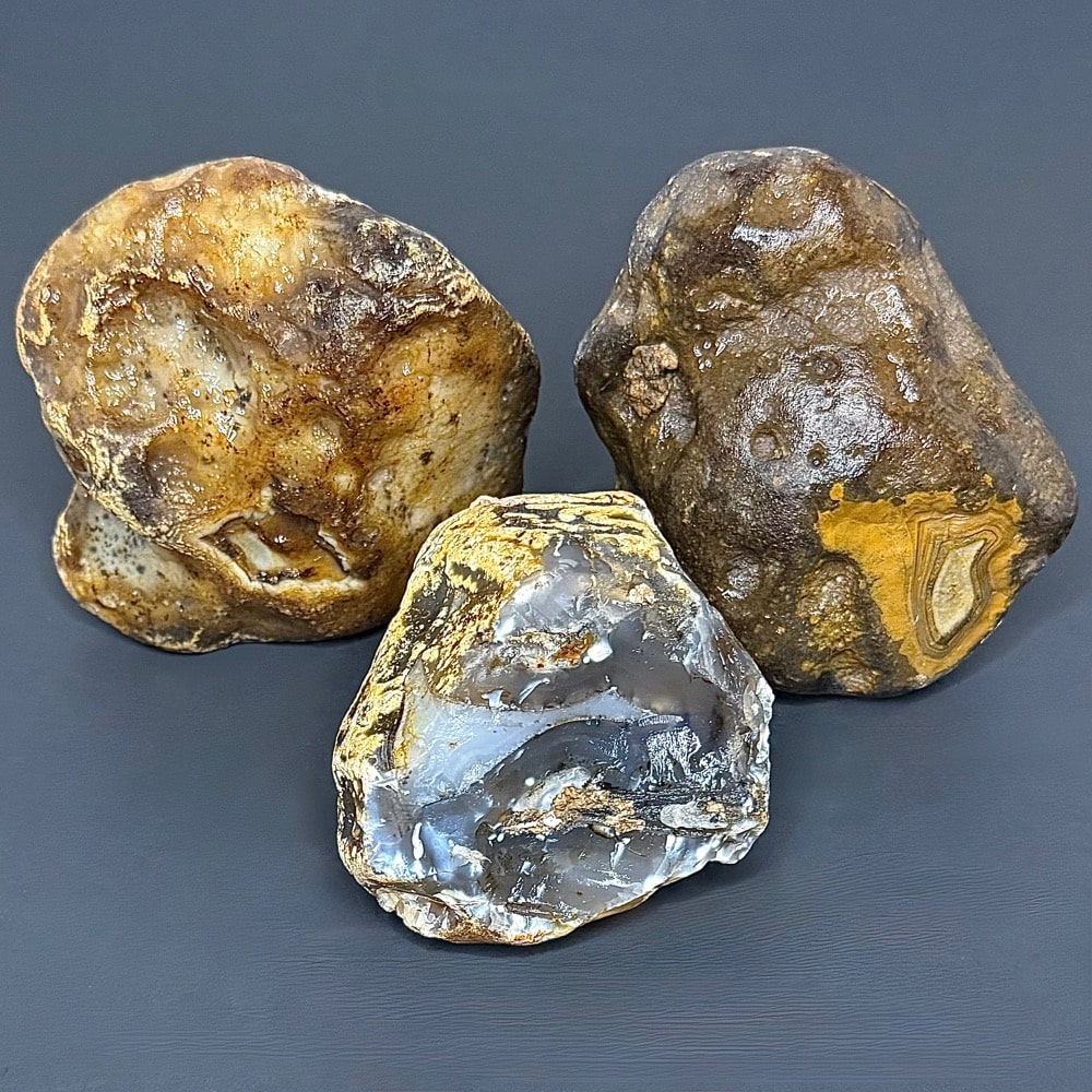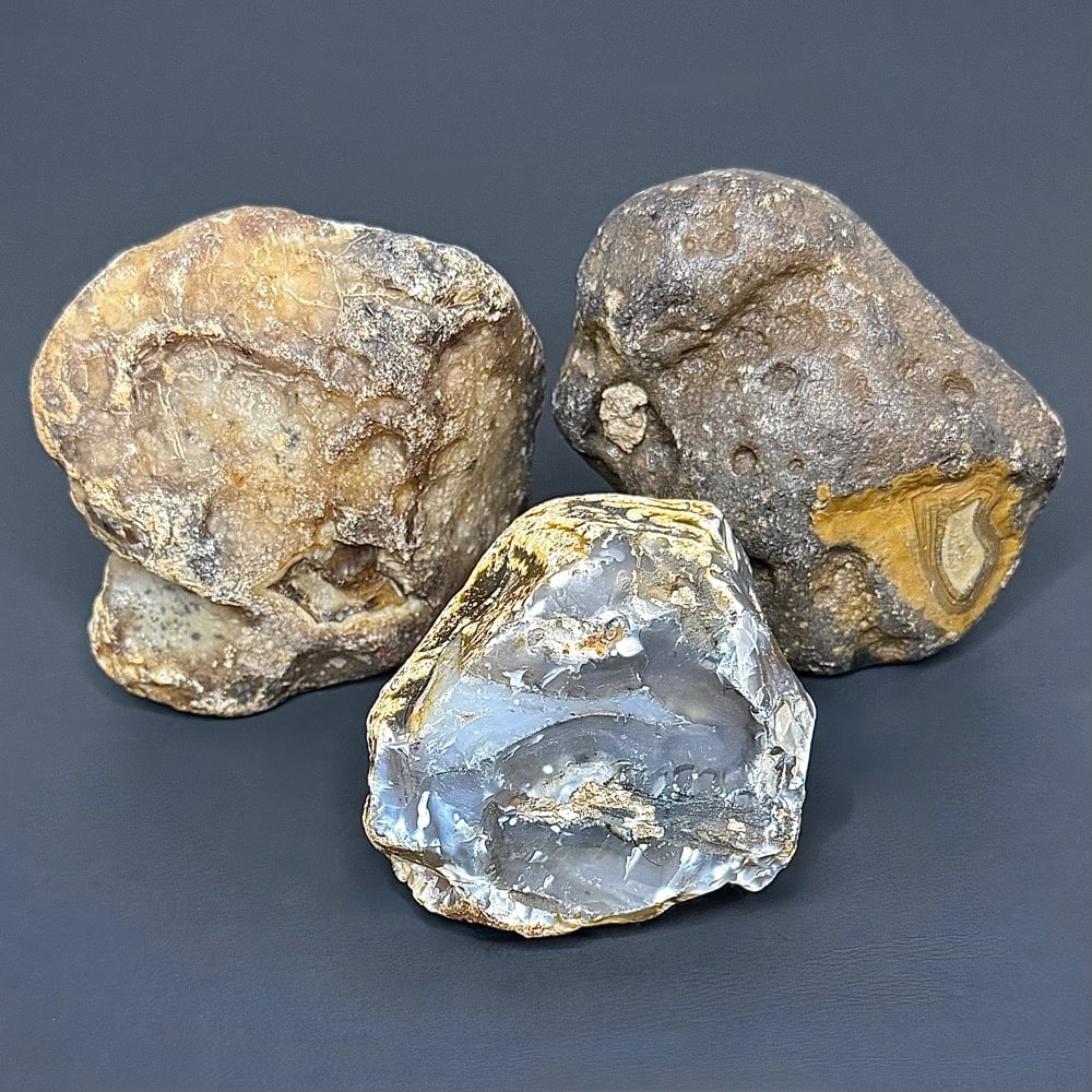 Agates mostly occur as nodules in volcanic rocks or waters containing silica in solution possibly derived from the decomposition of silicates in the lava. The siliceous matter is deposited in regular layers resulting in the banded or striped formation.