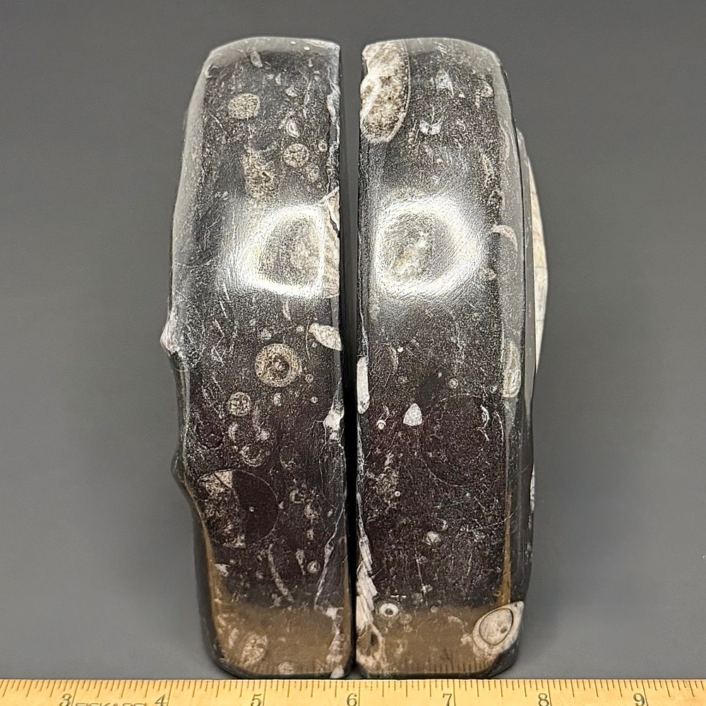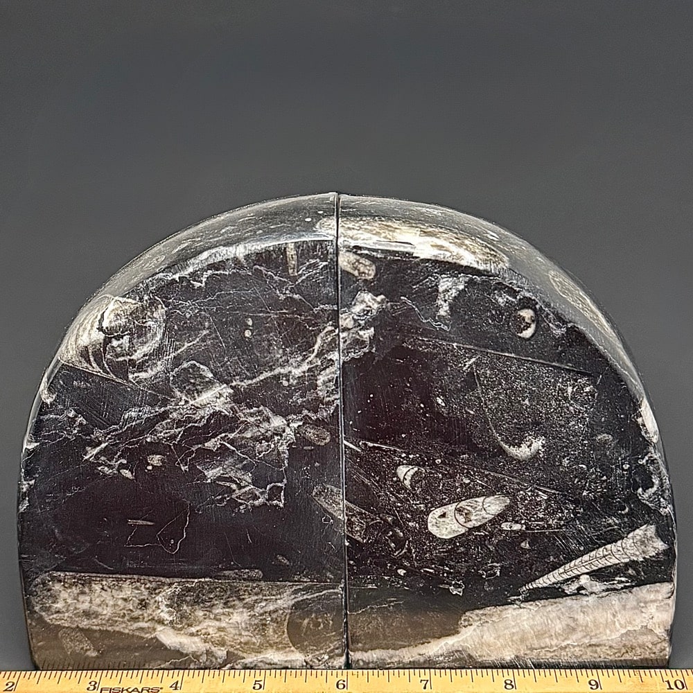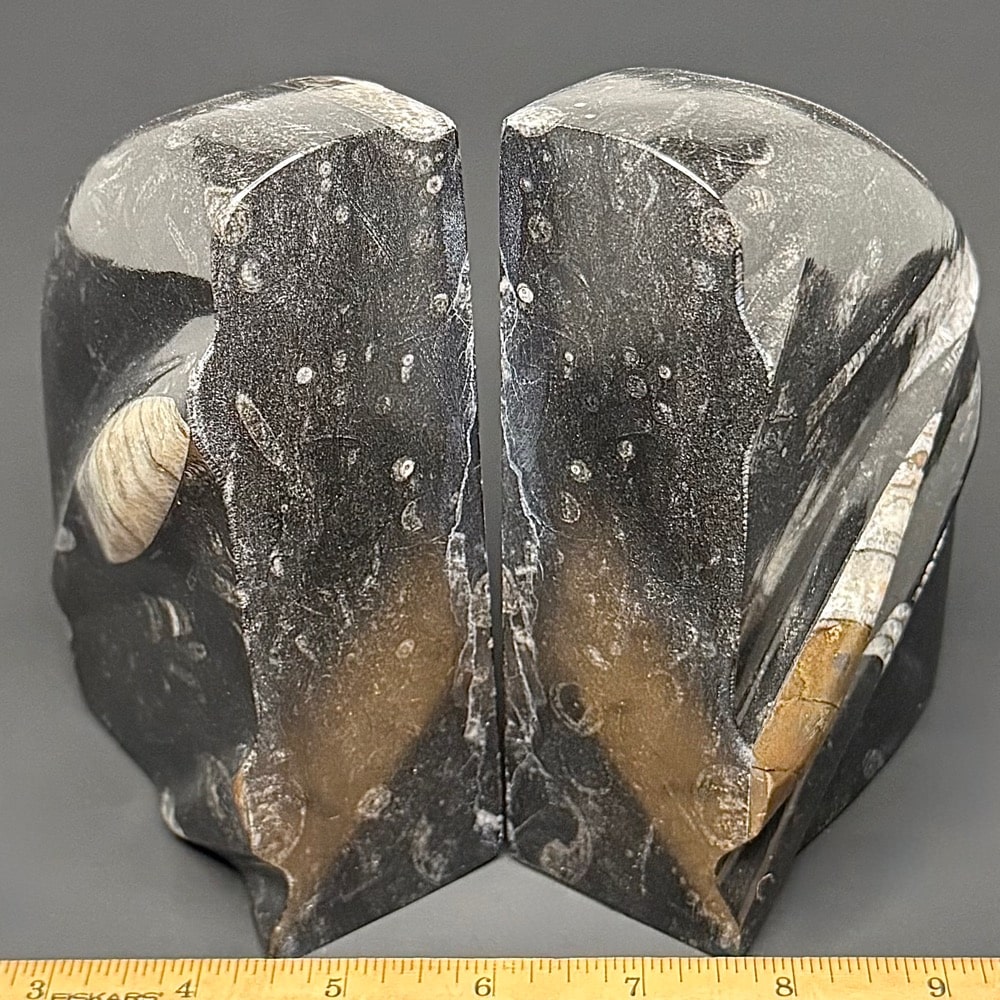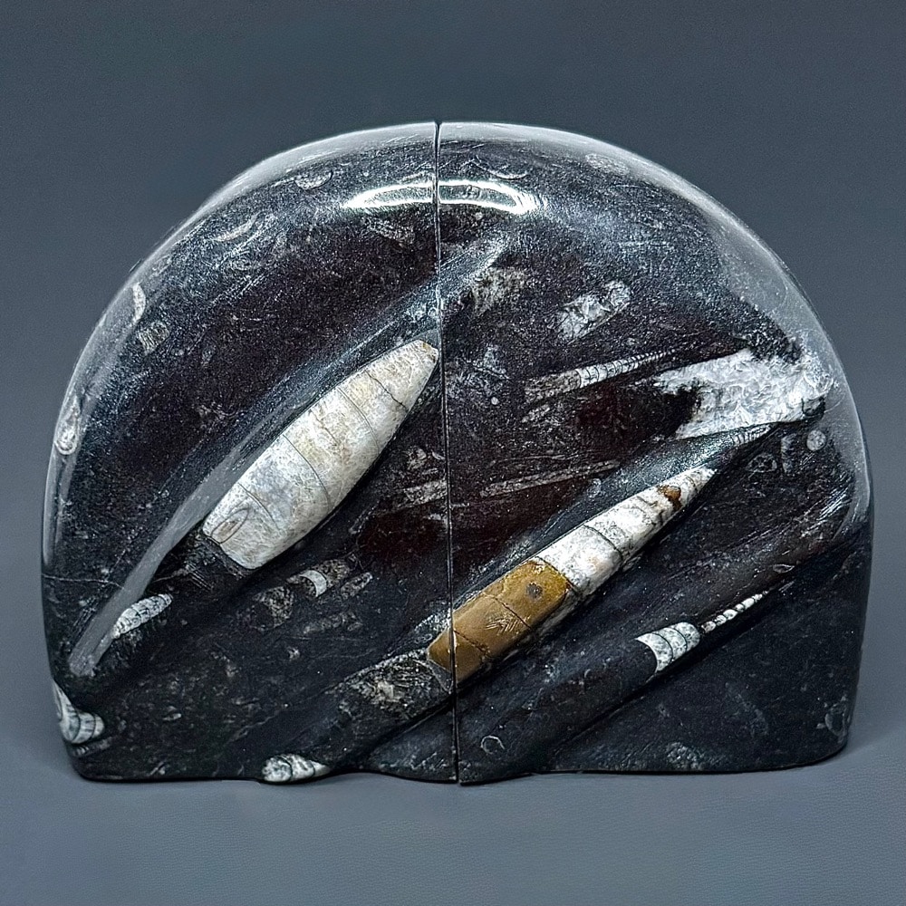 Appearance: The bookends have been cut and carved from Fossil Rock material to expose the very unique Orthoceras fossils. The set has a neat combination of fossil marble and a beautifully polished Orthoceras protruding on each side.