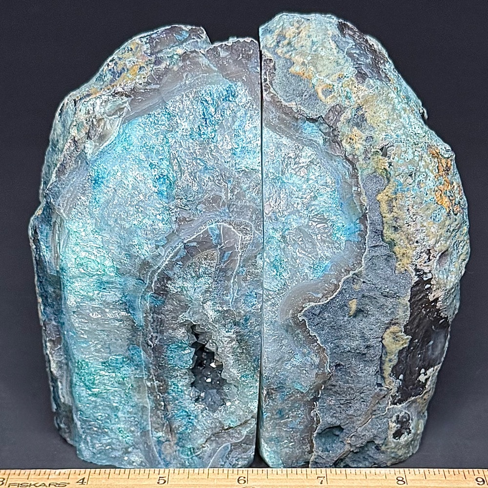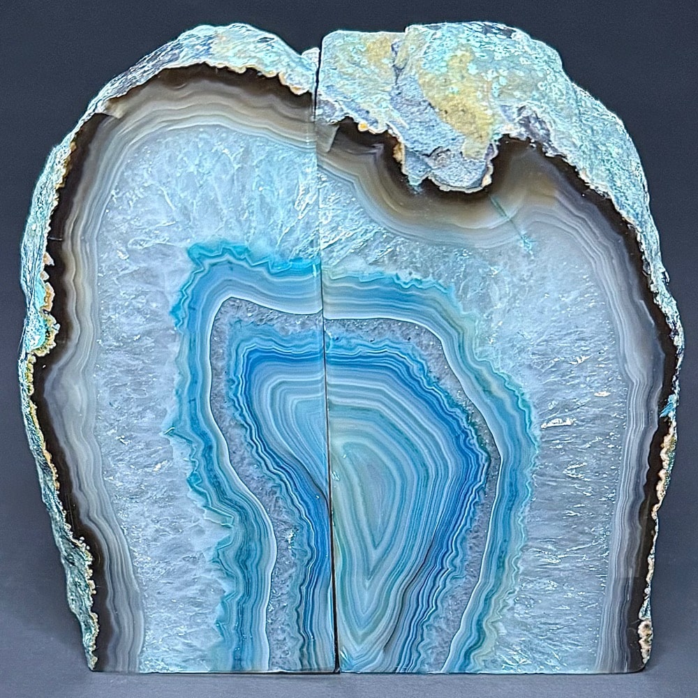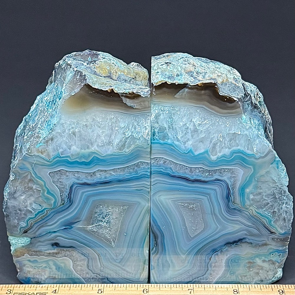 BK107: Teal (color enhanced) Brazilian Agate Bookends. – Locality: Brazil Selection: Polished and rough specimen.
