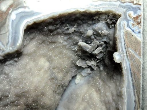Geodes are geological rock formations which occur in sedimentary and certain volcanic rocks.  They are essentially rock cavities or vugs with internal Crystal formations or concentric banding.  The exterior is generally Limestone while the interior contains Quartz Crystals and/or Chalcedony deposits.  If the Geode is completely filled with Crystal, being solid all the way through, it is then called a nodule.