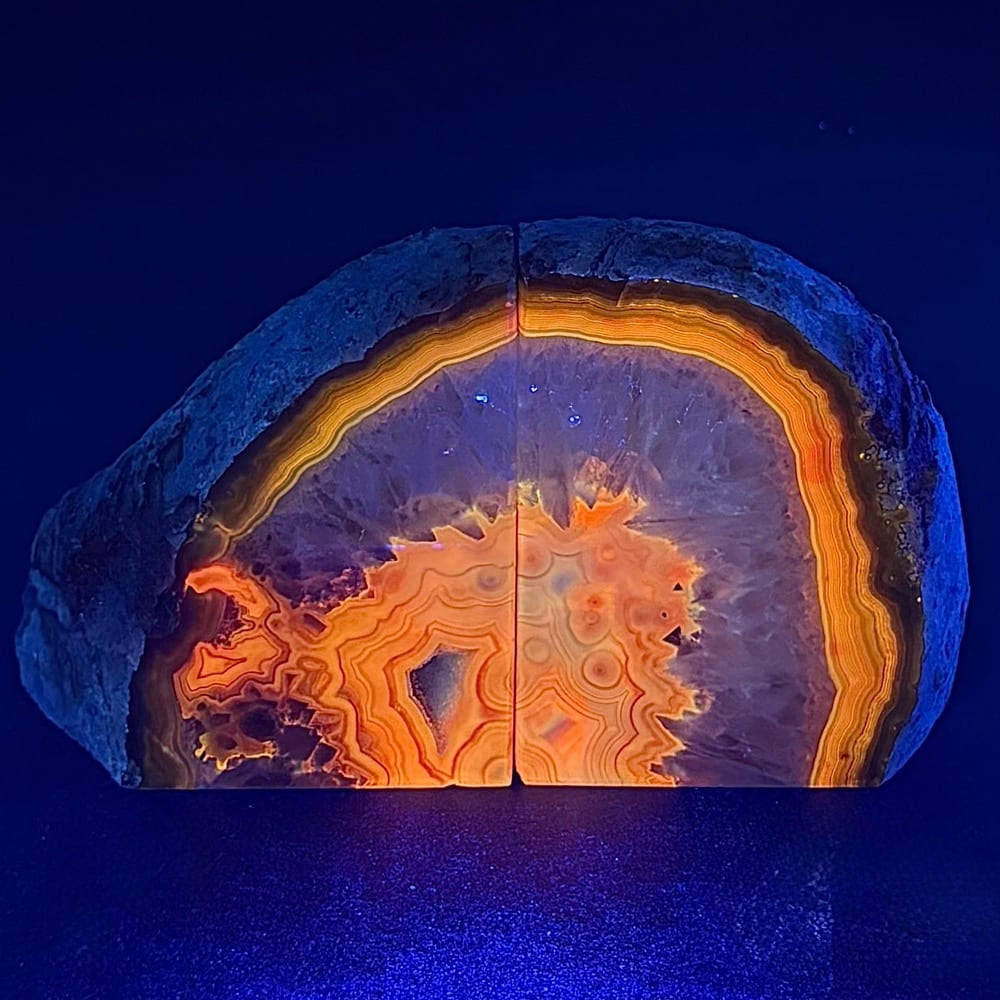 Appearance: The set is nicely polished on the front and inside faces.  It has a good mix of spectacular crystal and amazing Agate banding. It can also be turned around to display its hidden beauty and create a whole new design! UV fluorescent (shot with uvBeast 365nm(nanometer) Black Light UV flashlight).