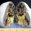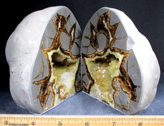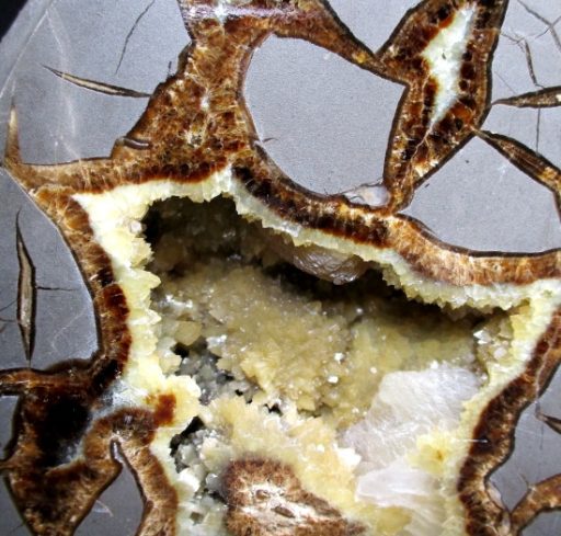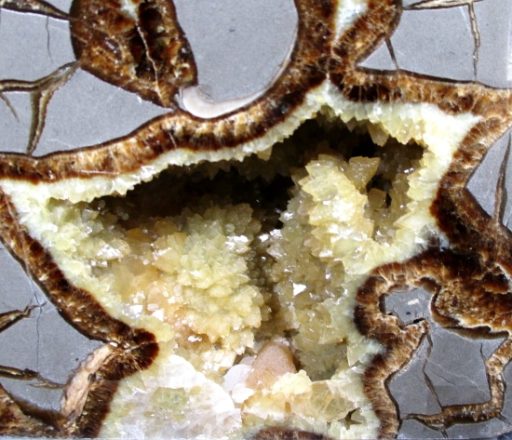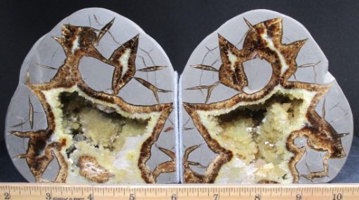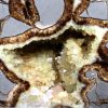 Septarians are commonly composed of a carbonate mineral such as Calcite, a microcrystalline form of Silica as in Flint or Jasper, or an Iron Oxide such as Hematite. These specimens are also known as a concretion which is a type of sedimentary rock. Septarians were formed millions of years ago by sediment forming around a fossil to create a mud ball transforming the fossil into Calcite and Aragonite.