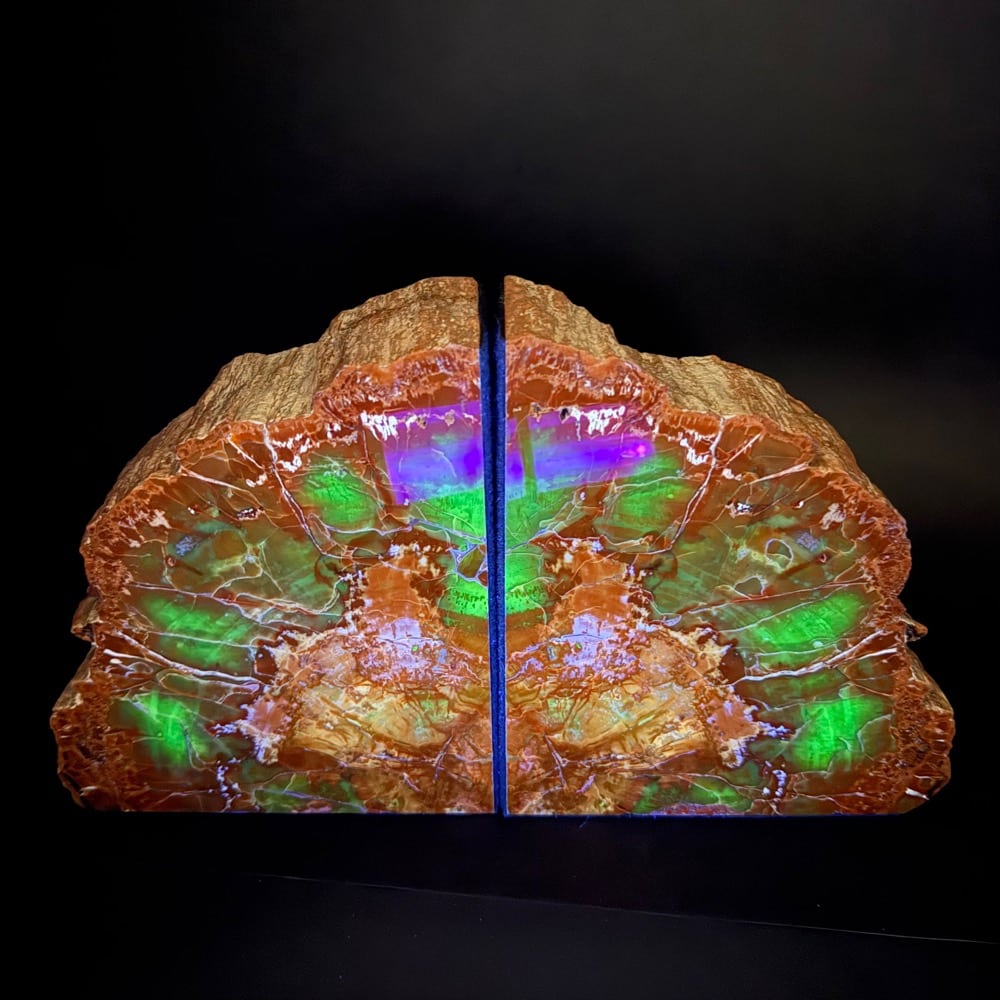 Appearance: High polished front with rough bark sides and smooth unpolished back. This sets displays an array of shapes and colors within the surface. The visuals provide the quintessential look that Arizona petrified wood is known for. UV Fluorescent.