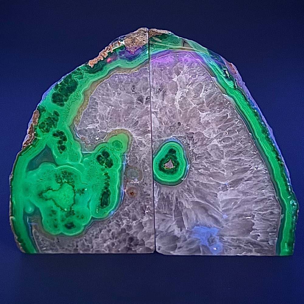 Appearance: The set is nicely polished on the front and inside faces.  It has a good mix of crystal and amazing Agate banding. This set can also be turned around to display its hidden beauty and create a whole new design! UV fluorescent (shot with uvBeast 365nm(nanometer) Black Light UV flashlight).