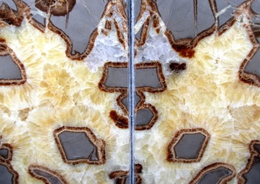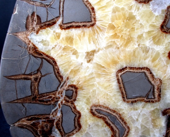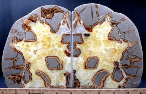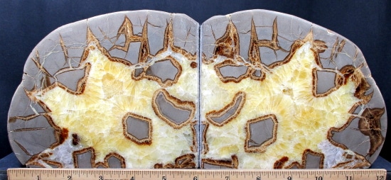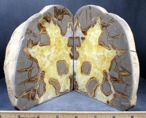 Septarians are commonly composed of a carbonate mineral such as Calcite, a microcrystalline form of Silica as in Flint or Jasper, or an Iron Oxide such as Hematite. These specimens are also known as a concretion which is a type of sedimentary rock. Septarians were formed millions of years ago by sediment forming around a fossil to create a mud ball transforming the fossil into Calcite and Aragonite.