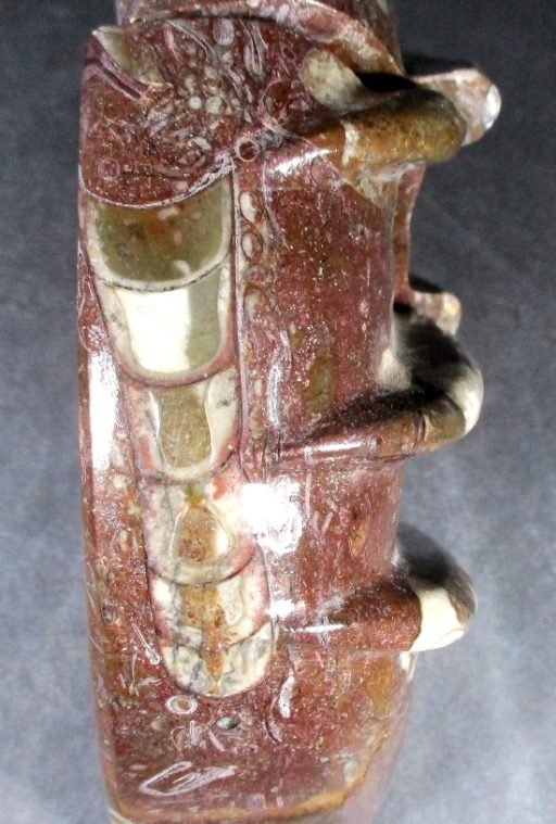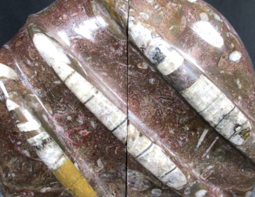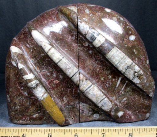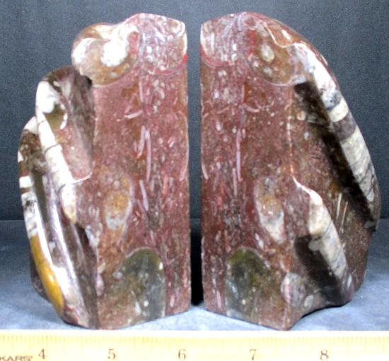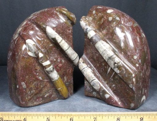 Here is a nice set of reddish brown Orthoceras bookends from Morocco.  This set measures 5 3/4″ wide x 4 1/2″ tall x 2″ thick and has a nice polish on the front, middle, top and side faces.  The bookends have been cut, carved and polished from Fossil Rock material to expose the very unique fossils and have a unique pattern on the front face. The bookends make great decorator pieces as well as super collectibles for the fossil hunter.