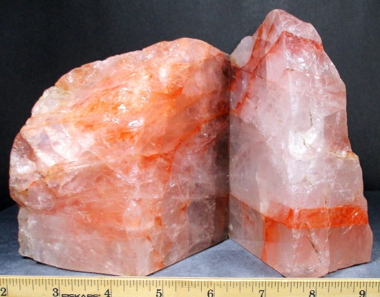 Here’s a new item, an exceptional set of Fire Quartz bookends from Madagascar!  This awesome set measures 7 7/8″ wide x  5 1/4″ tall x 3 1/8″ and has a nice polish on the front face. It has fantastic inclusions, amazing clarity,  subtle “rainbow” reflections and great design.  Just gorgeous!