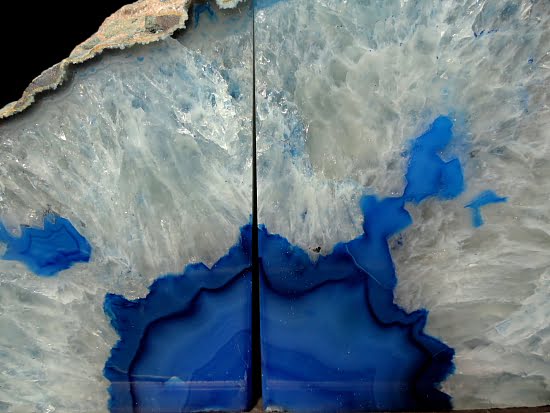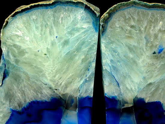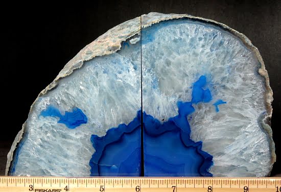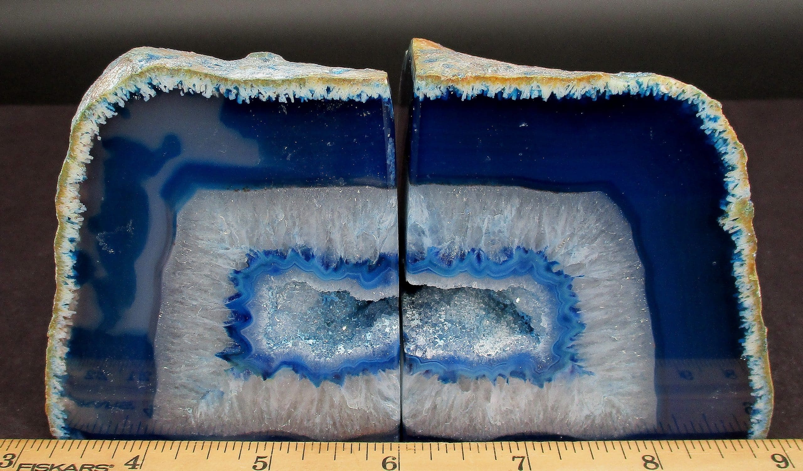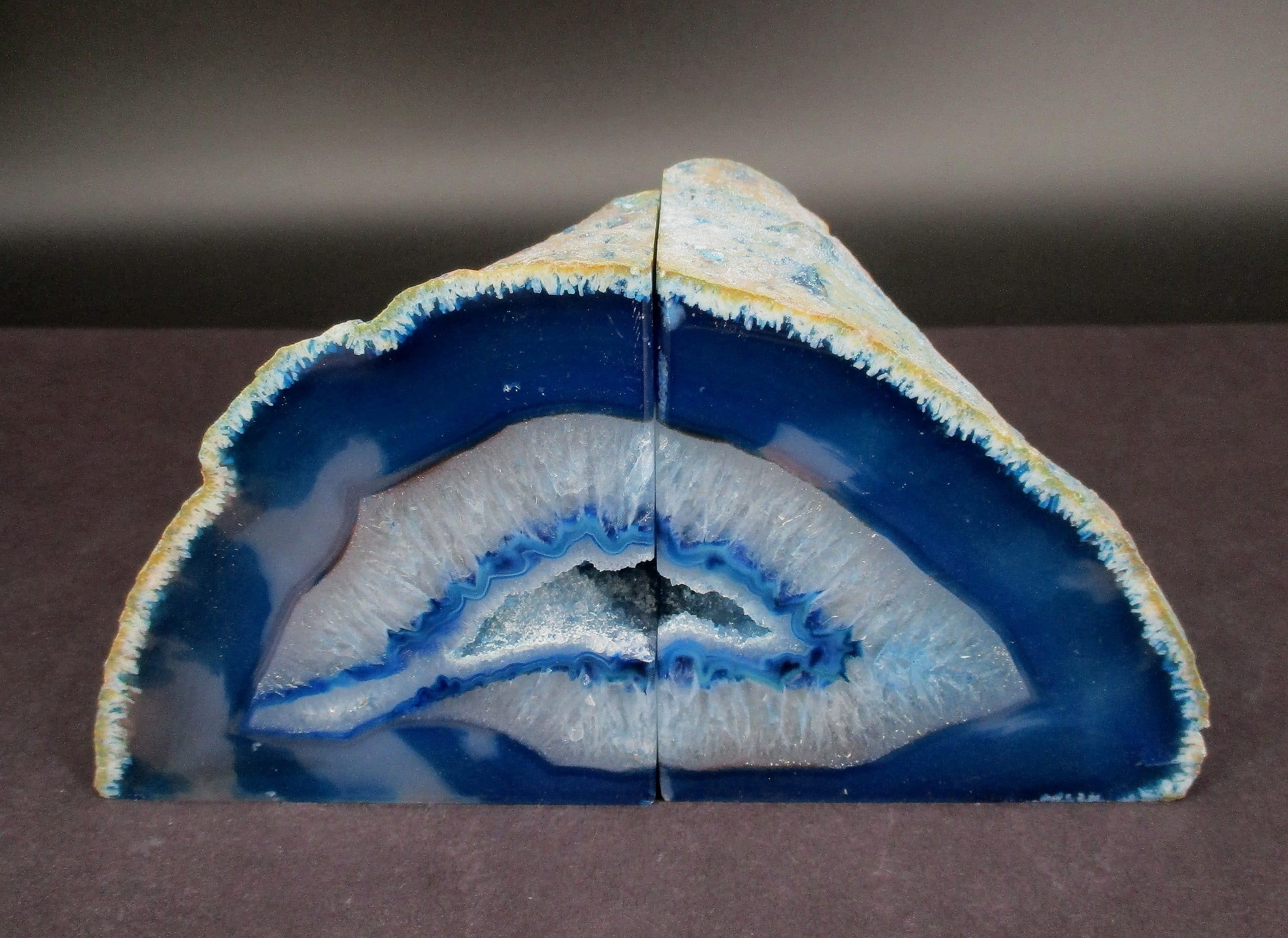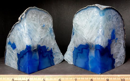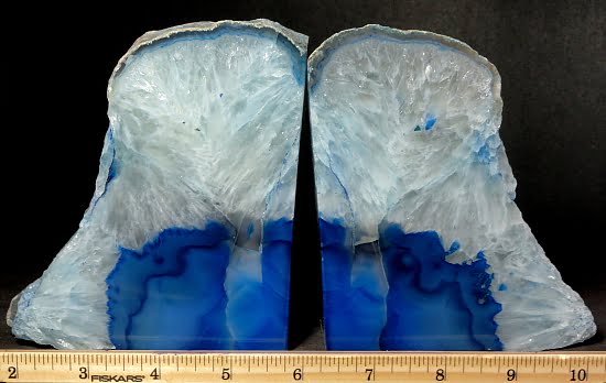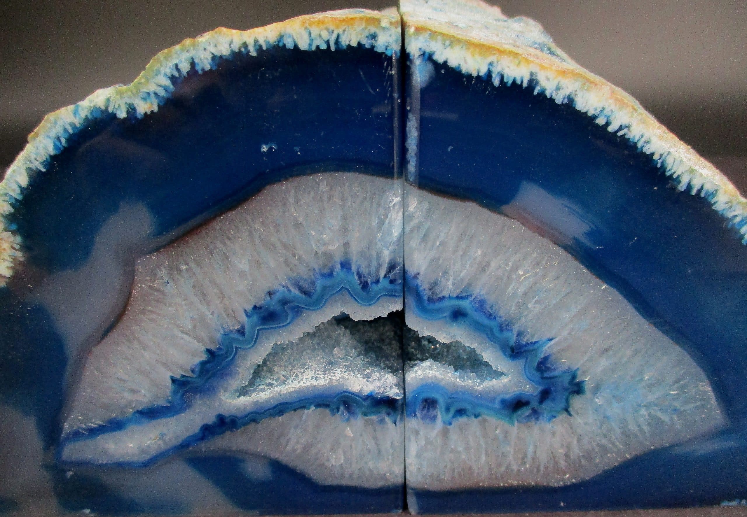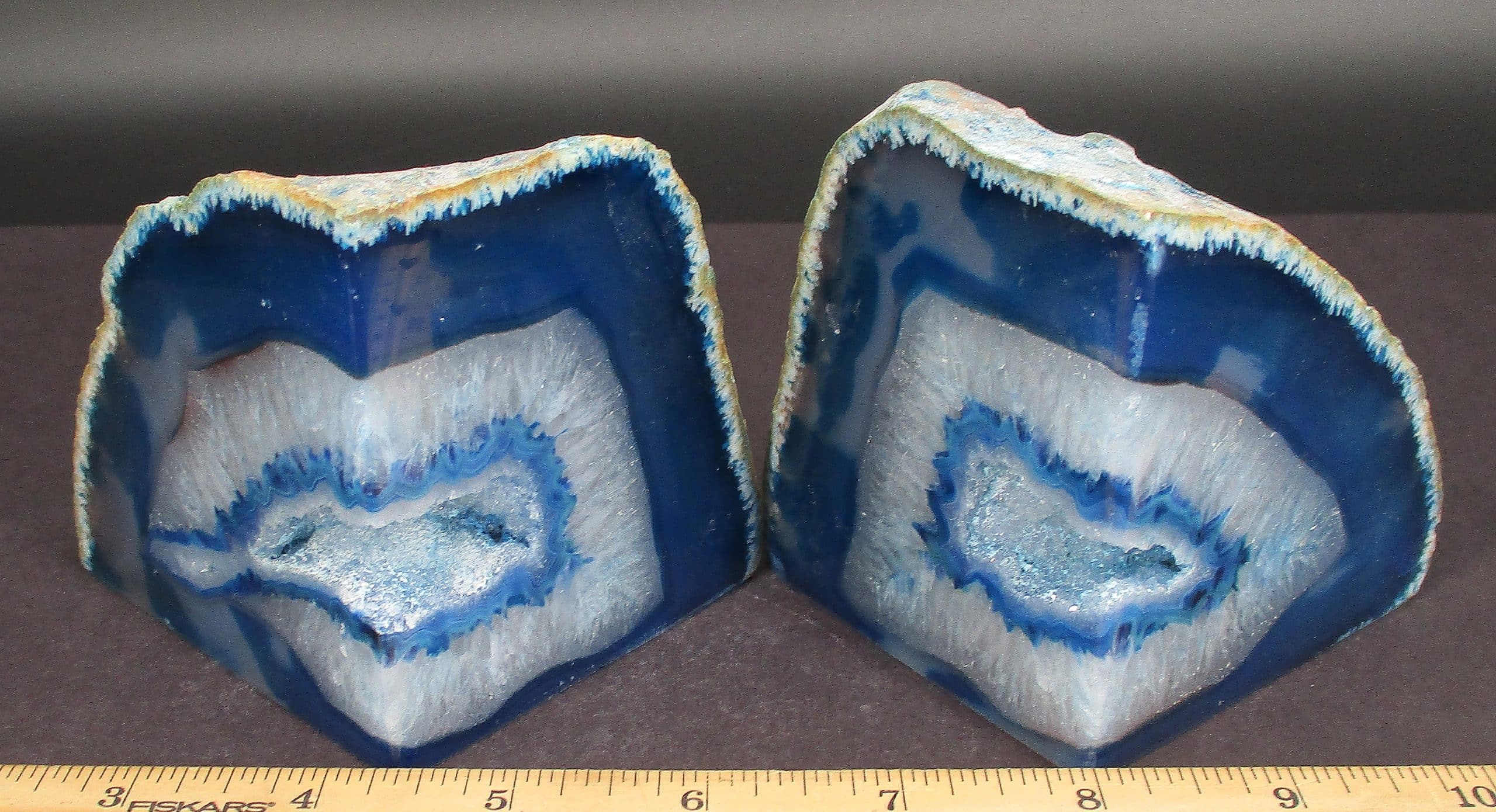 This is an amazing set of Blue (color enhanced) Brazilian Agate Geode bookends with a very unique design and color scheme.  This set measures 6″ wide x 3 1/8″ tall x 2 3/4″ with polished front and inner faces. Although not perfectly matched you can turn this set around and it’s like having another set of bookends! Lovely!