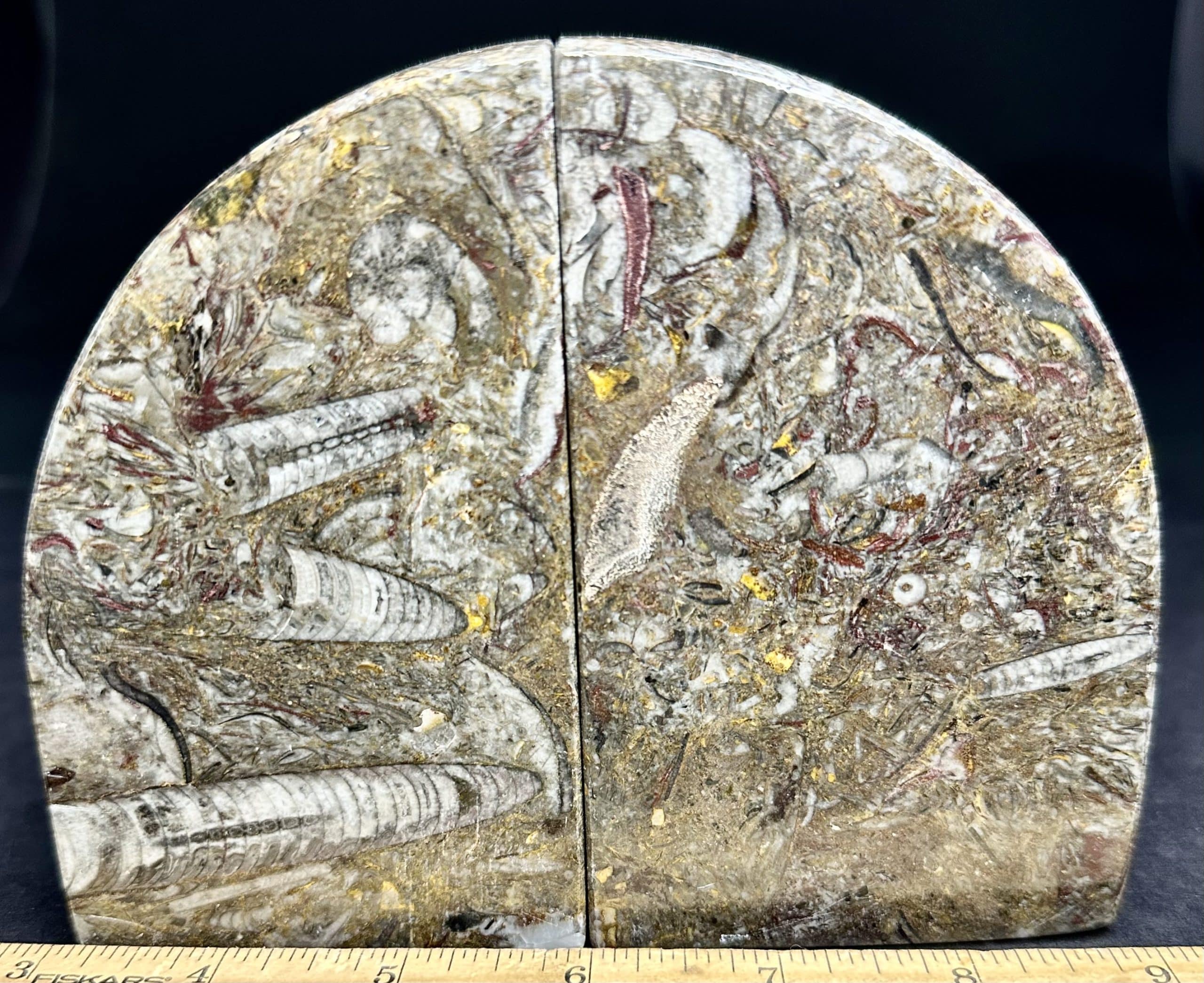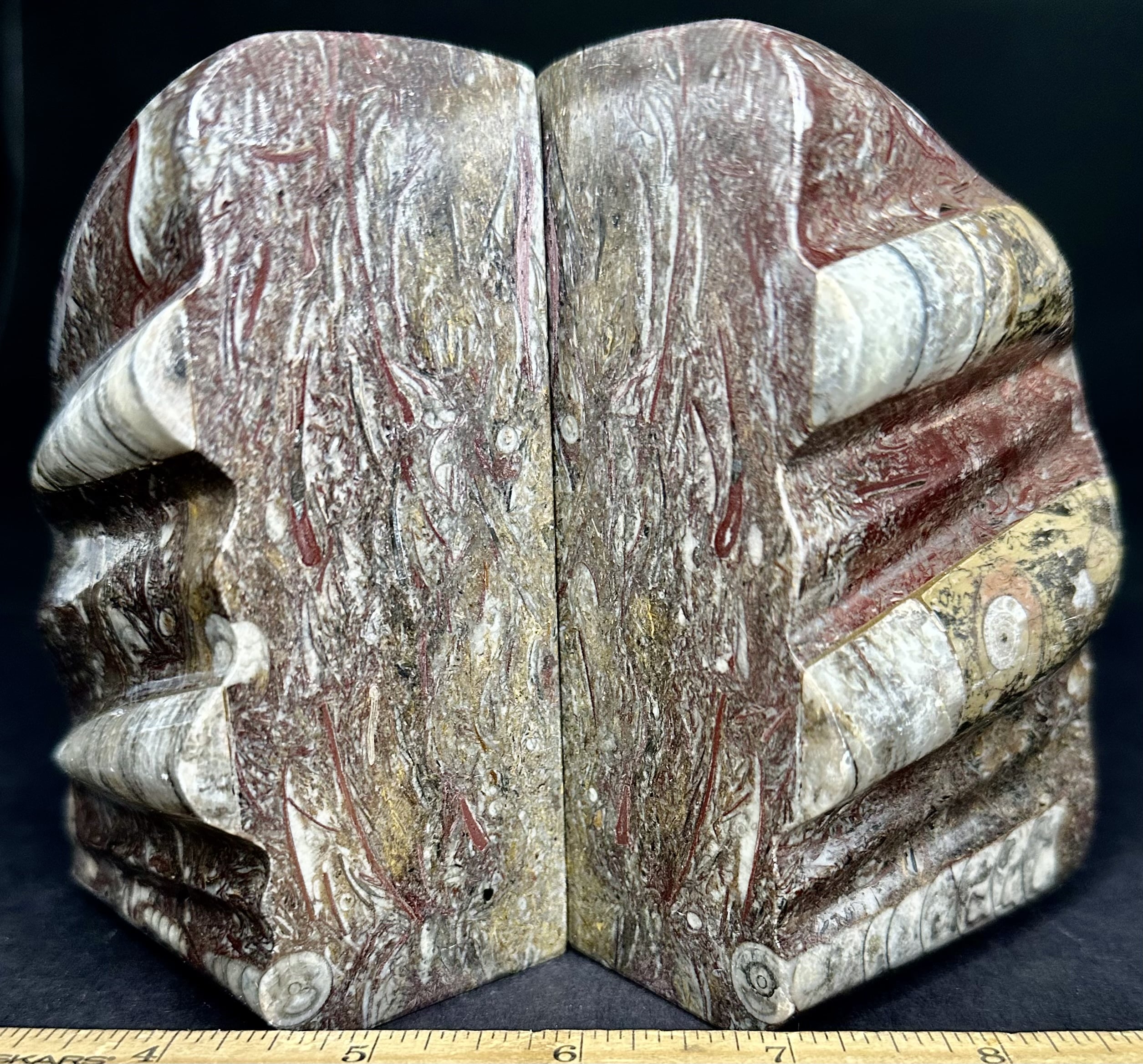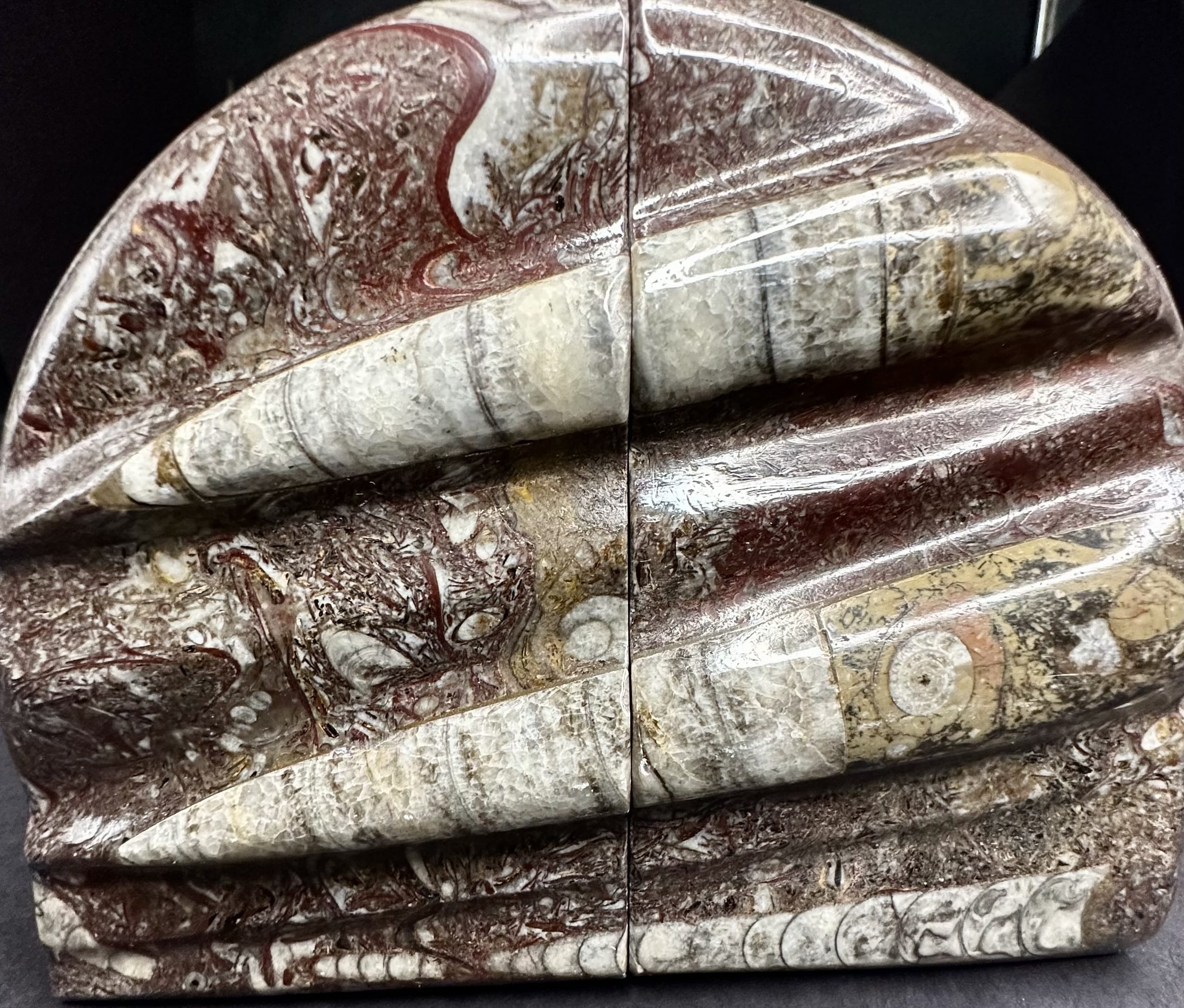 Here is an exceptional set of black Orthoceras bookends.  This cool set measures 7 3/4″ wide x 6 1/4″ tall x 2 3/8″ and has a nice polish on the front, middle, top and side faces. The bookends have been cut, carved and polished from Fossil Rock material to expose the very unique fossils.  This material is from Morocco. The bookends make great decorator pieces as well as super collectibles for the fossil hunter.