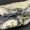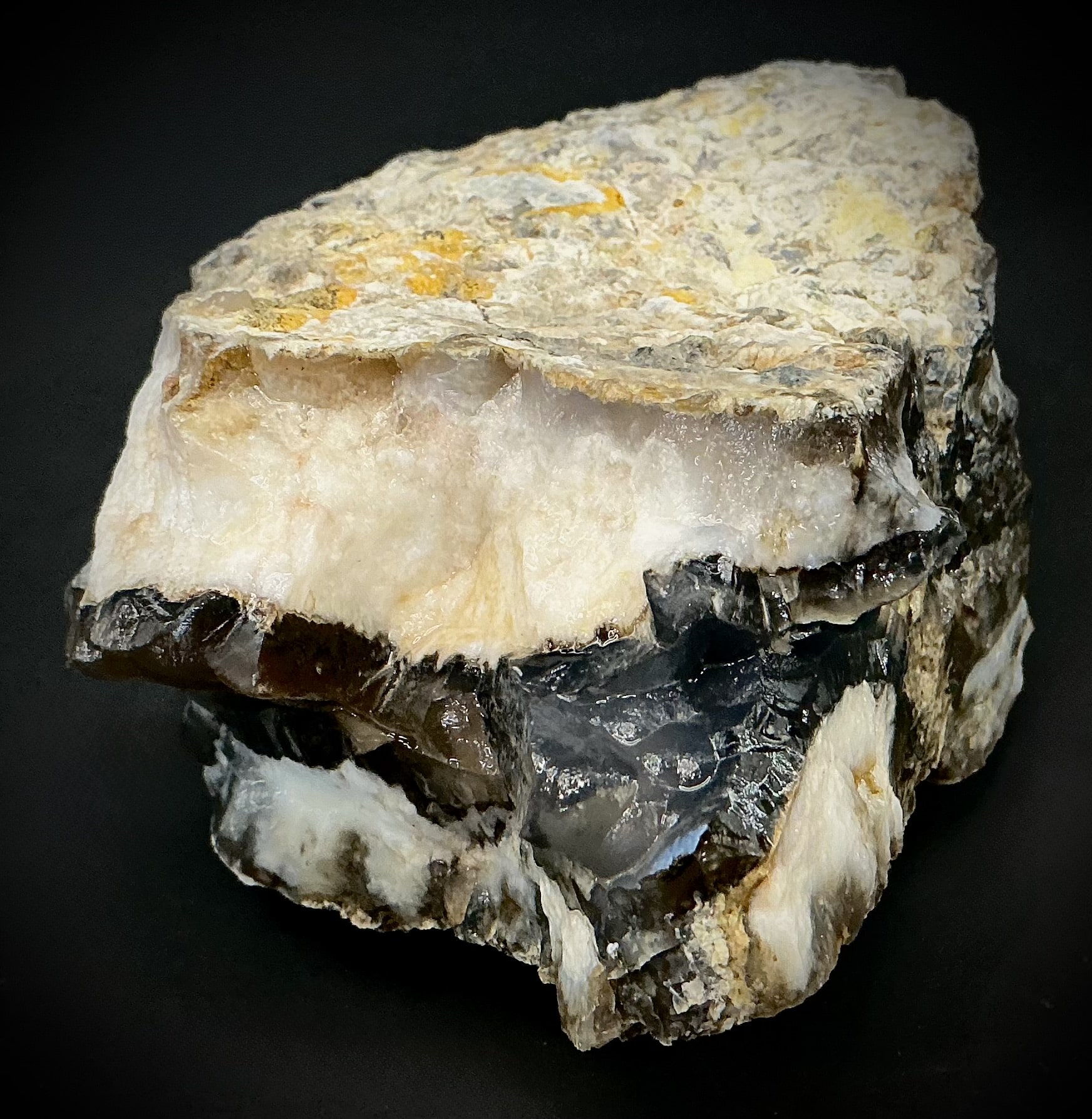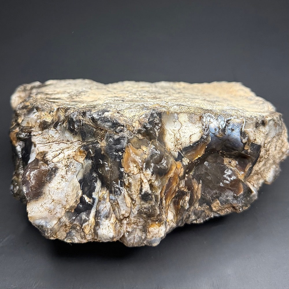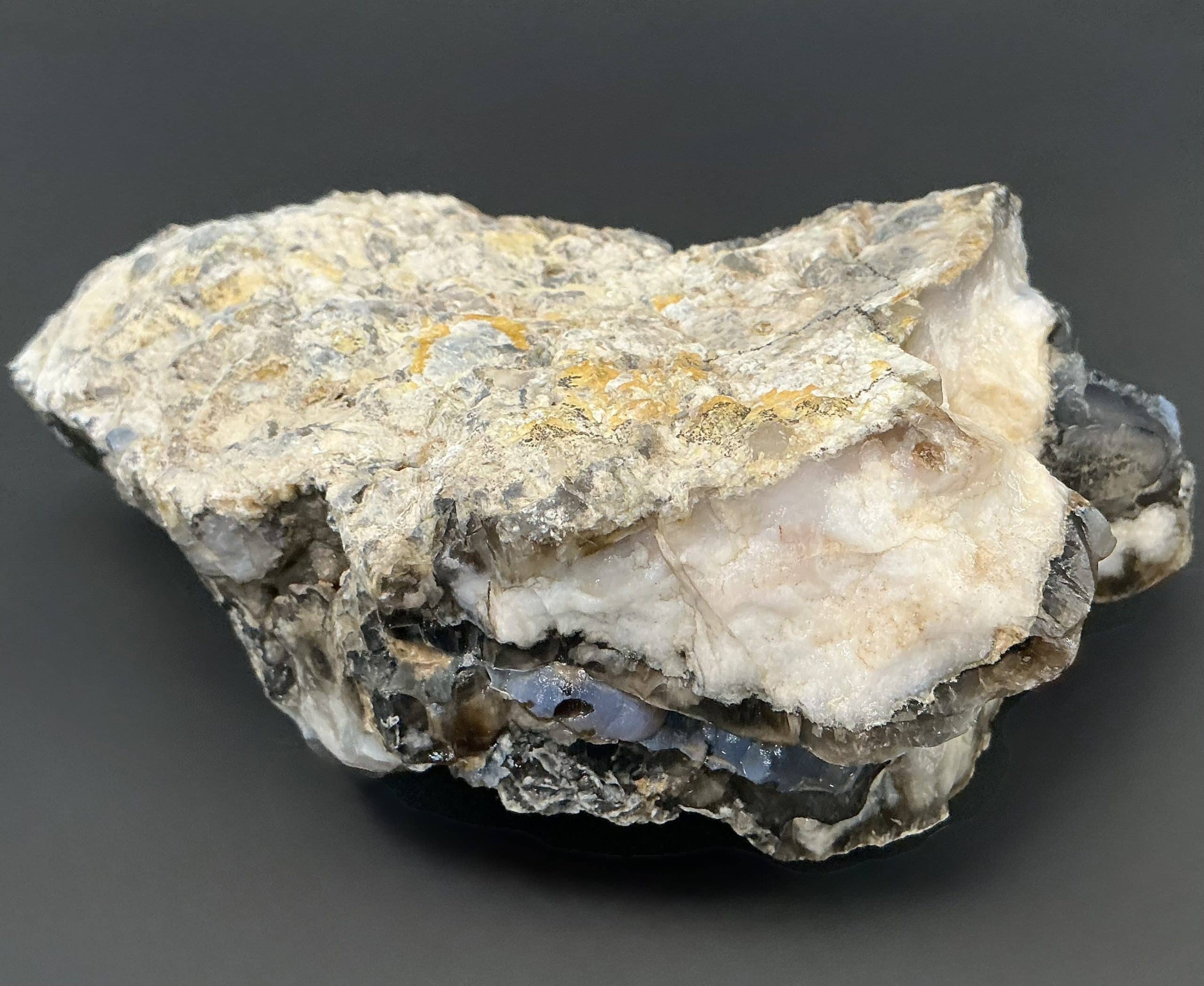Chalcedony is a cryptocrystalline form of silica, composed of very fine intergrowths of the minerals quartz and moganite. Chalcedony has a waxy luster and may be semitransparent or translucent. It can assume a wide range of colors, but those most commonly seen are white to gray, grayish-blue or a shade of brown ranging from pale to nearly black.