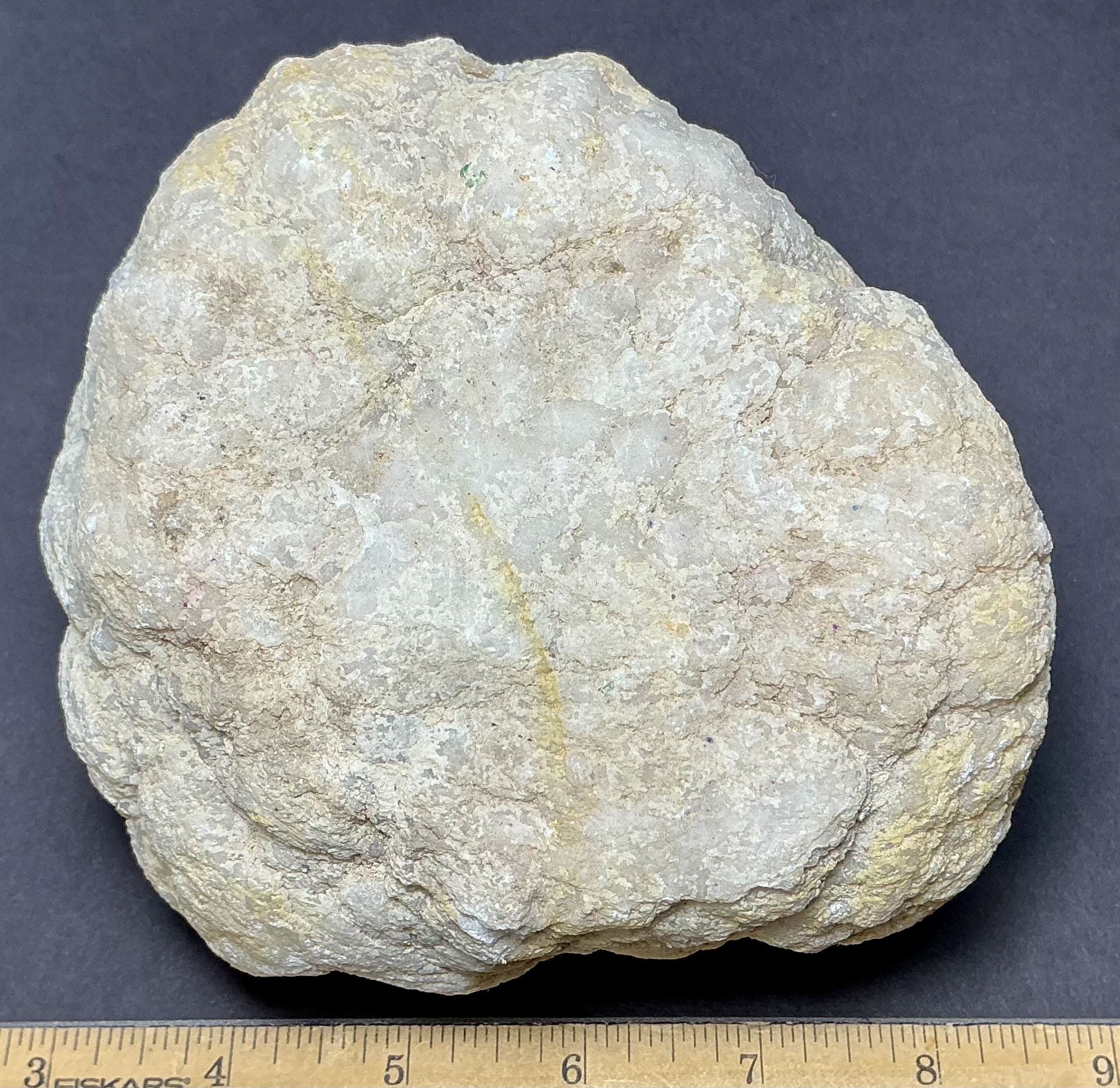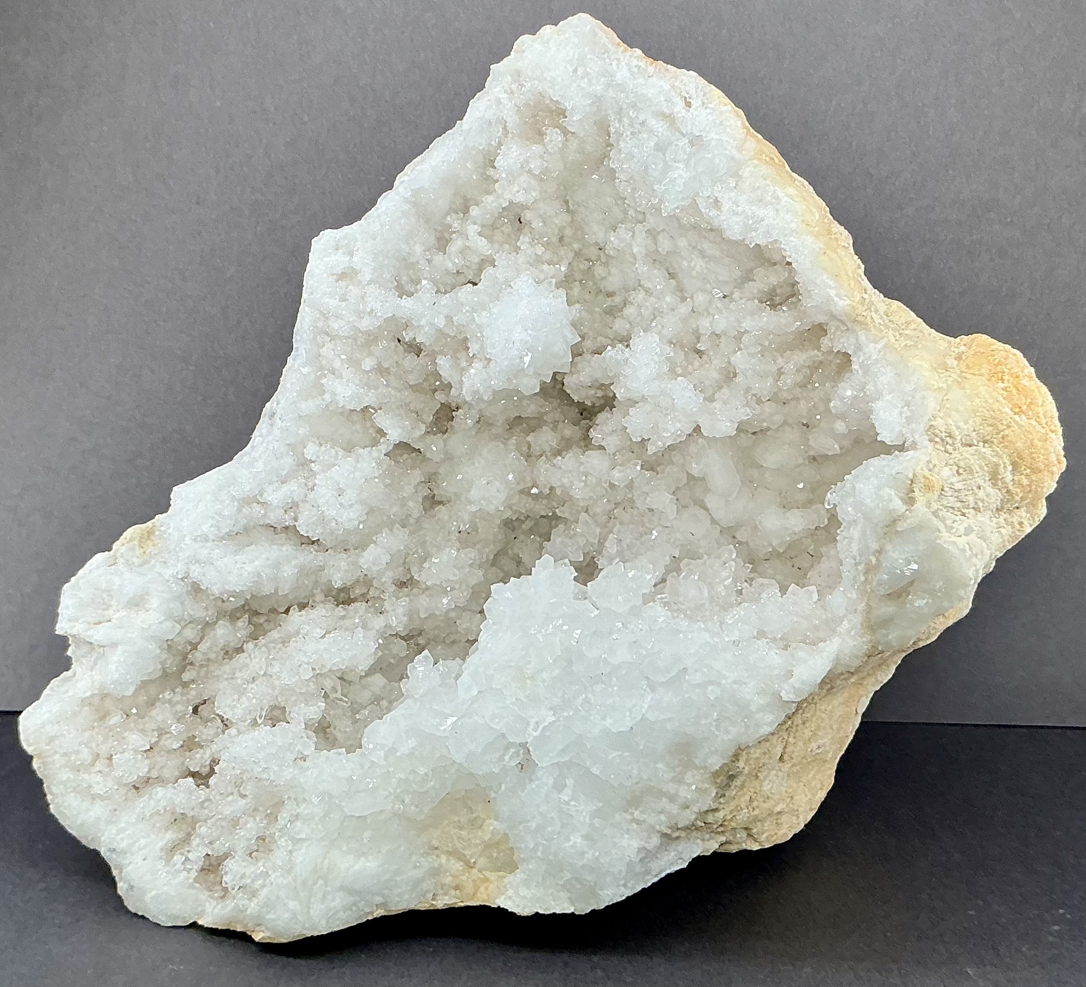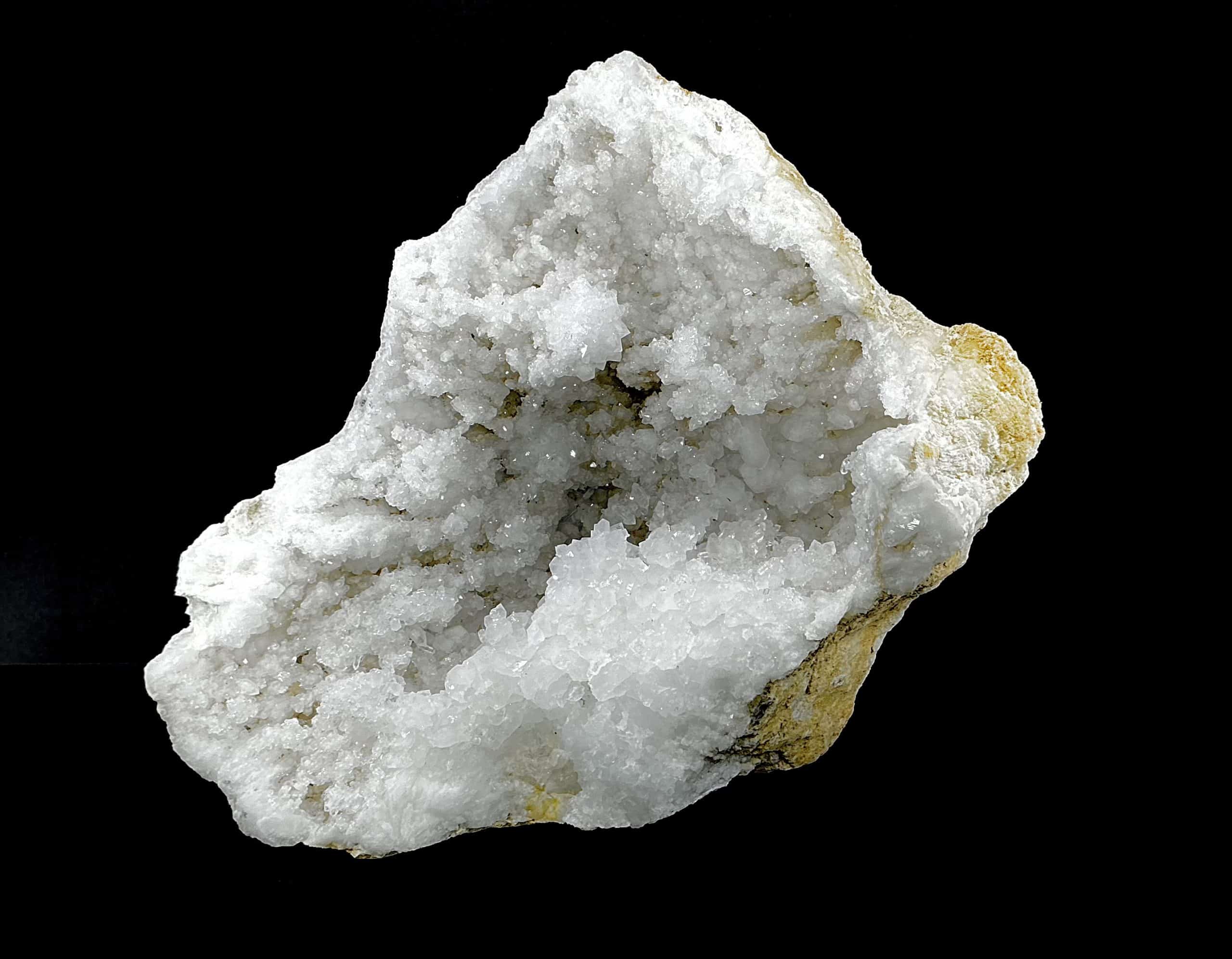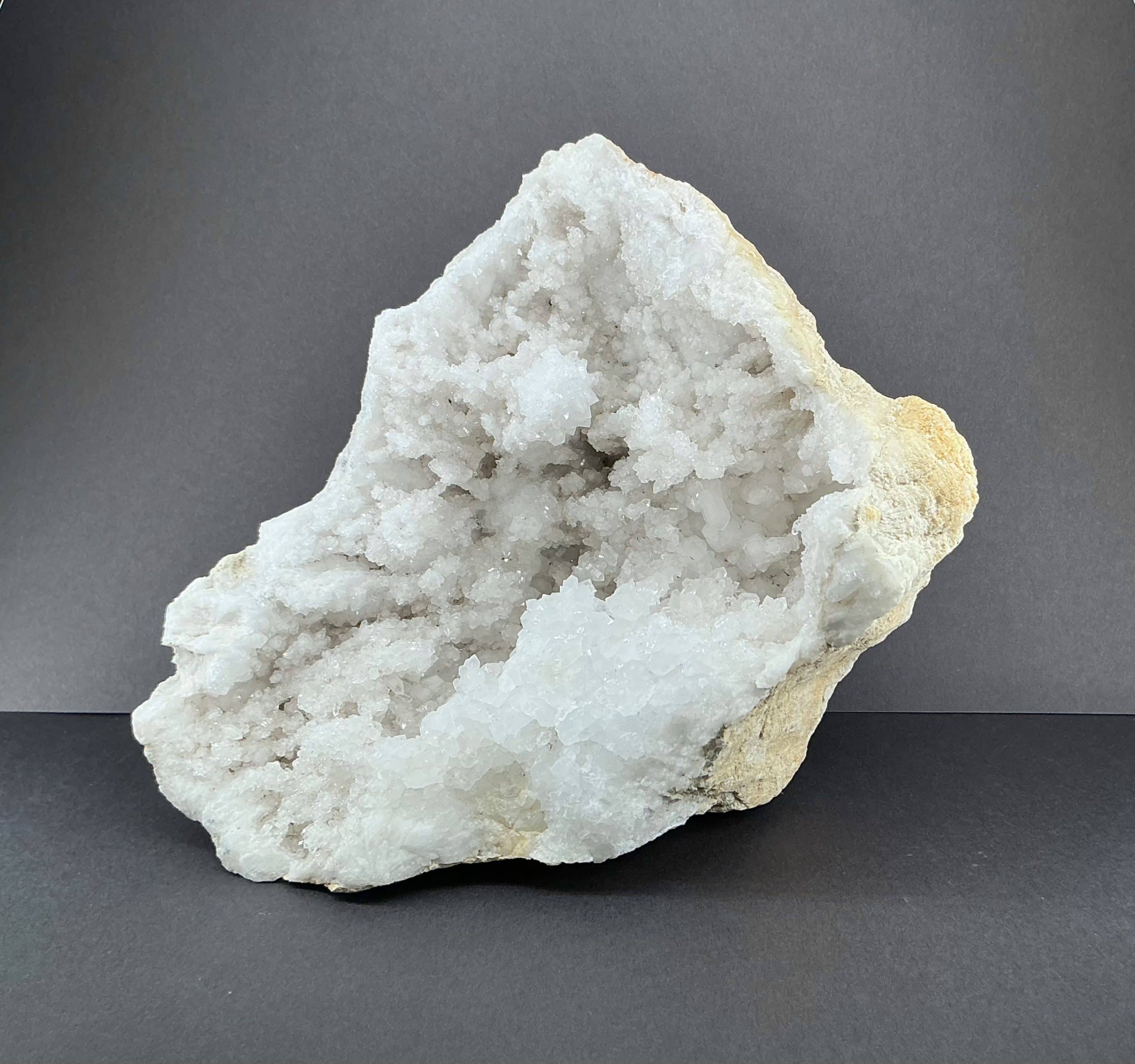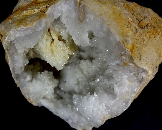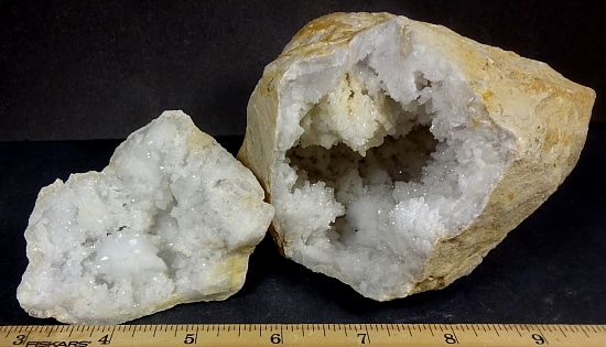 Geodes are geological rock formations which occur in sedimentary and certain volcanic rocks. They are essentially rock cavities or vugs with internal Crystal formations or concentric banding. The exterior is generally Limestone while the interior contains Quartz Crystals and/or Chalcedony deposits. If the Geode is completely filled with Crystal, being solid all the way through, it is then called a nodule.