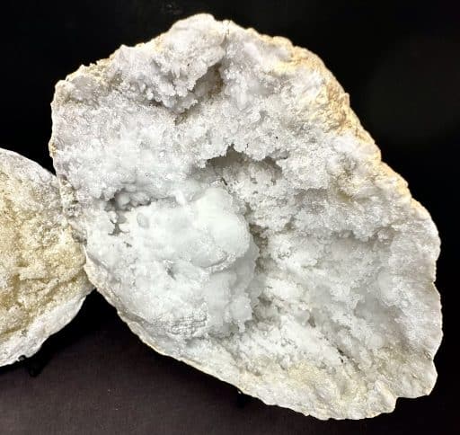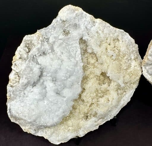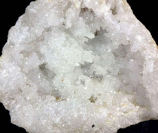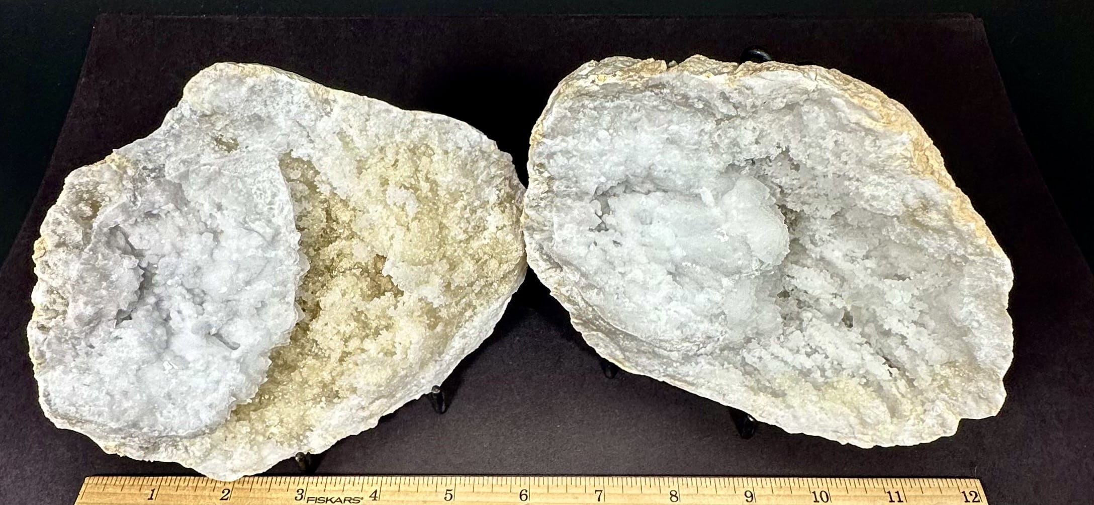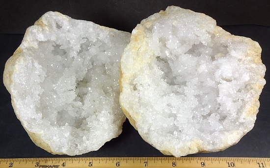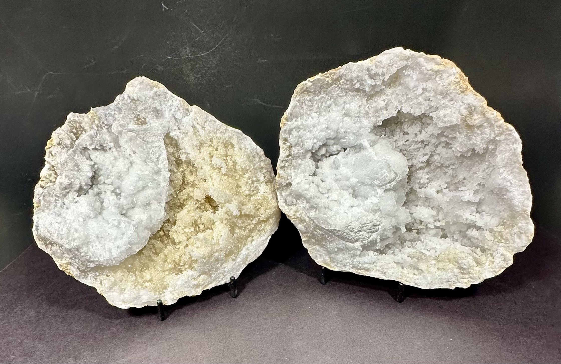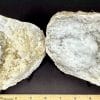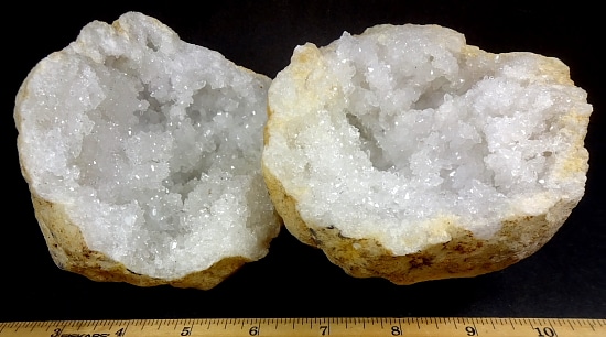 Geodes are geological rock formations which occur in sedimentary and certain volcanic rocks. They are essentially rock cavities or vugs with internal Crystal formations or concentric banding. The exterior is generally Limestone while the interior contains Quartz Crystals and/or Chalcedony deposits. If the Geode is completely filled with Crystal, being solid all the way through, it is then called a nodule.