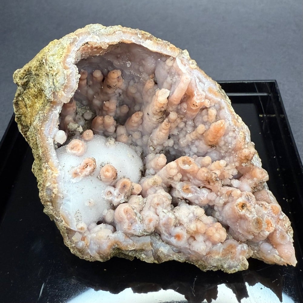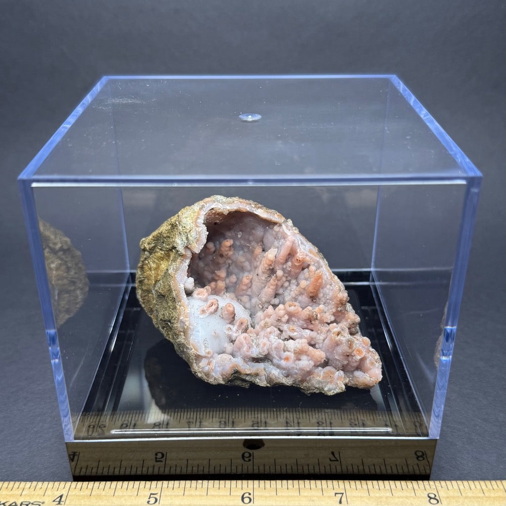 Geodes are geological rock formations which occur in sedimentary and certain volcanic rocks. They are essentially rock cavities or vugs with internal Crystal formations or concentric banding. The exterior is generally Limestone while the interior contains Quartz Crystals and/or Chalcedony deposits. If the Geode is completely filled with Crystal, being solid all the way through, it is then called a nodule.