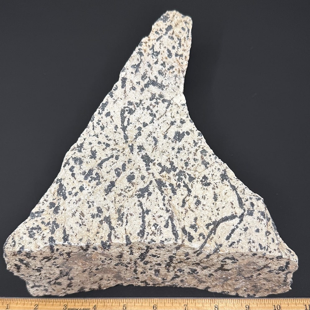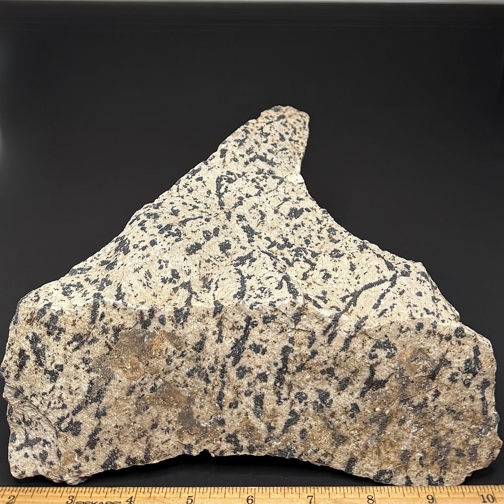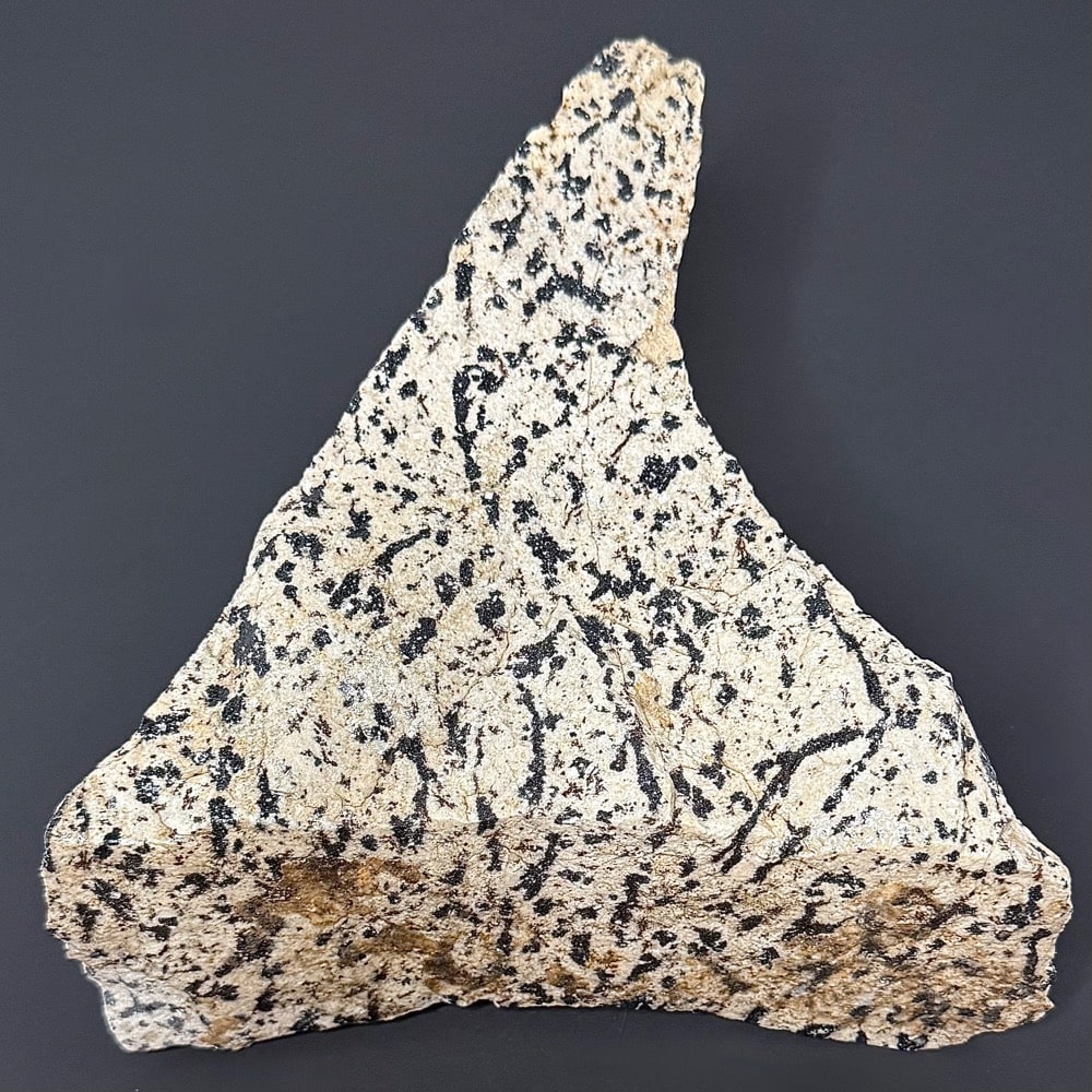 Dalmatian Stone, or orbicular Rhyolite, is an igneous rock that was formed by lava flows on the Earth’s surface. The spots or “orbs” probably occurred when molten lava reacted with fragments of rock known as Xenoliths. These stones are light to dark tan in color with black spots throughout. The nickname “Dalmatian” was given to this unusual looking mineral because of its resemblance to a Dalmatian dog’s spots.