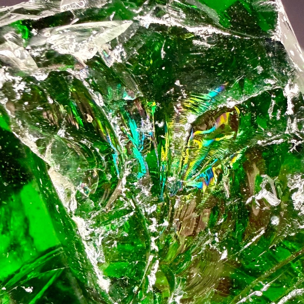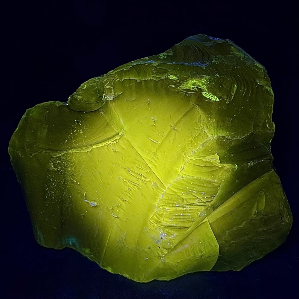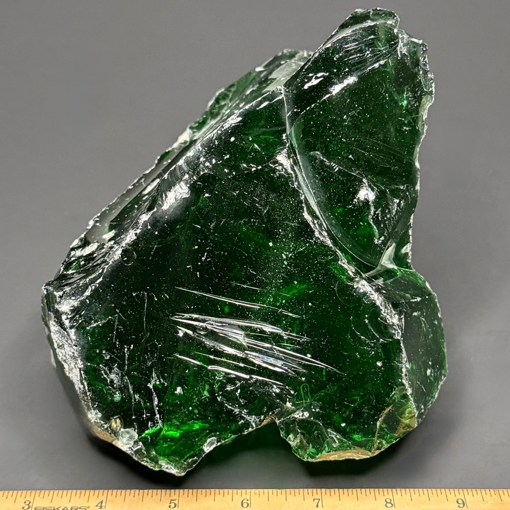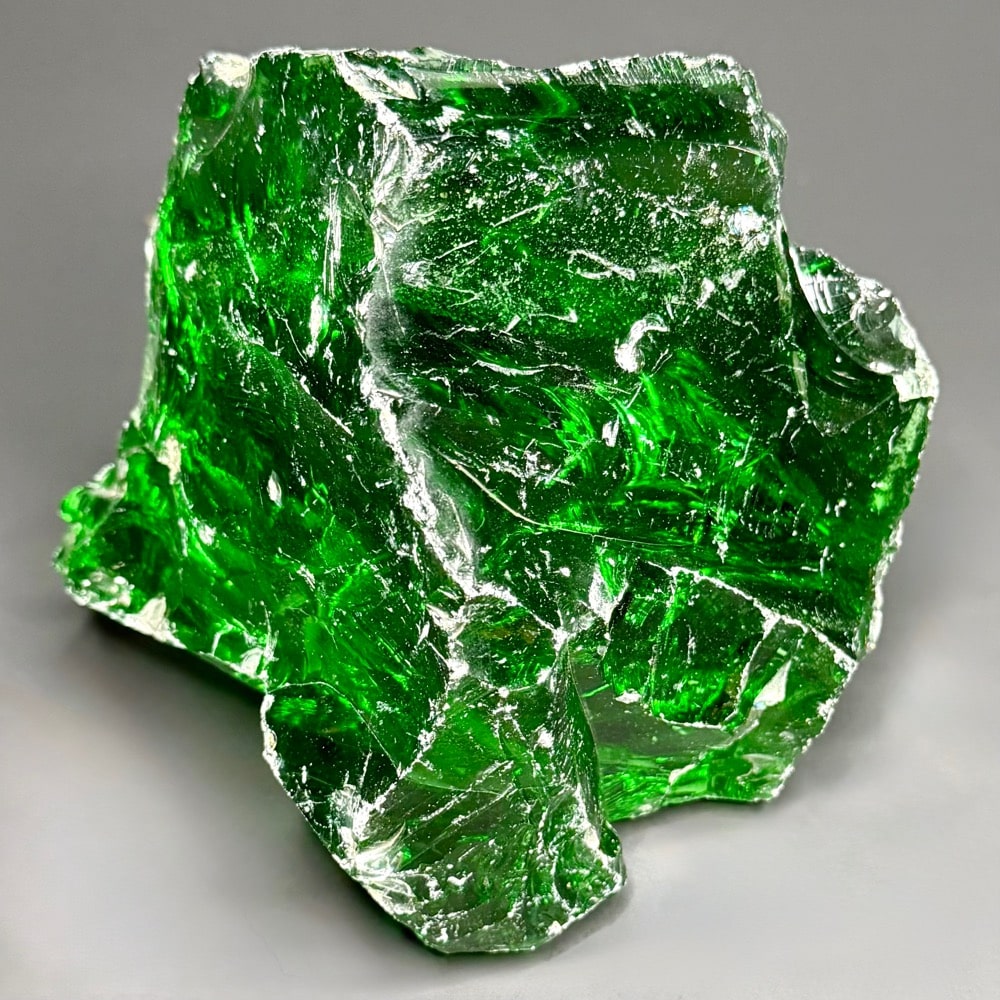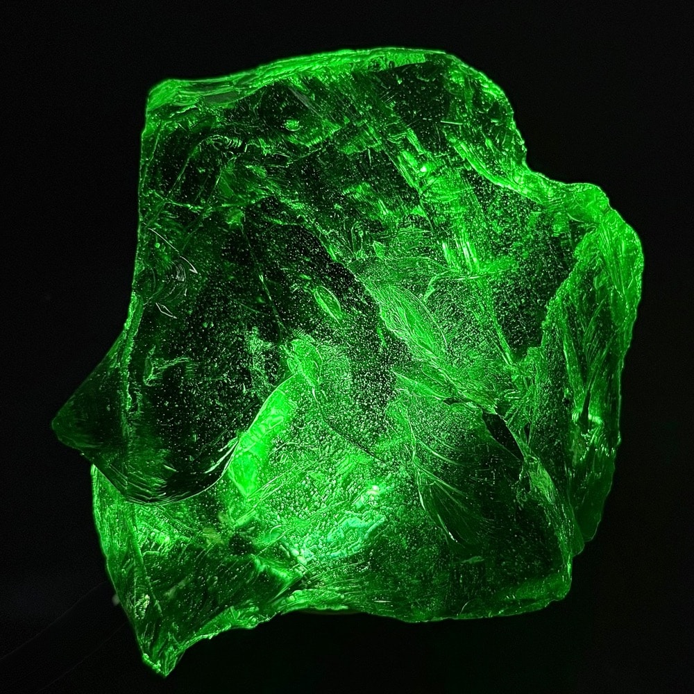 Appearance: This is a select quality Emerald green Glass specimen from slag from various manufacturers. It has a translucence that would be best appreciated in with backlighting as shown in photos below. Color changes under UV light. UV fluorescent (shot with uvBeast 365nm(nanometer) Black Light UV flashlight).