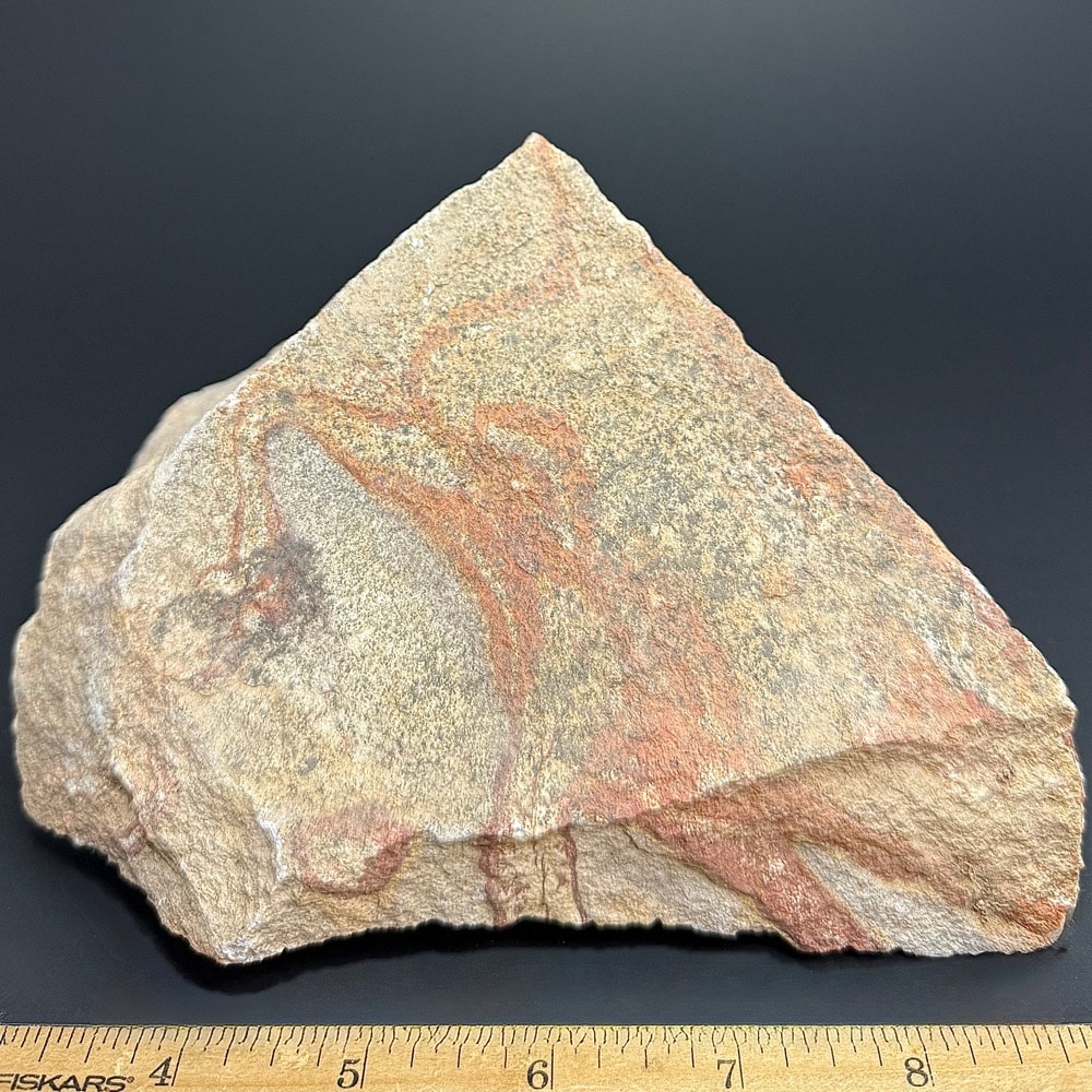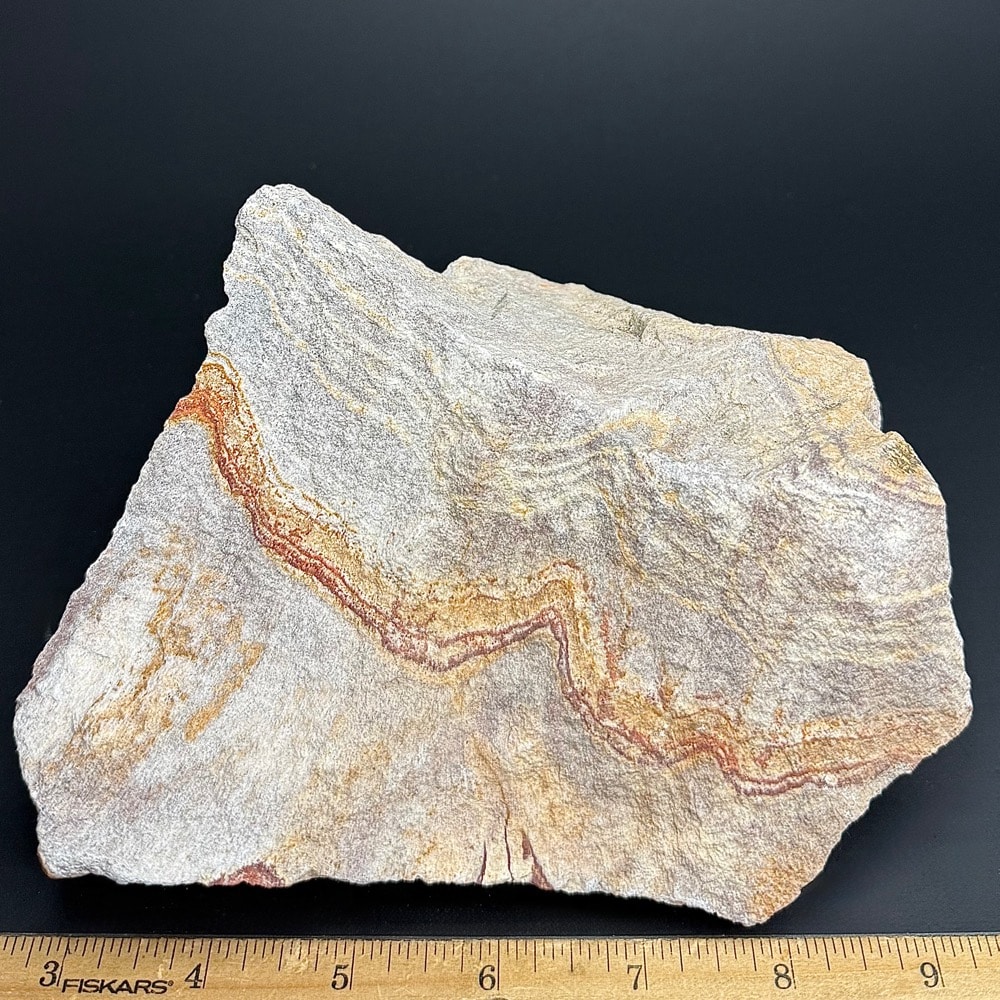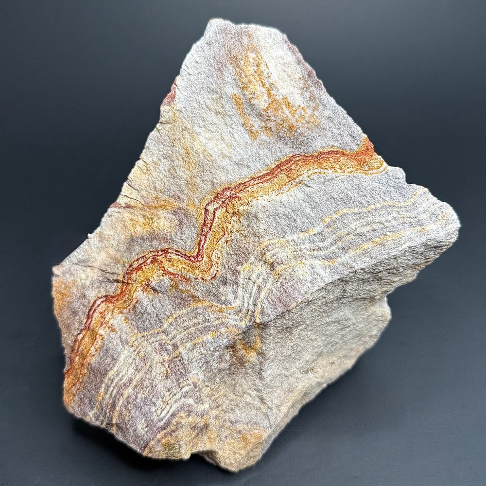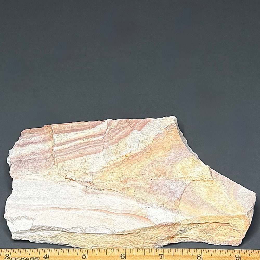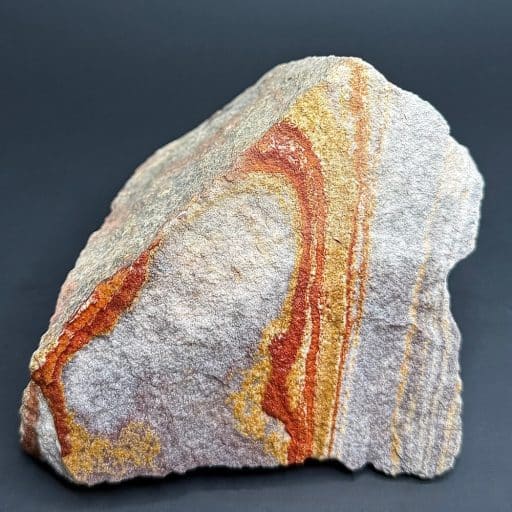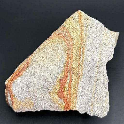 Rhyolite is an igneous, volcanic rock that is composed of Felsic, or Silicate minerals such as Silica, Aluminum, Sodium and Potassium. This material, also called Volcanic Tuft and Rainbow Rock actually began as volcanic ash spewed from the mouth of a volcano millions of years ago. This ash was exposed to heat and pressure that resulted in turning it to stone. The bright banded colors are a result of exposure to high concentrations of iron oxides. The material is similar to that of Granite, Pumice and Obsidian but due to the cooling process when formed, Rhyolite did not form any crystals, thus changing the texture of the material.