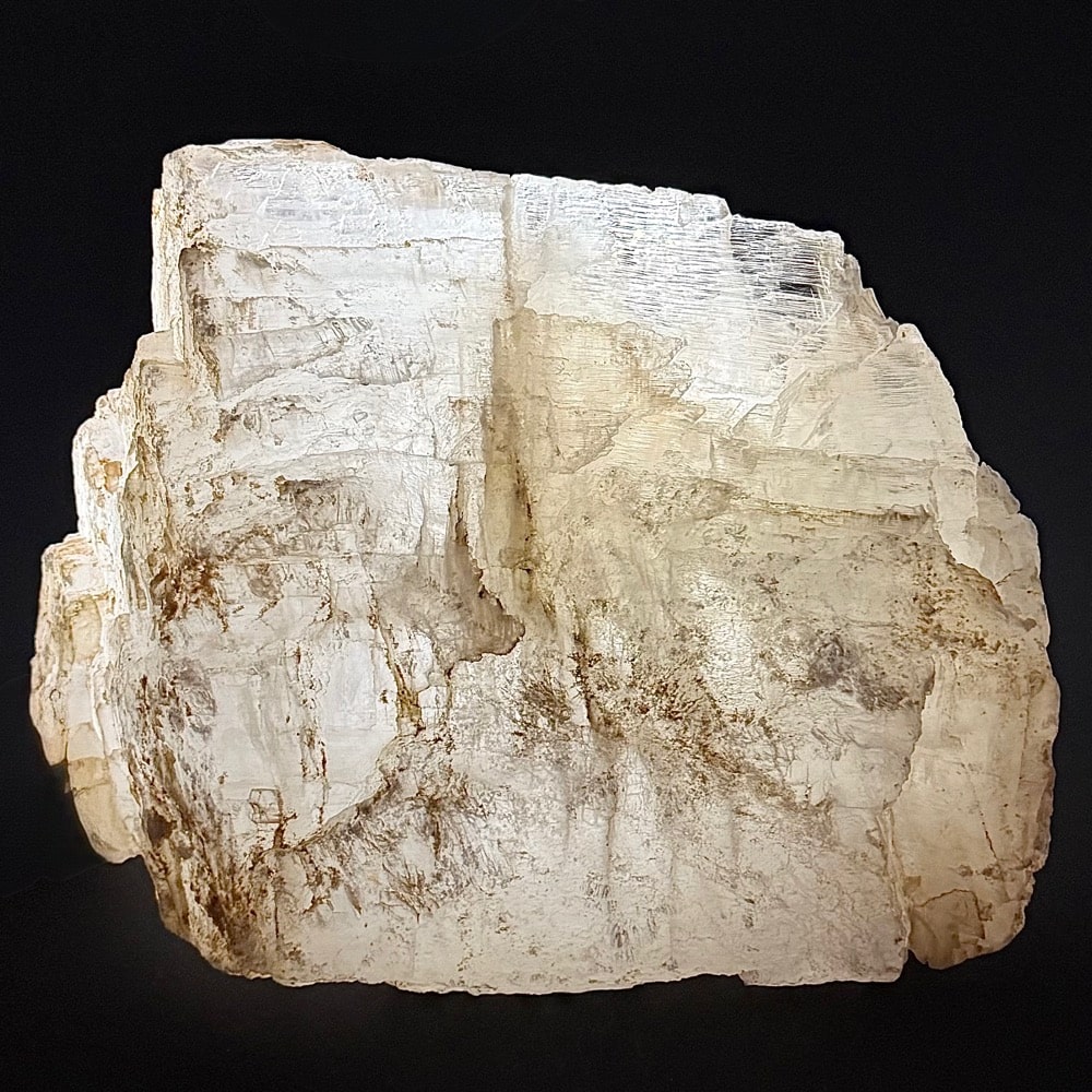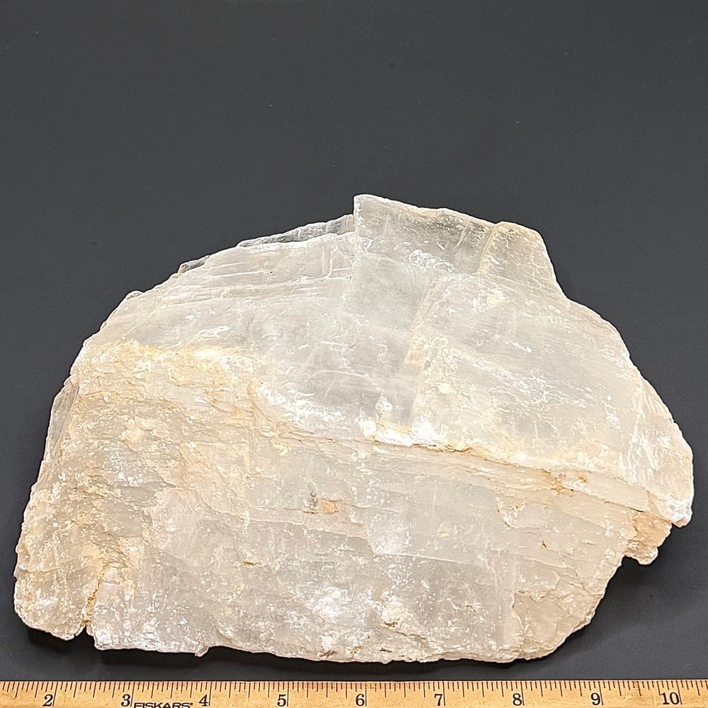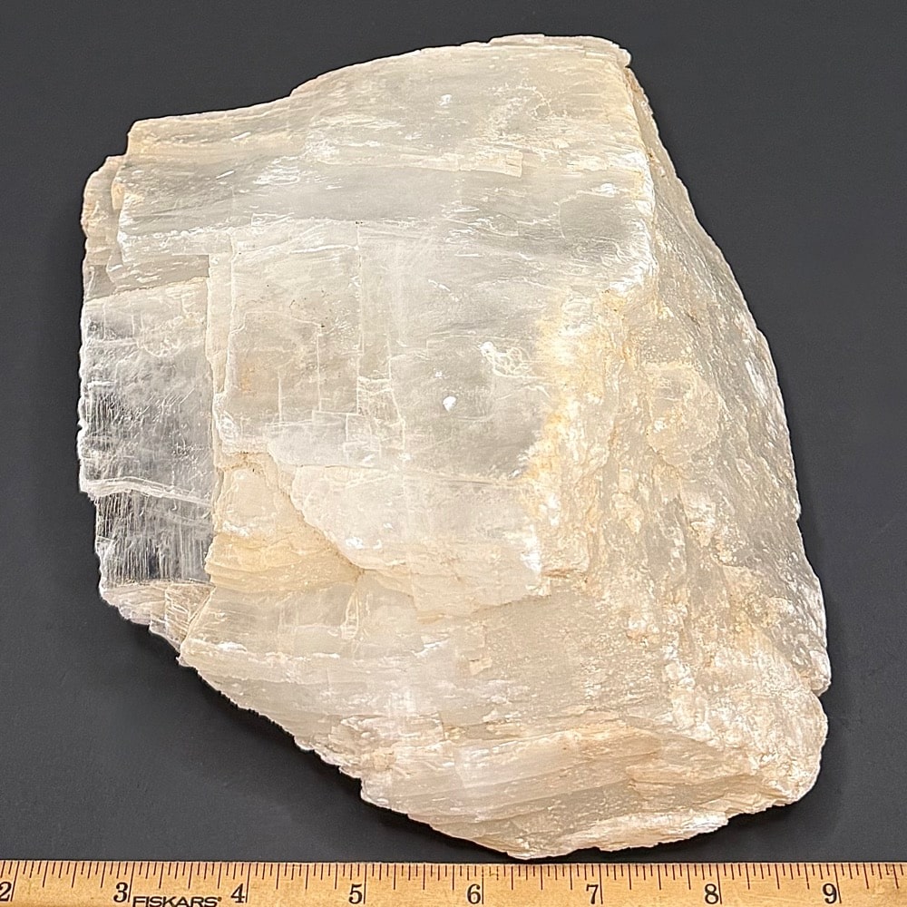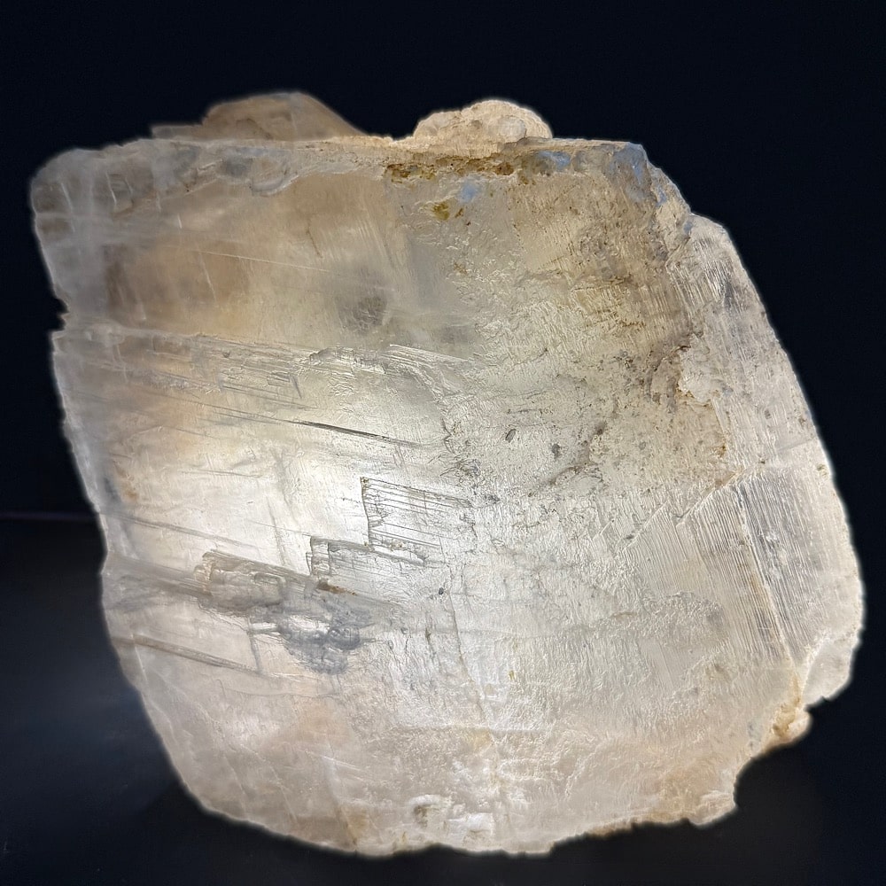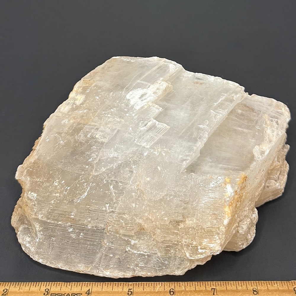 Selenite is a Crystalline variety of Gypsum. It is often transparent and colorless. If the Selenite Crystals show translucency, opacity and/or color, it is caused by the presence of other minerals, and many be “druzy”. Selenite often appears to have a “cat’s eye” appearance especially with the polished variety. It will often magnify images when the translucency is very clear.