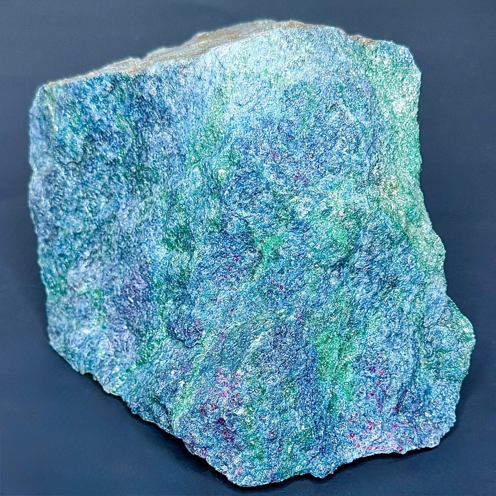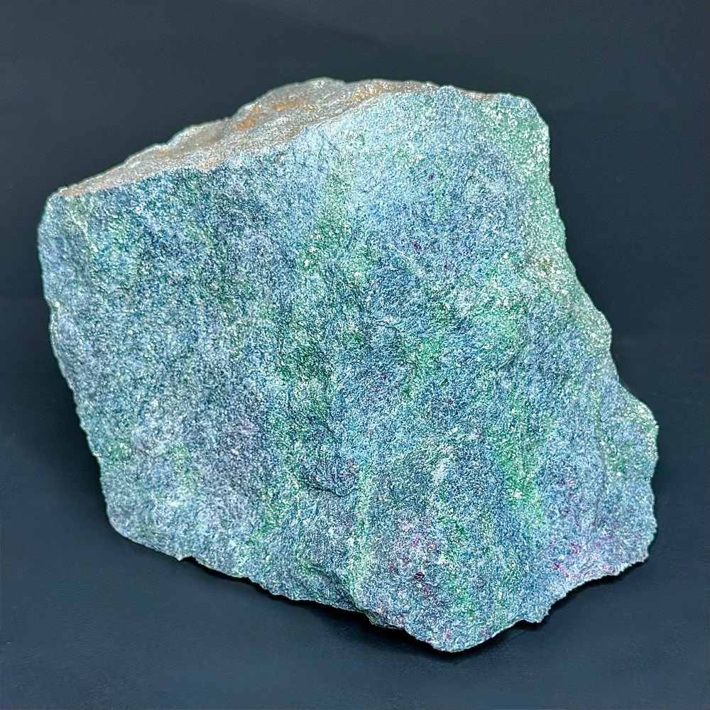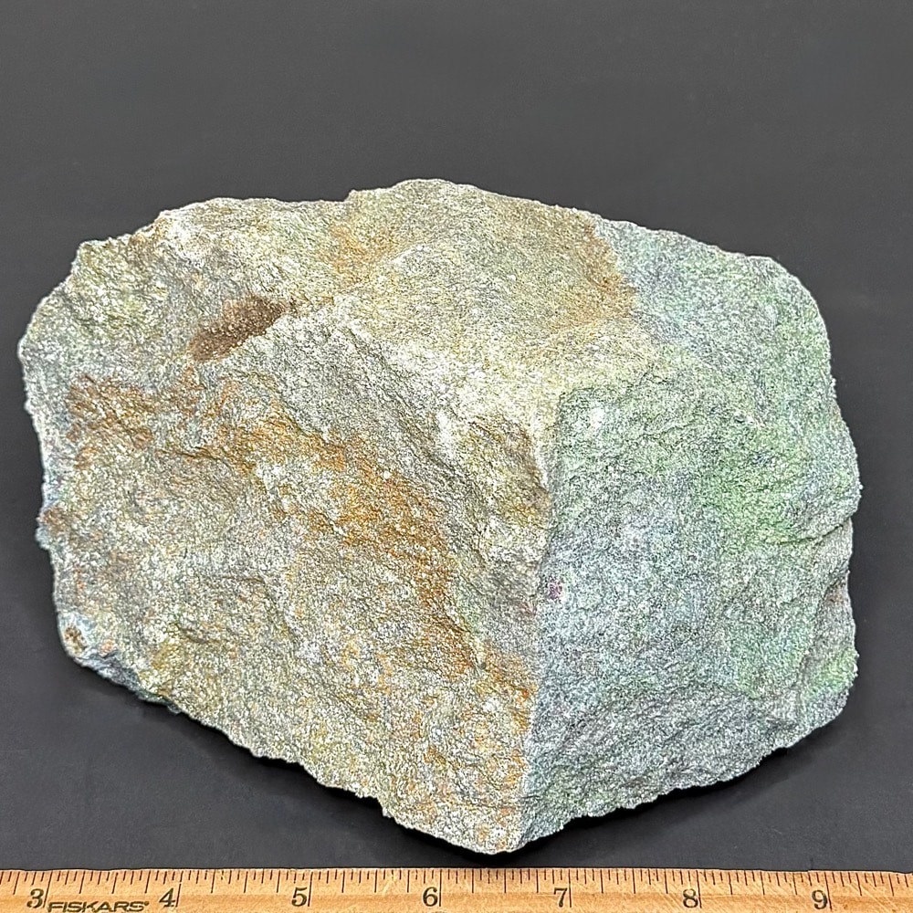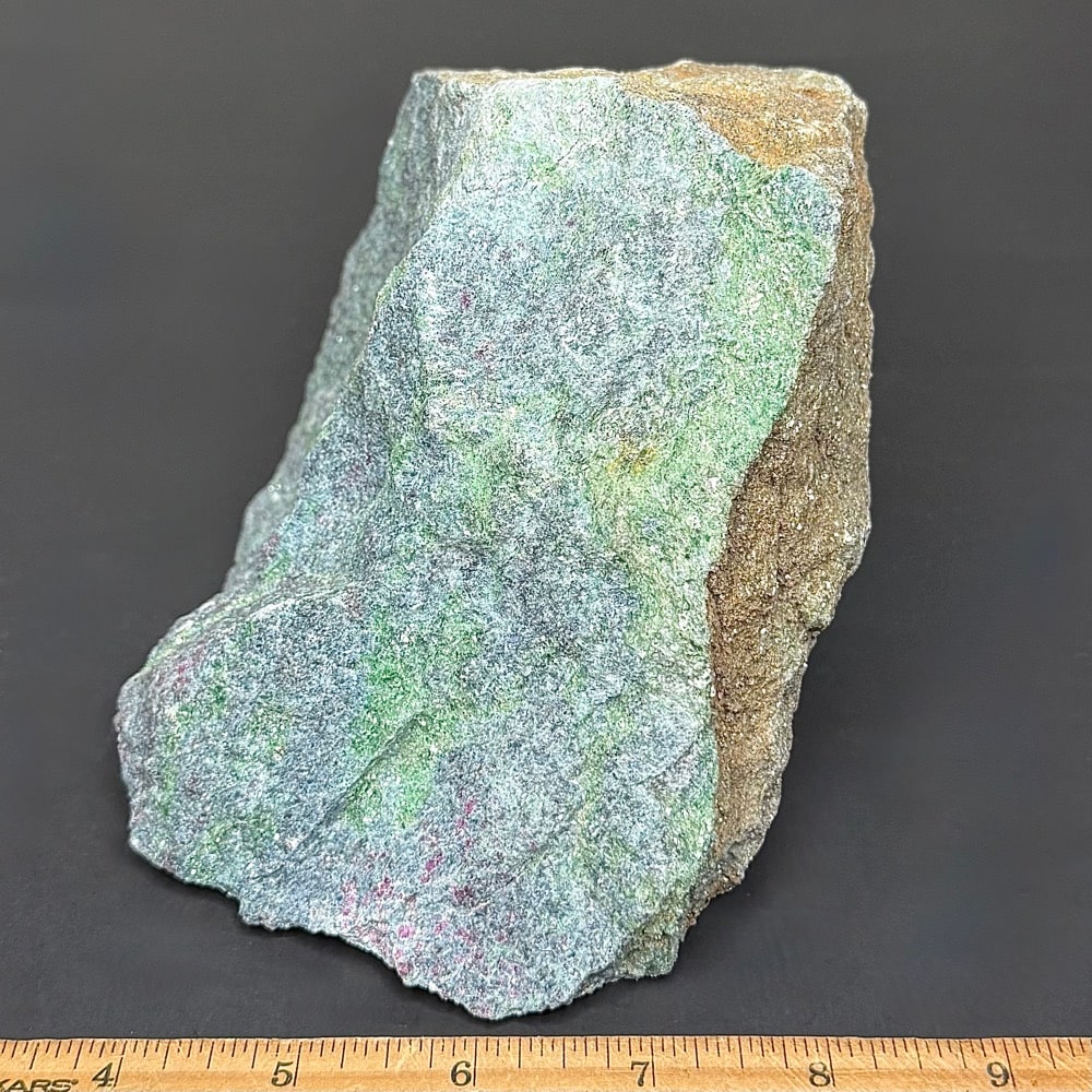 Fuchsite is a green variety of Muscovite Mica. It differs from most other Muscovite by having a variable amount of trivalent Chromium substituting for Aluminum within the mineral. Chromium is the source of Fuchsite’s green color. It sometimes has Ruby Crystals which are completely opaque and unsuitable as gemstones but are well colored and contrast strikingly against the green matrix of the Fuchsite.