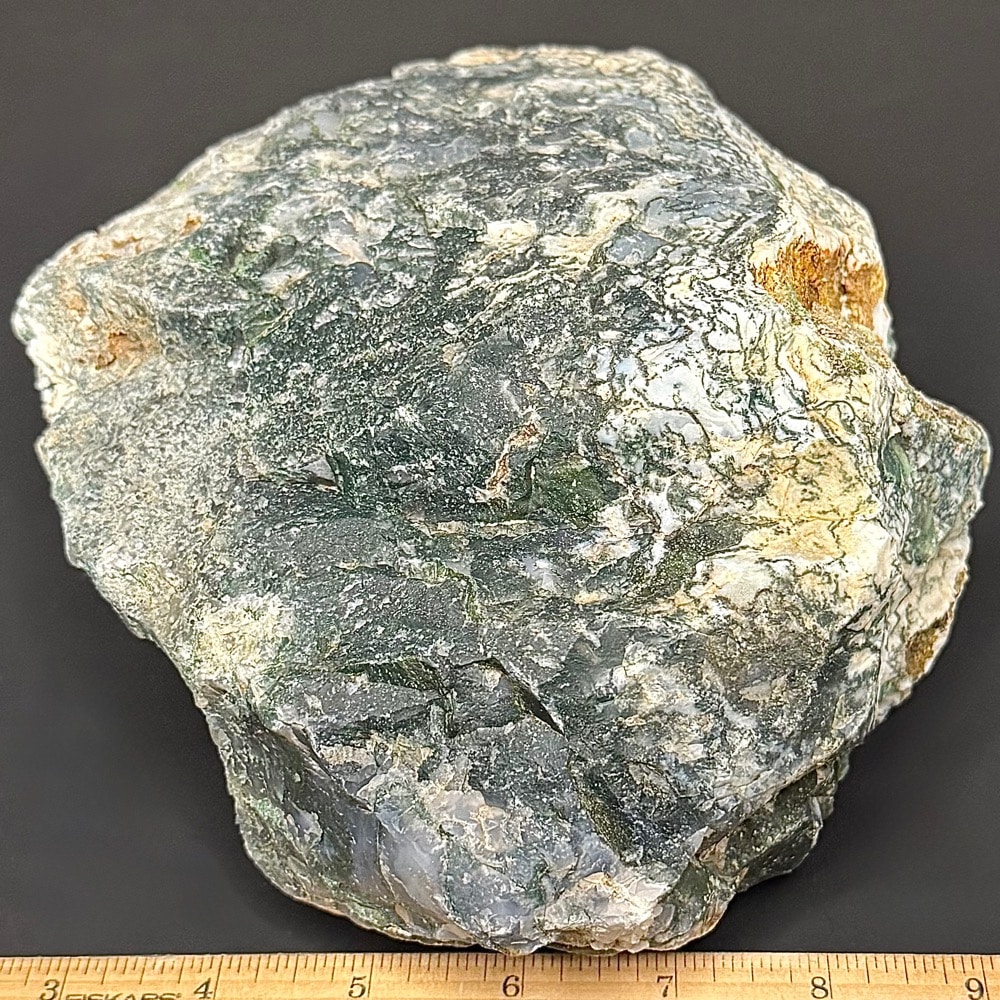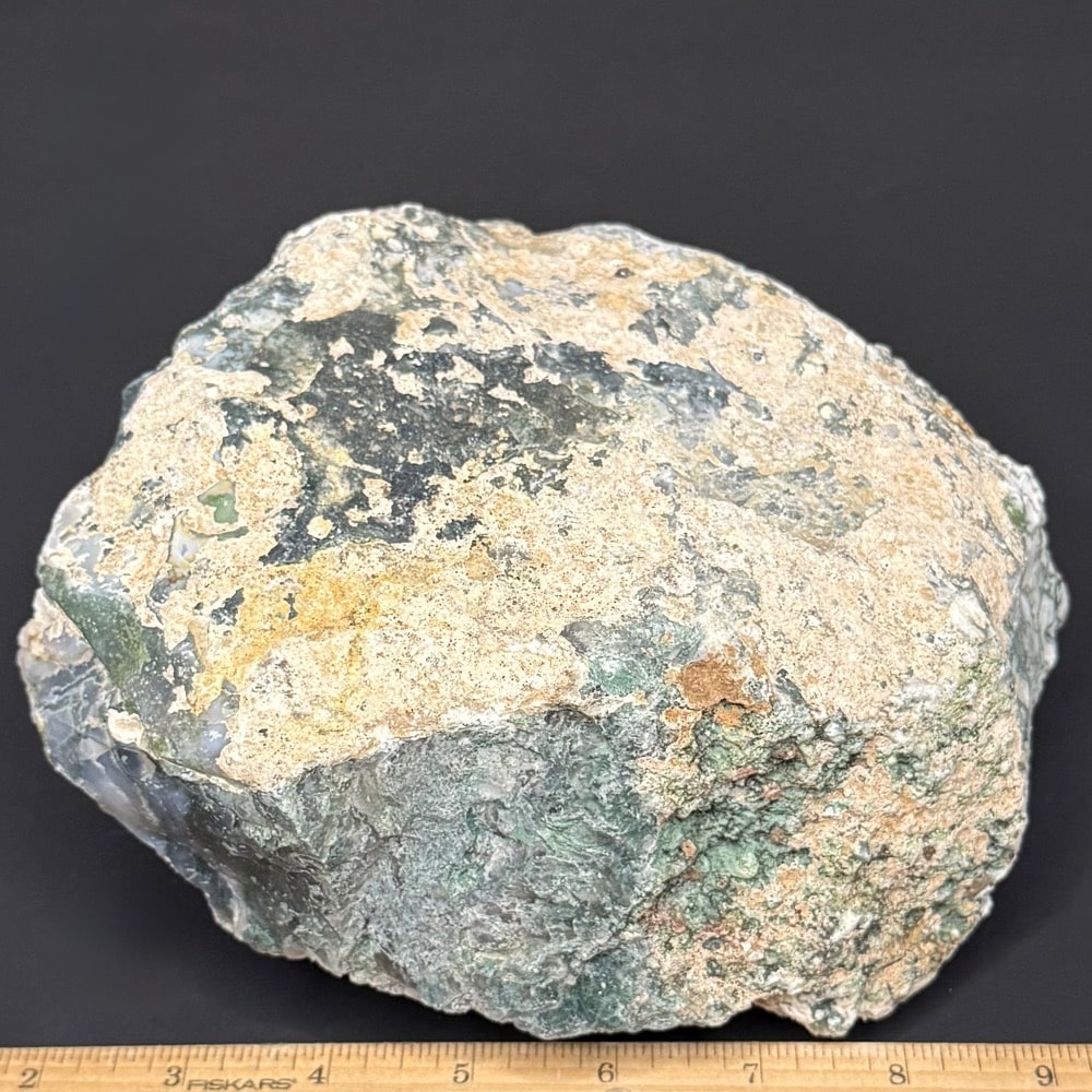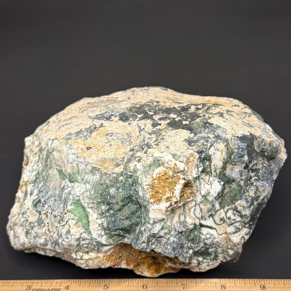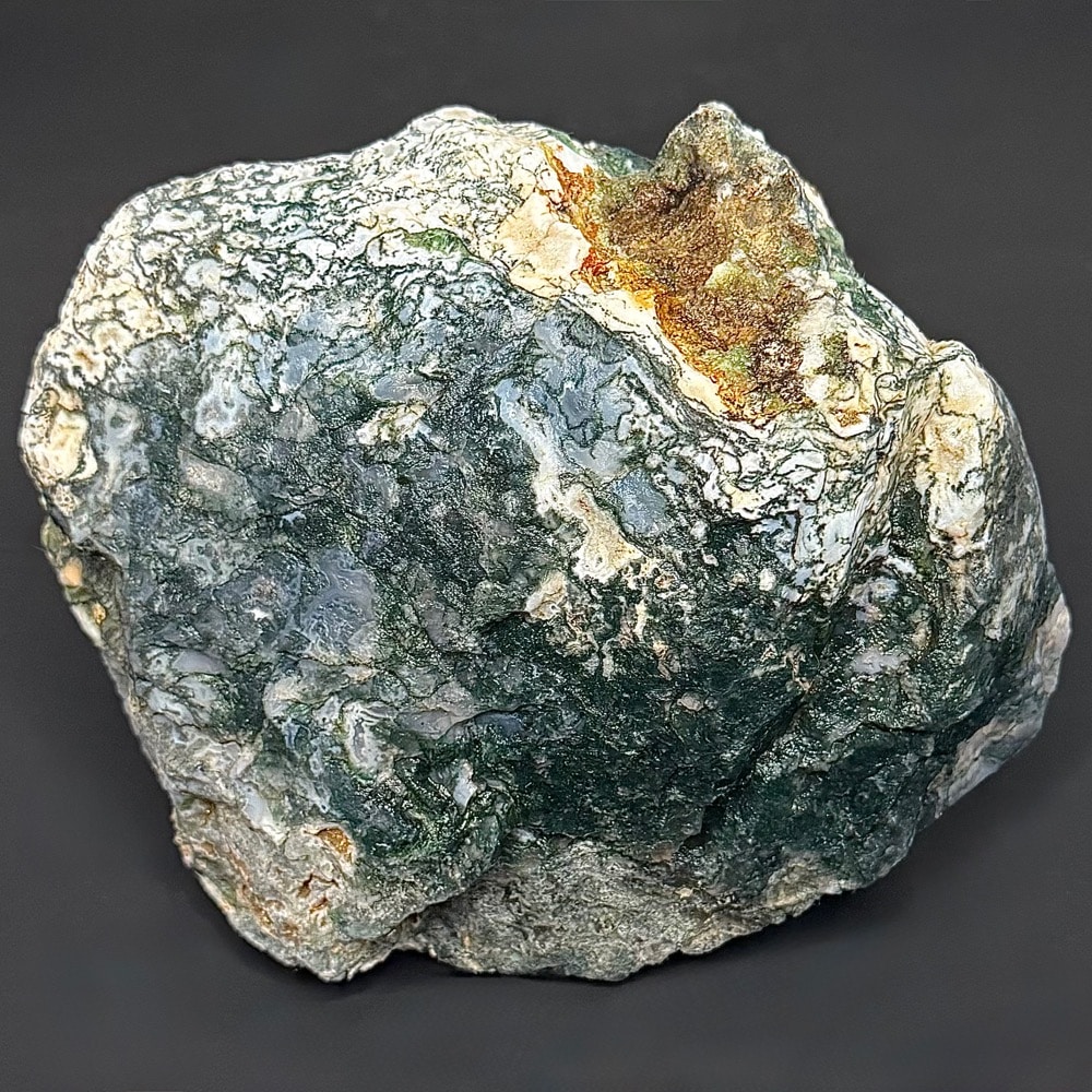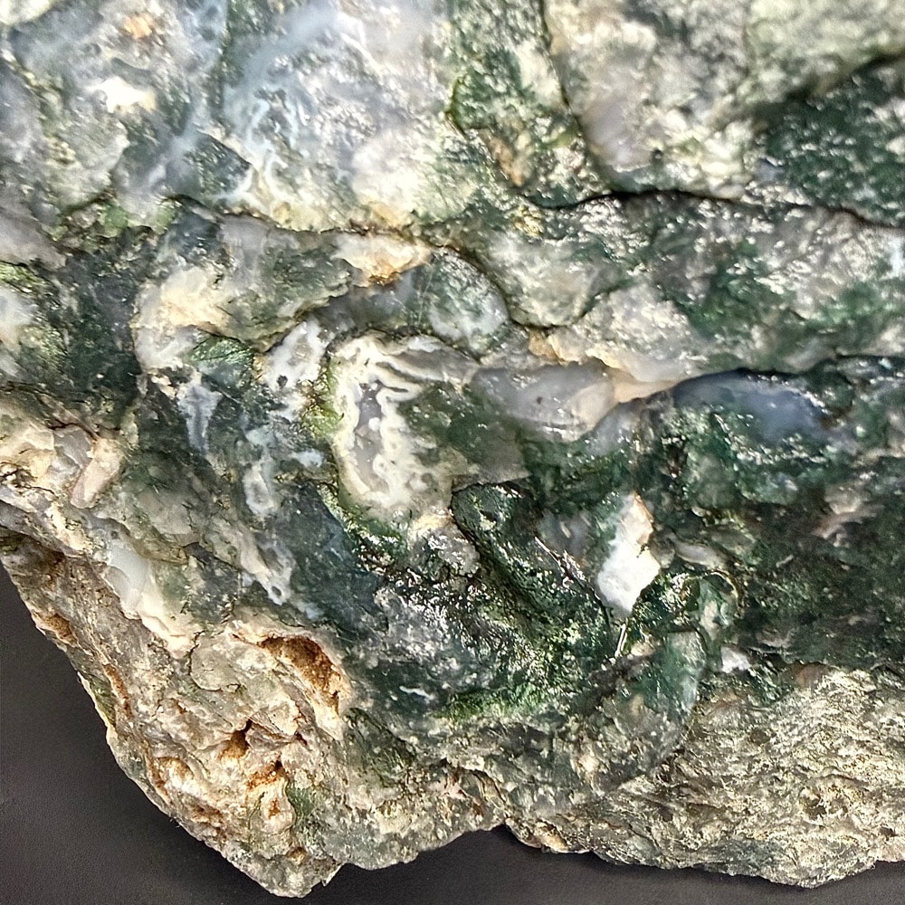 Moss agate is a semi-precious gemstone formed from silicon dioxide. It is a form of chalcedony which includes minerals of a green color embedded in the stone, forming filaments and other patterns suggestive of moss. The stone gets its name from the green specks in it, all of which resemble elements of nature.