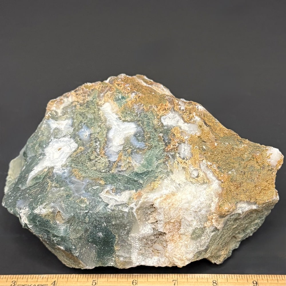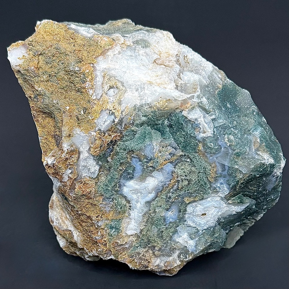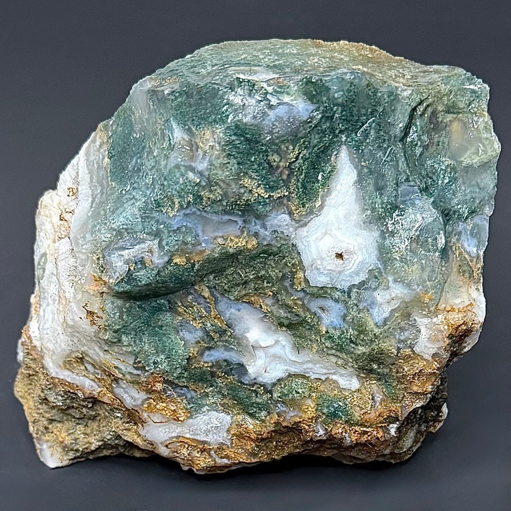 Moss agate is a semi-precious gemstone formed from silicon dioxide. It is a form of chalcedony which includes minerals of a green color embedded in the stone, forming filaments and other patterns suggestive of moss. The stone gets its name from the green specks in it, all of which resemble elements of nature.