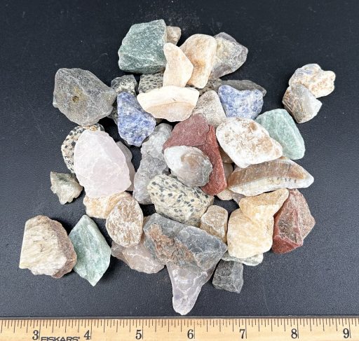 A new mix here at the Rock Shed. This mix contains a wide variety of stones at a reasonable price but be forewarned that these are also a wide variety of hardnesses. It will make this mix more challenging to tumble, or you can separate it before you tumble. The mix may include Rose Quartz, Zebra Jasper, Aventurine, White Quartz, Agate and others (Those are the hard ones). It also may include Fluorite, Onyx, Orange Calcite, Sodalite and Fuschite (Those are the softer ones). This material comes in sizes from 3/8″ to 1″. It will also make a nice rock for fountains or other decorative uses.