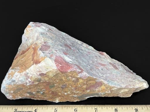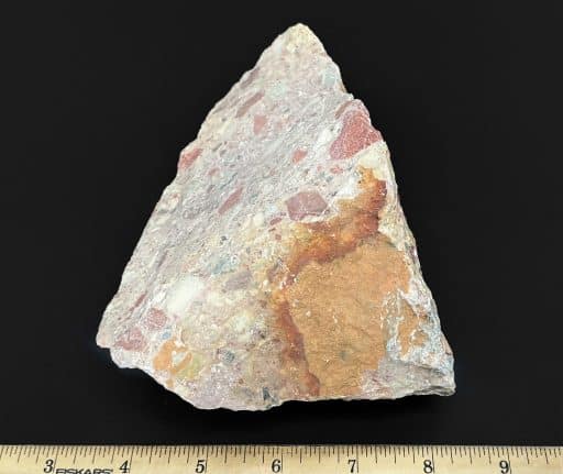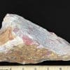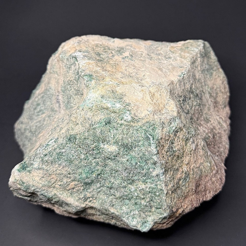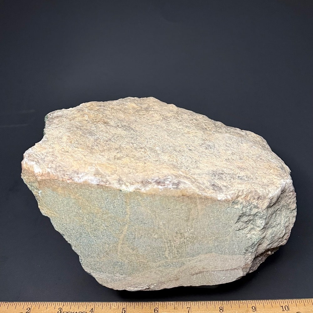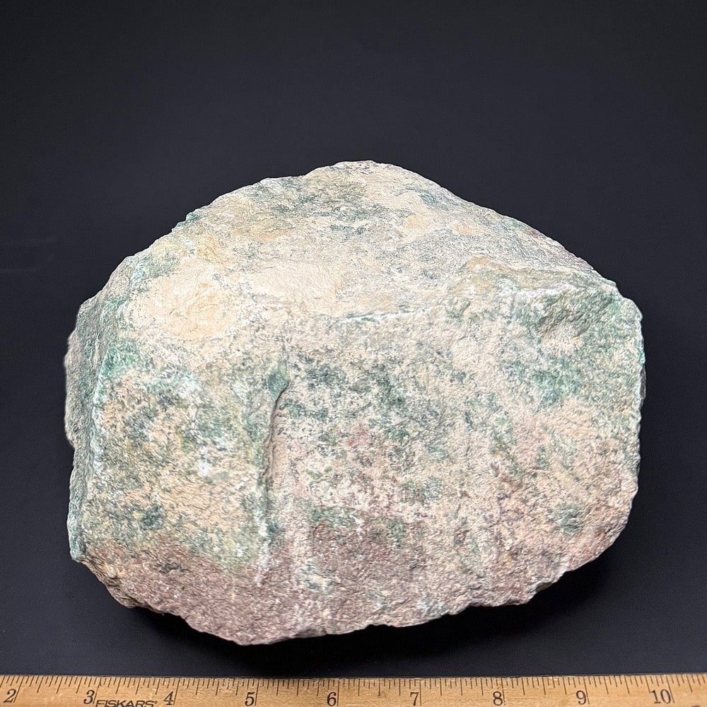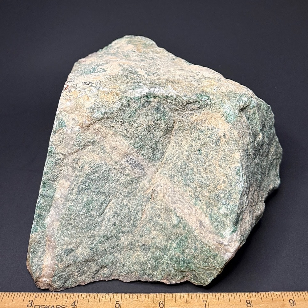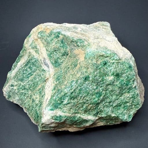 Fuchsite is a green variety of Muscovite Mica. It differs from most other Muscovite by having a variable amount of trivalent Chromium substituting for Aluminum within the mineral. Chromium is the source of Fuchsite’s green color. It sometimes has Ruby Crystals which are completely opaque and unsuitable as gemstones but are well colored and contrast strikingly against the green matrix of the Fuchsite.